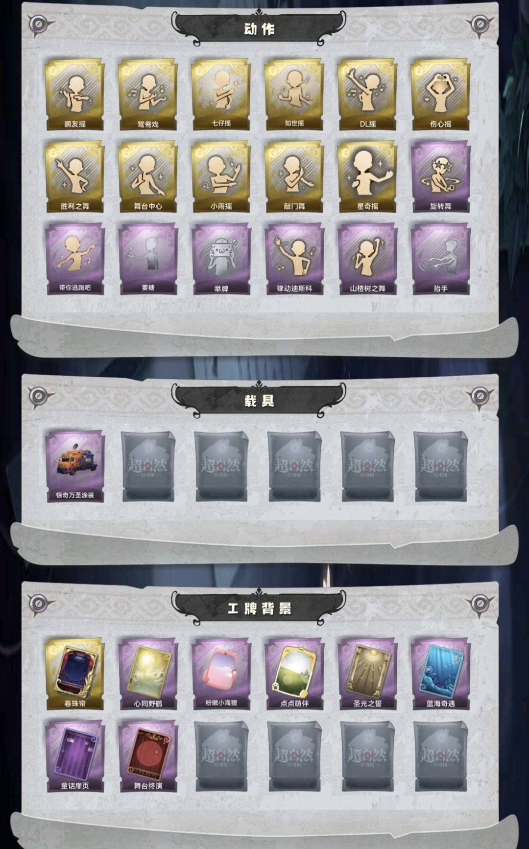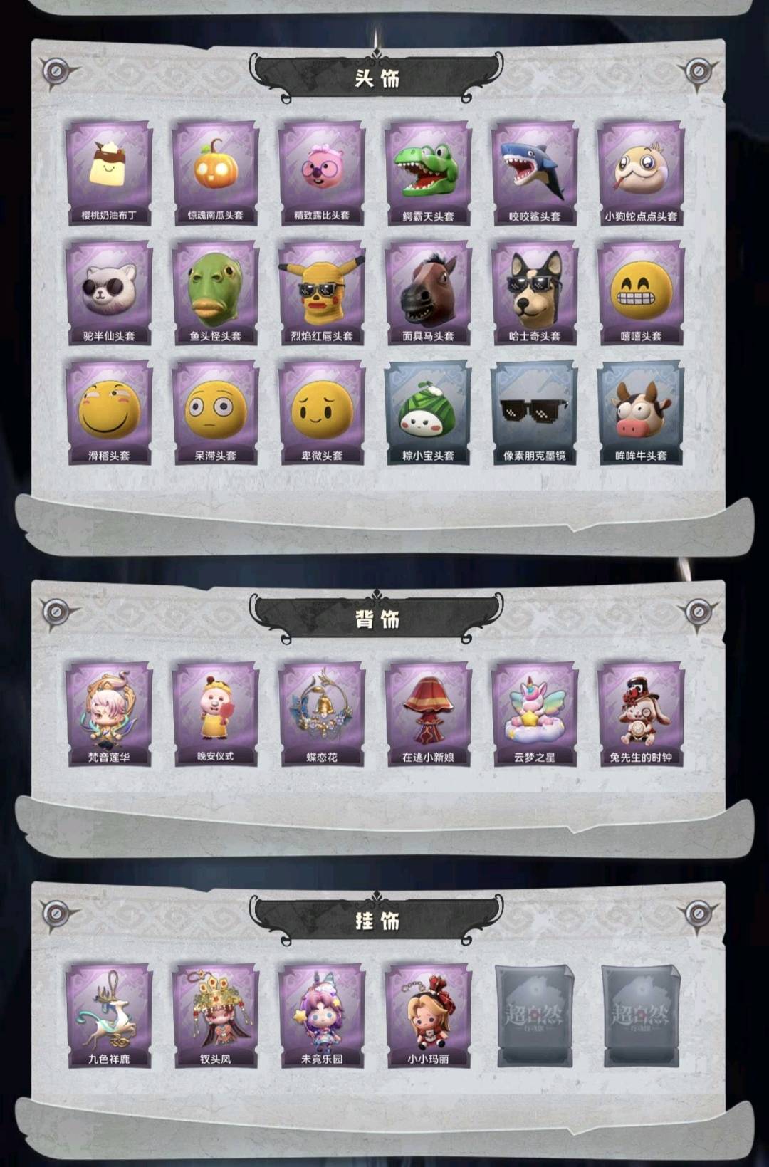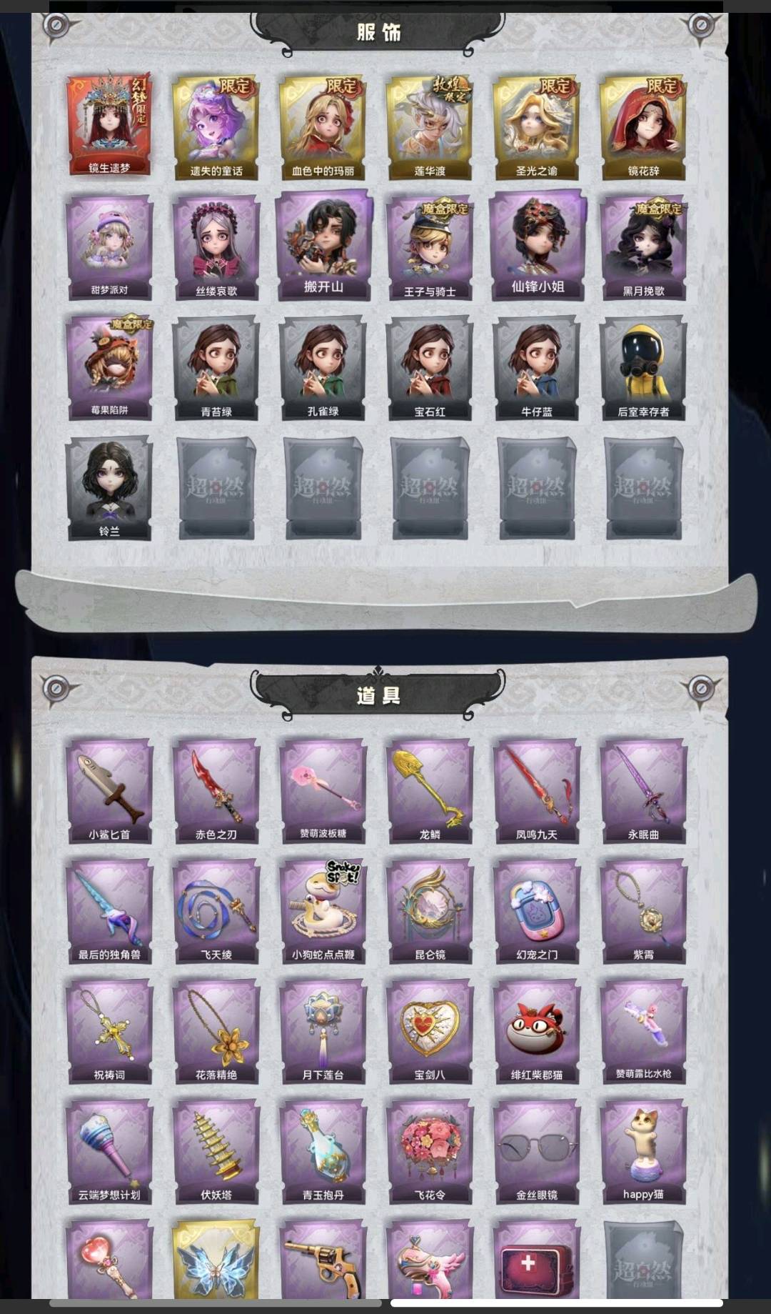 幻梦1;金皮5;紫皮7;道具29;累充3896元;金砖;铲铲币万;皮肤:巫铃儿-镜生遗梦,小黄-遗失的童话,爱丽丝-血色中的玛丽,逍遥-莲华渡,薇薇安-圣光之谕,巫铃儿-镜花辞,爱丽丝-甜梦派对,爱丽丝-丝缕哀歌,零-搬开山,阿念-王子与骑士,薇薇安-仙锋小姐,薇薇安-黑月挽歌,莉莉-莓果陷阱;道具:刺刀-小鲨匕首,刺刀-赤色之刃,铲子-赞萌波板糖,铲子-龙鳞,桃木剑-凤鸣九天,桃木剑-永眠曲,桃木剑-最后的独角兽,长鞭-飞天绫,长鞭-小狗蛇点点鞭,传送按钮-昆仑镜,传送按钮-幻宠之门,摸金符-紫霄,摸金符-祝祷词,摸金符-花落精绝,腰包-月下莲台,腰包-宝剑八,腰包-绯红柴郡猫,短管猎枪-赞萌露比水枪,专业手电-云端梦想计划,葫芦-伏妖塔,黄牛能量饮料-青玉抱丹,额外的背包-飞花令,夜视仪-金丝眼镜,音响-happy猫,荧光棒-桃心-荧光棒-桃心,喷气背包-晶澜灵翼,转轮手枪-新星时代,电击枪-甜蜜泡泡枪,急救包-蔷薇物语;饰品:头饰-樱桃奶油布丁,头饰-惊魂南瓜头套,头饰-精致露比头套,头饰-鳄霸天头套,头饰-咬咬鲨头套,头饰-小狗蛇点点头套,头饰-驼半仙头套,头饰-鱼头怪头套,头饰-烈焰红唇头套,头饰-面具马头套,头饰-哈士奇头套,头饰-嘻嘻头套,头饰-滑稽头套,头饰-呆滞头套,头饰-卑微头套,头饰-粽小宝头套,头饰-像素朋克墨镜,头饰-哞哞牛头套,背饰-梵音莲华,背饰-晚安仪式,背饰-蝶恋花,背饰-在逃小新娘,背饰-云梦之星,背饰-兔先生的时钟,挂饰-九色祥鹿,挂饰-钗头凤,挂饰-未竟乐园,挂饰-小小玛丽;动作:动作-鹏友摇,动作-鸳鸯戏,动作-七仔摇,动作-知世摇,动作-DL摇,动作-伤心摇,动作-胜利之舞,动作-舞台中心,动作-小雨摇,动作-敲门舞,动作-星奇摇,动作-旋转舞,动作-带你逃跑吧,动作-要糖,动作-举牌,动作-律动迪斯科,动作-山楂树之舞,动作-抬手;载具:载具-惊奇万圣涂装;工牌背景:卷珠帘,心同野鹤,粉嫩小海狸,点点萌伴,圣光之誓,蓝海奇遇,童话扉页,舞台终演;工牌动作:净禅,虔诚之姿,元气剪刀手,盛气凌人;员工:小黄,爱丽丝,零,阿念,逍遥,薇薇安,巫铃儿,莉莉,艾伦,爱德华,兰;段位:超自然传说
