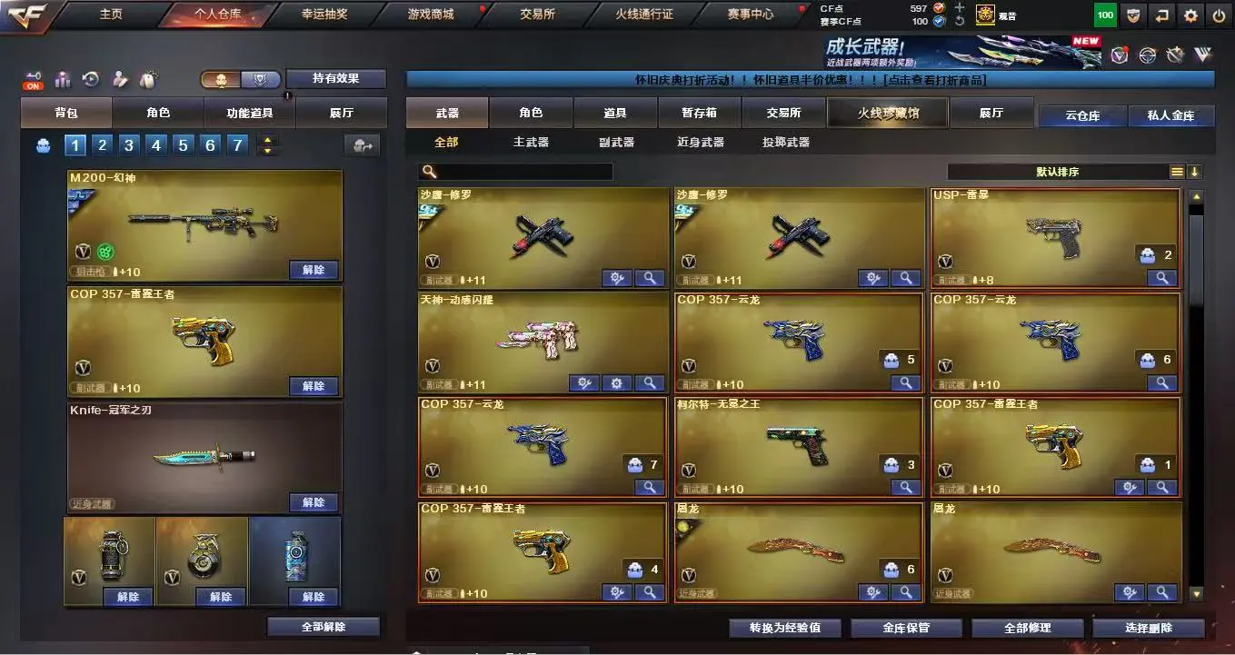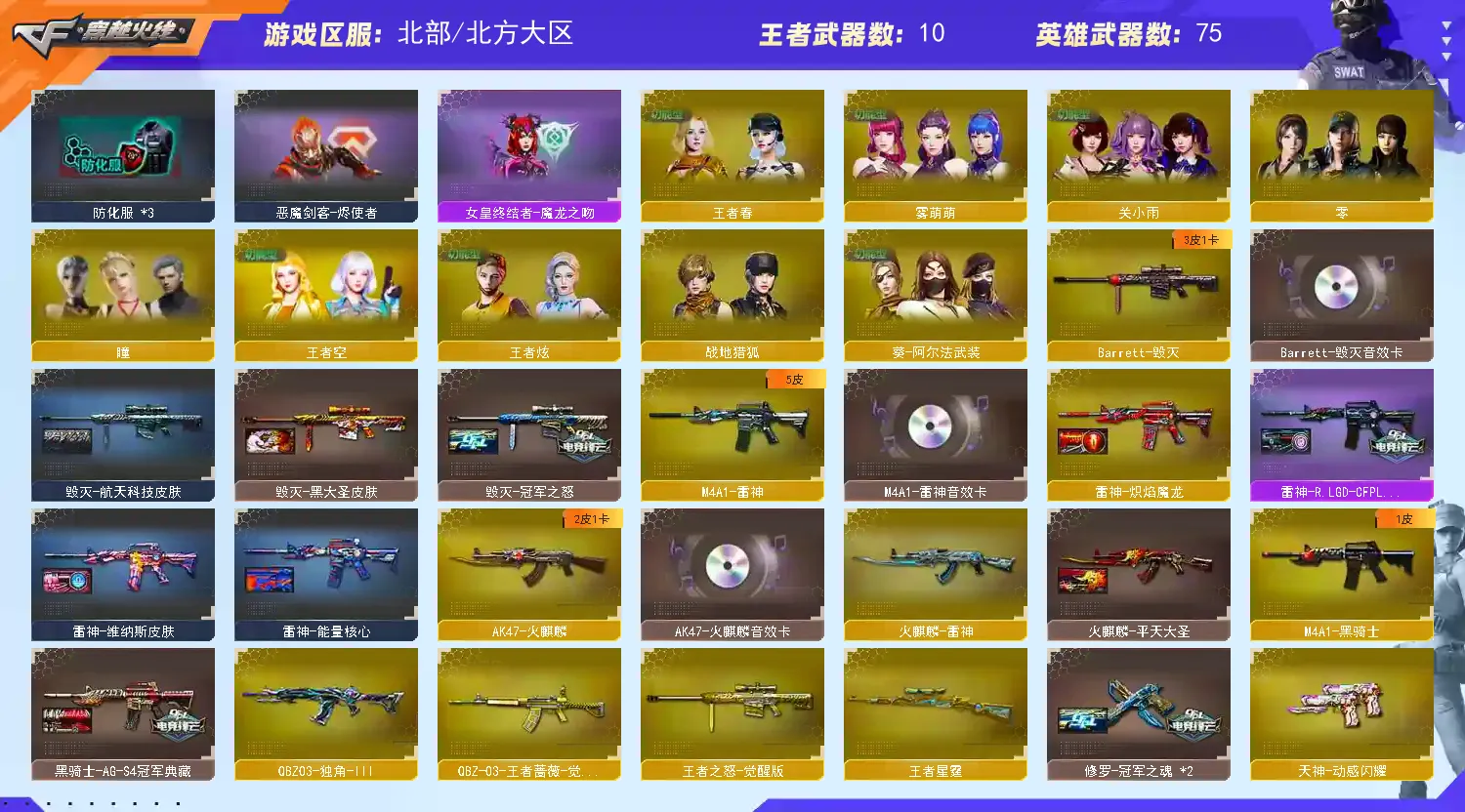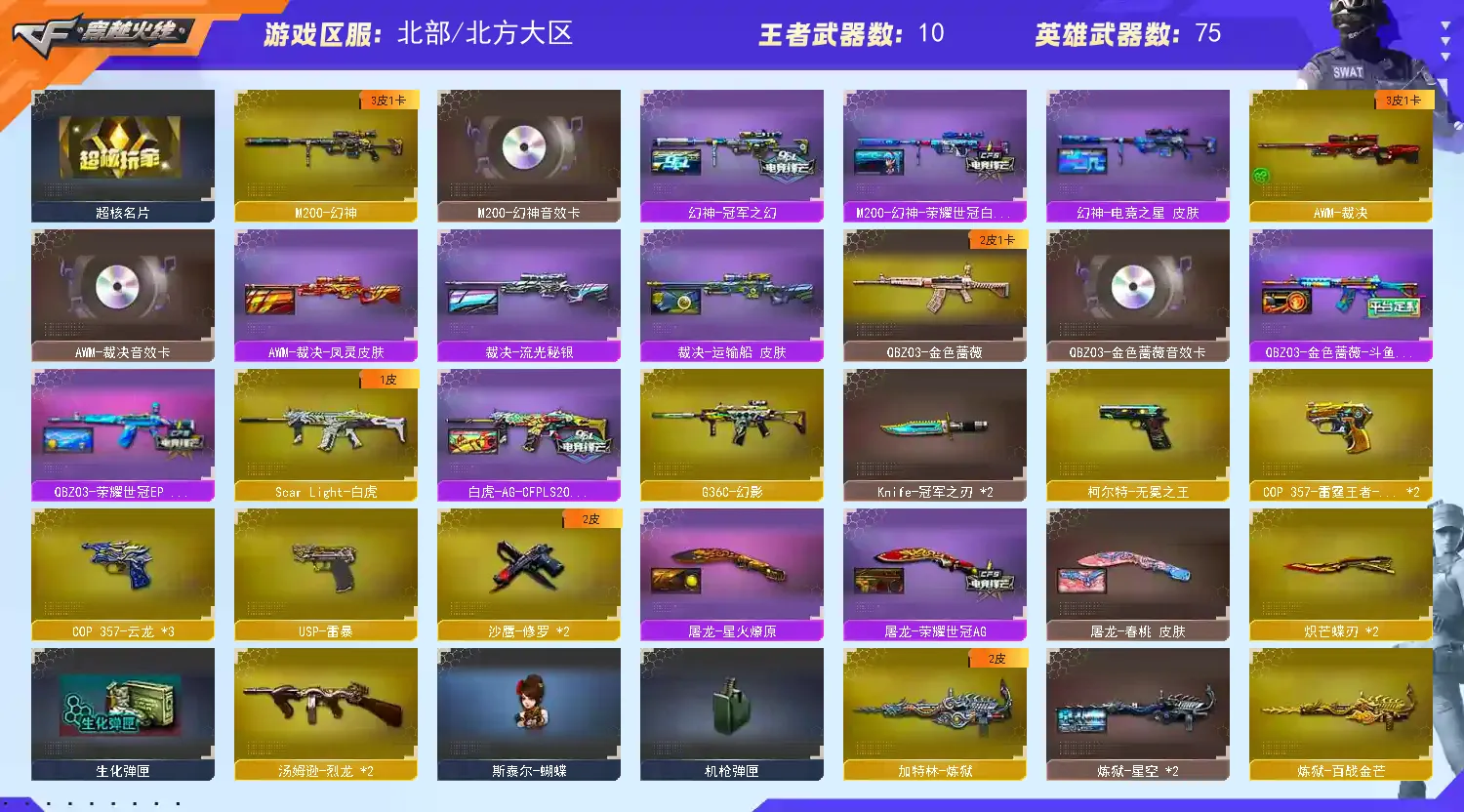 幻神-电竞之星皮-冠军之幻皮-荣耀世冠白鲨皮-音效卡三件套-王者星霆-裁决流光秘银三件套-3把cop云龙-2把cop雷霆王者-usp雷暴-柯尔特无冕之王-qbz金色蔷薇斗鱼皮-ep荣耀世冠皮三件套-白虎agcfpls20皮-g36c幻影-两把蝴蝶刀-两把冠军小刀