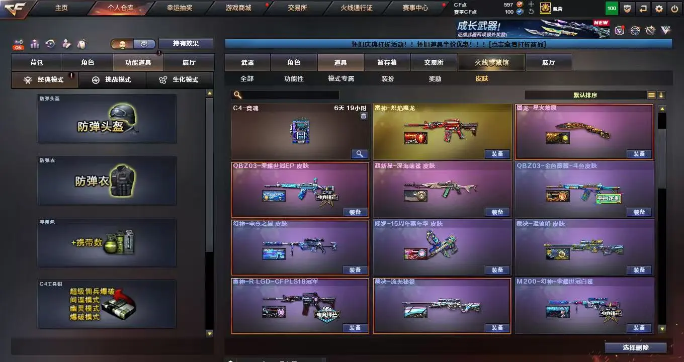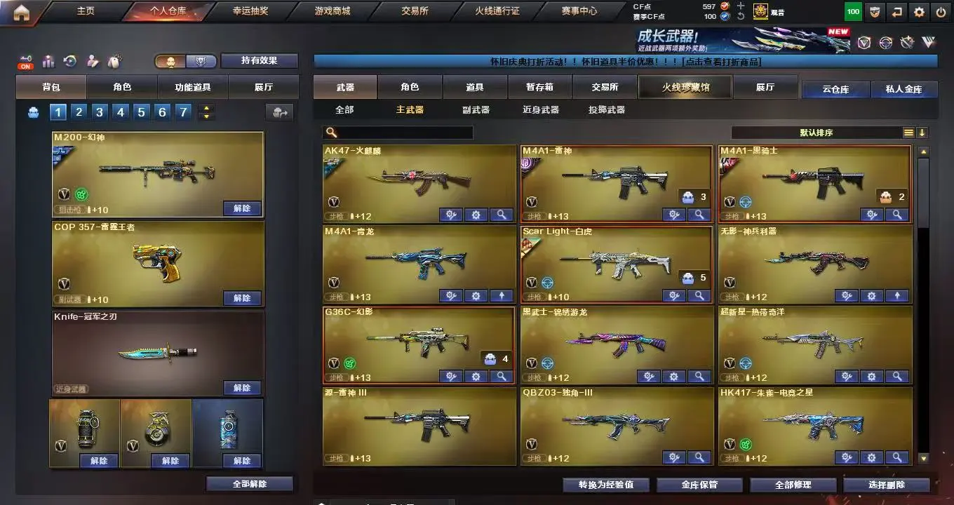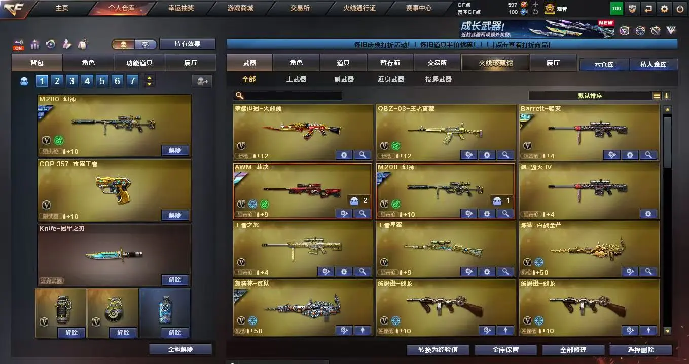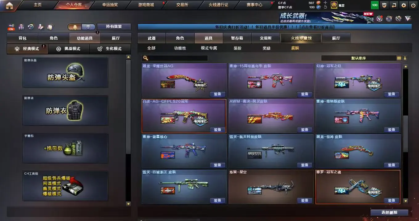 幻神-电竞之星皮-冠军之幻皮-荣耀世冠白鲨皮-音效卡三件套-王者星霆-裁决流光秘银三件套-3把cop云龙-2把cop雷霆王者-usp雷暴-柯尔特无冕之王-qbz金色蔷薇斗鱼皮-ep荣耀世冠皮三件套-白虎agcfpls20皮-g36c幻影-两把蝴蝶刀-两把冠军小刀