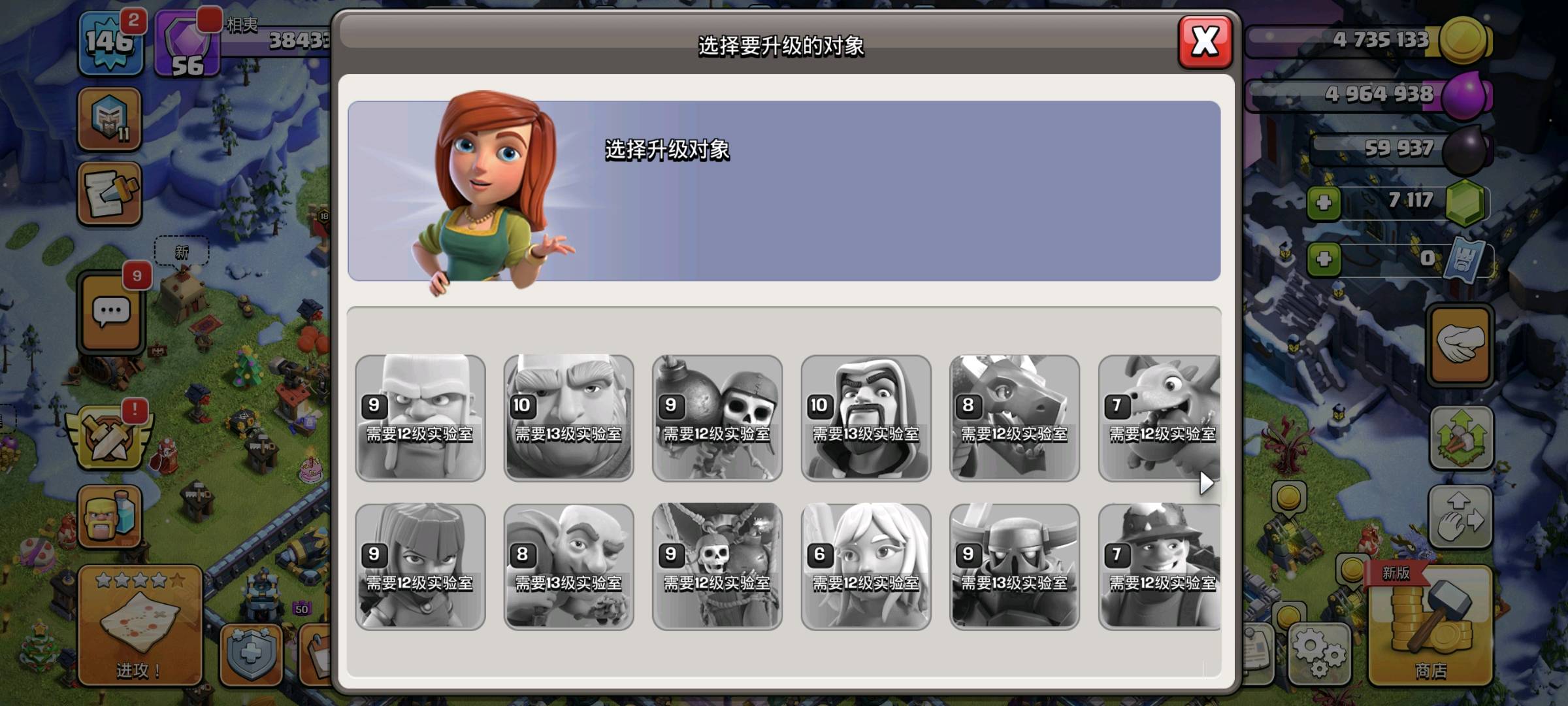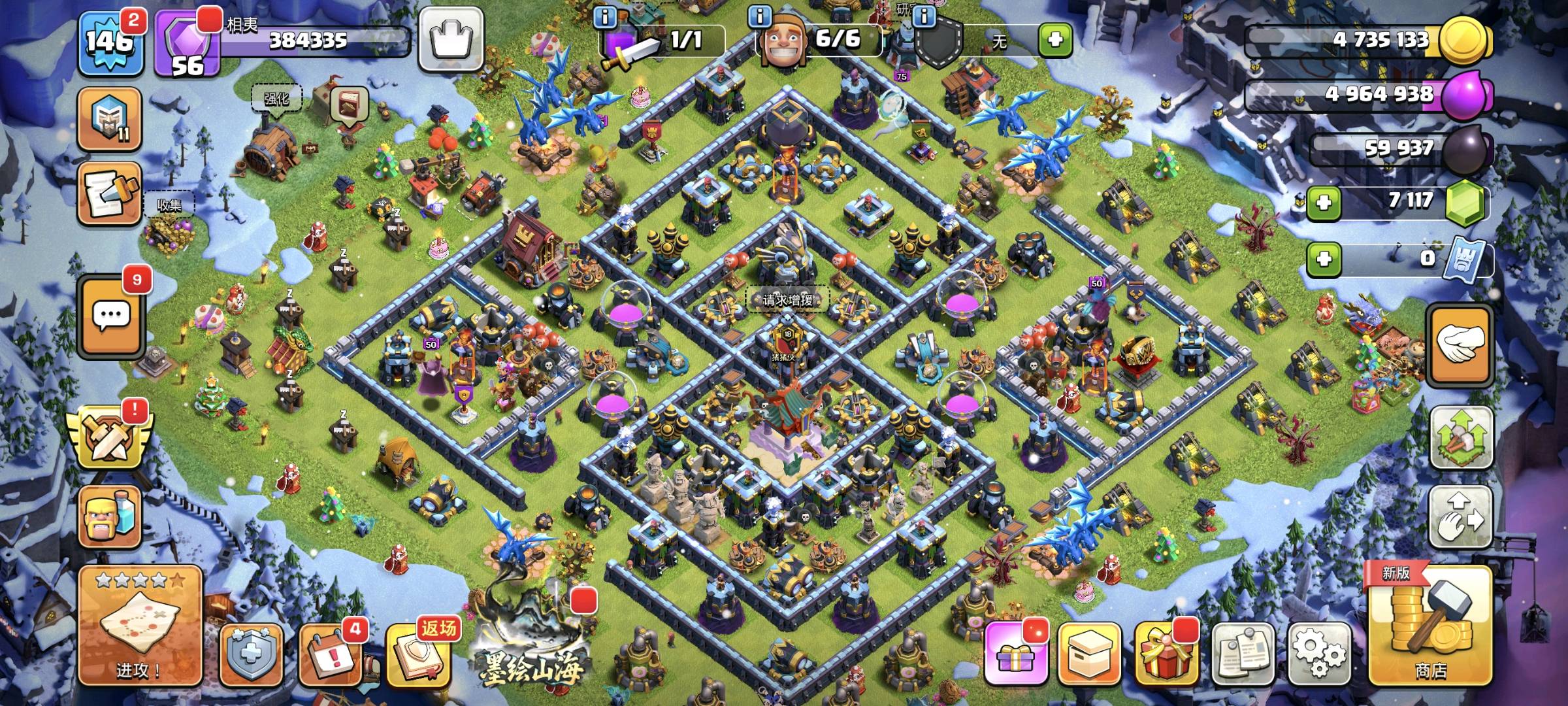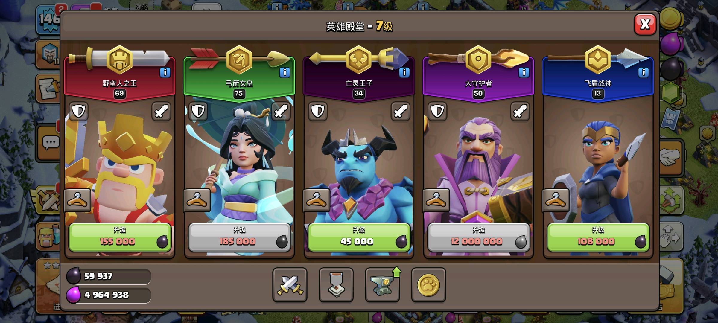 野蛮人之王69级,弓箭女皇75级,亡灵王子34级,大守护者50级,飞盾战神13级,法术跟军队大部分都是13本的满级