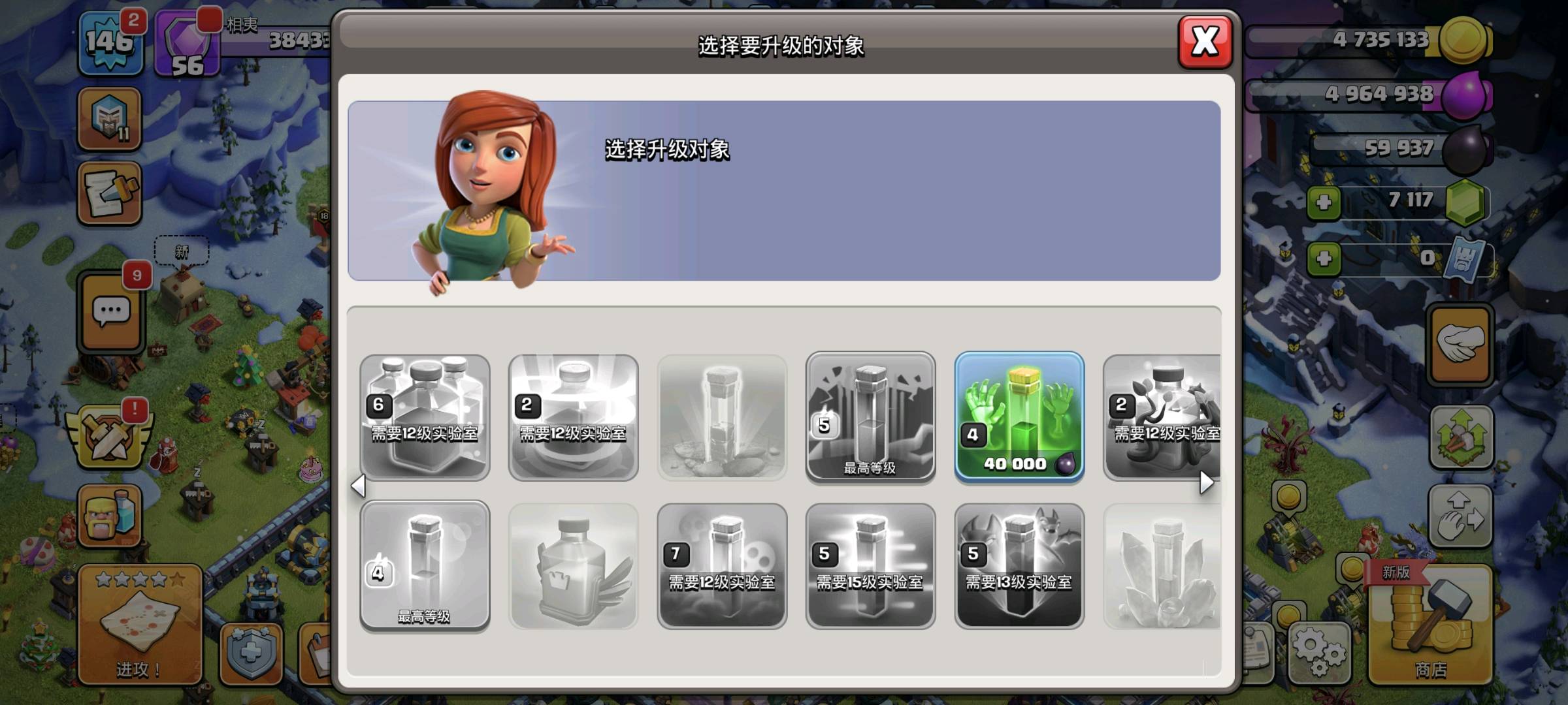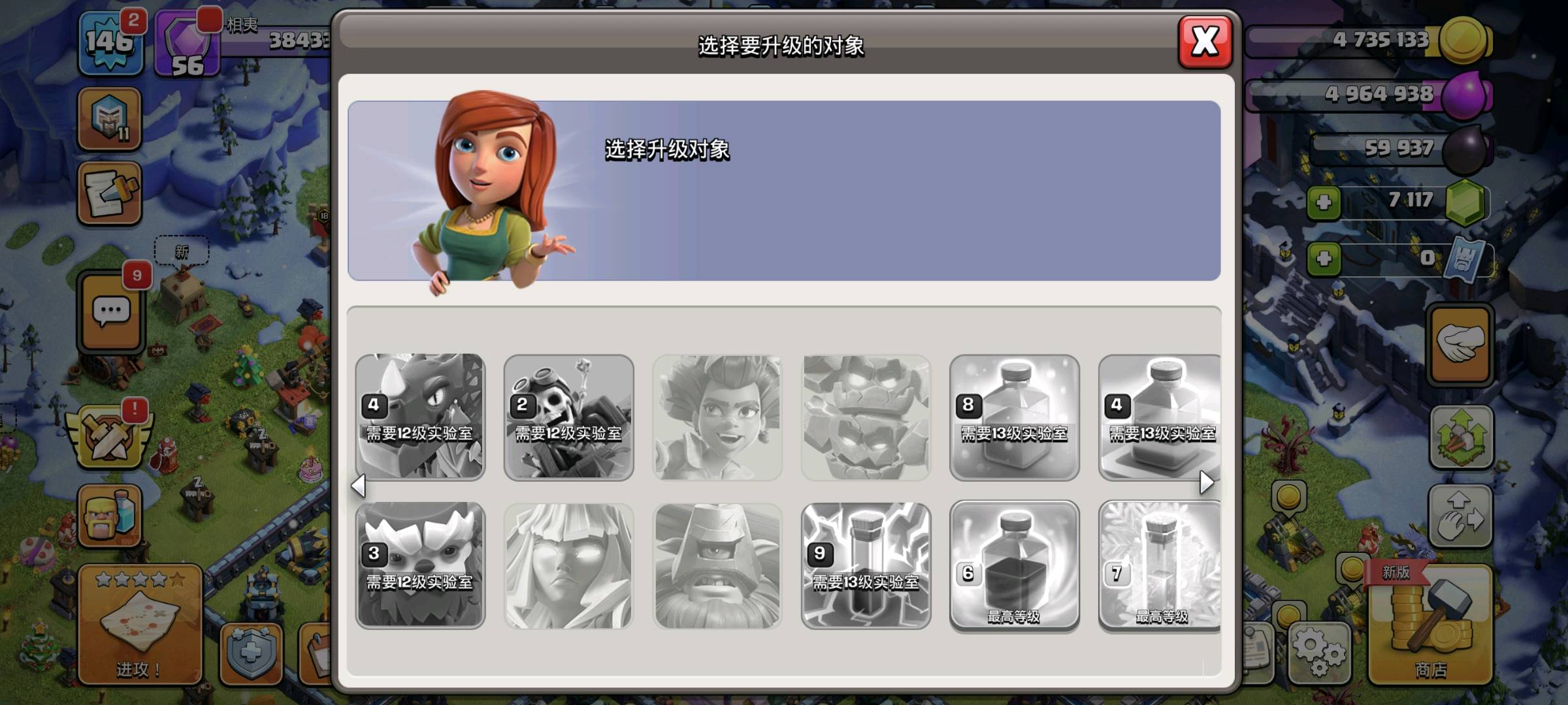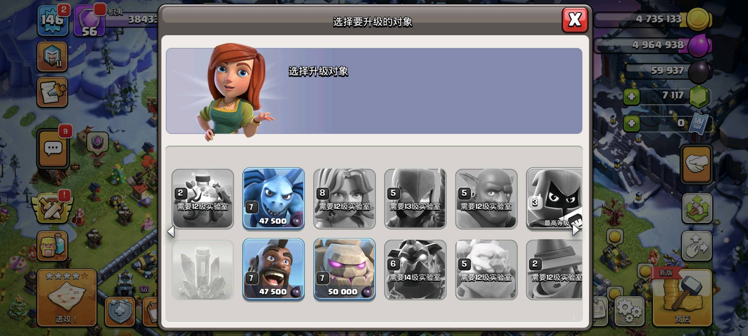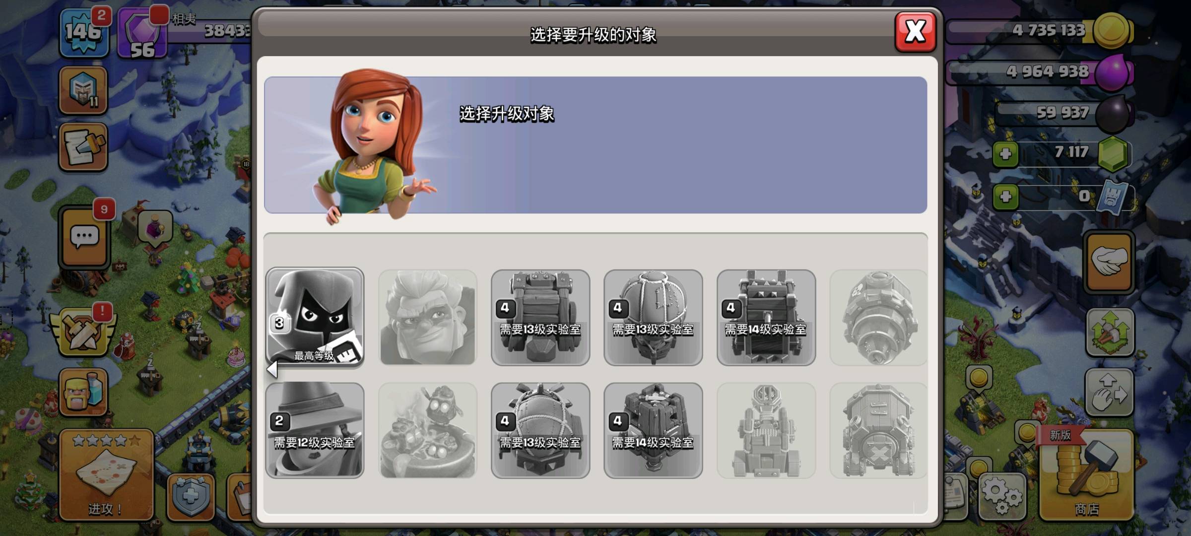 野蛮人之王69级,弓箭女皇75级,亡灵王子34级,大守护者50级,飞盾战神13级,法术跟军队大部分都是13本的满级