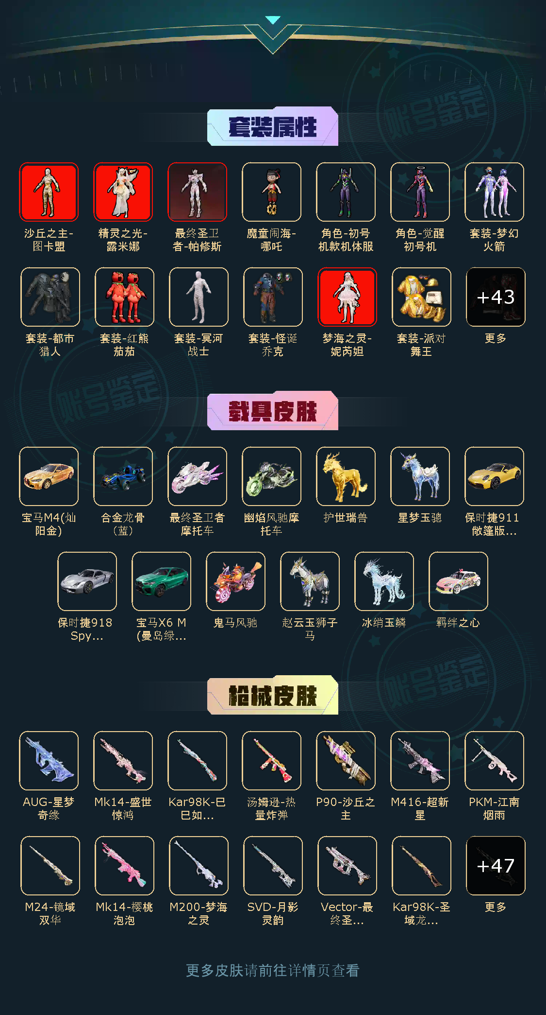 超级王牌51粉,14载具,357套装,25王牌印记,无敌战神历史最高段,268692热力值 平底锅-林间仙鹿/AKM-盖世英雄/AKM-甜心宝贝/SCAR-L-童趣迷兔/AUG-星梦奇缘/M416-风花雪月/GROZA-巴啦啦小魔仙/AKM-幽焰骑士/AUG-南国舞曲/M416-心之恋语/M416-五爪金龙/M416-女娲灵识/AKM-魔法神域/M16A4-垂柳戏鸭/AKM-炫紫旋律/GROZA-精灵之光/M416-墨龙九天/GROZA-焦糖拿铁/SCAR-L-青春物语/M762-冷魅冰骑/AKM-百合蜜语/SCAR-L-金蛇镇世/AUG-超新星/M416-超新星/SCAR-L-万古烈焰/蜜獾-辉耀战甲/SPAS-12-蜜语绒猫/S12K-海渊国主/Mk14-盛世惊鸿/Mk14-闲梦青缨/Mk14-樱桃泡泡/DP-28-圣堂之誓/MG3-洛神天依/PKM-江南烟雨/MG-36-沧焰双生/DP-28-豹影疾电/UZI-绮梦青鸾/Vector-红伞翩翩/P90-能量风暴/UMP45-宇宙意志/AKS-74U-信仰神谕/Vector-环太平洋/汤姆逊-热量炸弹/Vector-最终圣卫者/UMP45-相思残雪/P90-沙丘之主/UMP45-玉魂晶魄/破片手榴弹-热量炸弹/爆炸猎弓-拳皇·狂花道/烟雾弹-猫咪绅士/破片手榴弹-粉粉猫爪/Kar98K-圣域龙灵/Kar98K-巳巳如意/Kar98K-创世·救赎/M24-镜域双华/AMR-炫光之旅/Kar98K-未来歌姬/SVD-月影灵韵/M200-梦海之灵/宝马M4(灿阳金)/保时捷911 敞篷版(极速黄)/宝马X6 M(曼岛绿)/保时捷Taycan 旅行版(冰莓粉)/鬼马风驰/合金龙骨(蓝)/羁绊之心/保时捷918 Spyder(液态银)/冰绡玉鳞/护世瑞兽/星梦玉骢/赵云玉狮子马/照夜玉狮子/最终圣卫者摩托车/幽焰风驰摩托车/