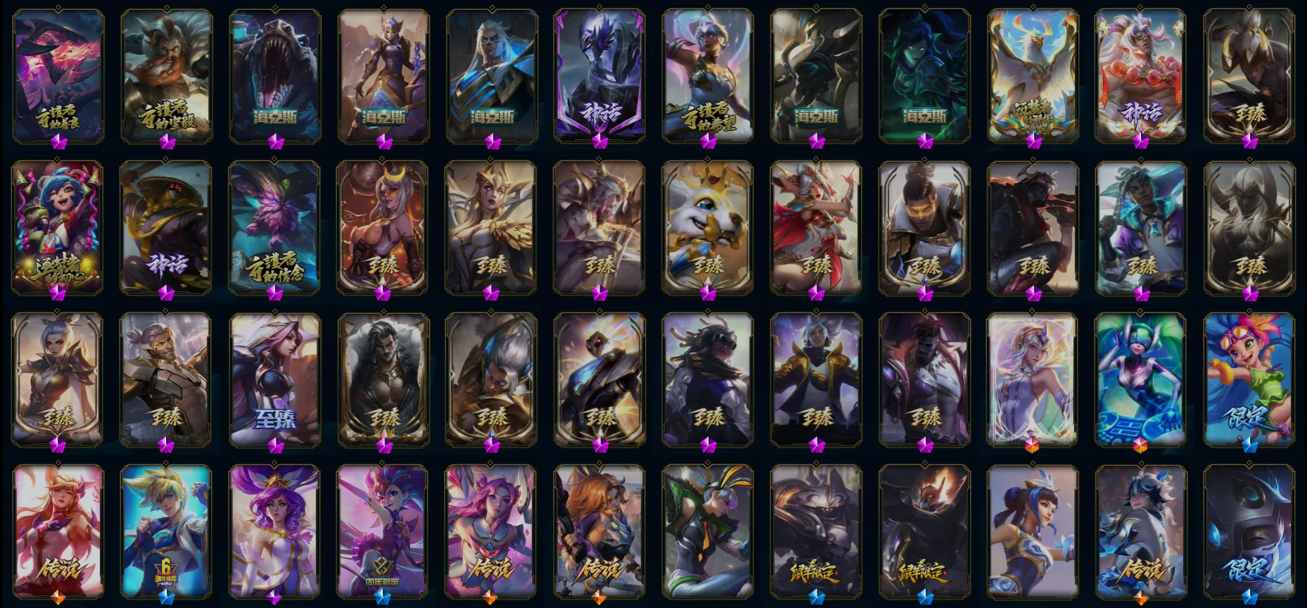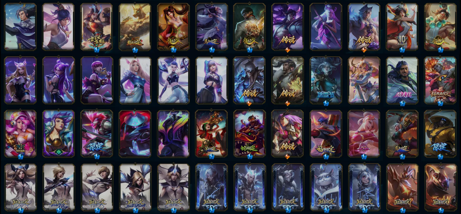 【传说皮肤】鬼魂新娘莫甘娜 符文战熊沃利贝尔 花仙女王卡尔玛 魔女娜美 灵魂莲华锤石 黎明使者索拉卡 幻灵战斗队长厄运小姐 金牌主播德莱文 神龙尊者昼日真龙亚索 星之守护者阿狸 暗星锤石 光明哨兵格雷福斯 源计划净化薇恩 冰霜之刃艾瑞莉娅 青花瓷伊泽瑞尔 未来战士凯特琳 烈焰雄心崔丝塔娜 暗星尊烬 奥德赛凯隐 神龙尊者圣龙李青 双重冰晶艾尼维亚 星之守护者阿卡丽 月蚀骑士蕾欧娜 绅士科加斯 提莫约德尔人的一大步 泳池派对吉格斯 死亡骑士盖伦 黯黑魔龙希瓦娜 神龙尊者夜月幻龙亚索 第三类接触黑默丁格 上古战魂魔腾 神拳李青 黑夜使者亚索 驯龙学者黑默丁格 炼狱魔犬内瑟斯 女警狙击凯特琳 源计划毁灭派克 魔幻卡牌崔斯特 源计划联合艾希 电玩女神娑娜 灵魂莲华瑟提 西部天使艾希 女帝卡特琳娜 邪鸦魅影乐芙兰 地狱之门卫士加里奥 西部天使赛娜 宇航员诺提勒斯 大天使长米迦勒凯尔 耀星女神拉克丝 女皇艾希 苍穹之光韦鲁斯 血石领主弗拉基米尔 地狱行者孙悟空 屠龙勇士潘森 最终BOSS维迦 源计划林易 太空律动猫猫布里和里茨 战斗学院伊泽瑞尔 天煞劫 合金巨兽努努和威朗普 陆地王者4WD布里茨 钢铁军团盖伦 银河魔装机神兰博 黎明使者锐雯 焰尾妖狐阿狸 黎明使者永恩 星之守护者卡莎 星之守护者金克丝 源计划泯灭雷克顿 战场女武神凯尔 西部魔影大小姐蕾欧娜 战地机甲厄加特 冰川巨兽墨菲特 神王德莱厄斯 女主播迦娜 红色男爵库奇 至尊魔女莫甘娜 苹果机器人布里茨 枯萎之壤泽拉斯 约德尔国队长提莫 源计划超体莫德凯撒 至高天派克 星之守护者霞 欧米伽小队幽灵特工 钢铁之翼凯尔 星之守护者拉克丝 恶魔男爵瑞兹 霸天零式赛恩 霸天异形卡兹克 蔷薇绅士杰斯 西部魔影卢锡安 真实伤害艾克 战斗学院凯特琳 丧尸布兰德 黯晶凤凰艾尼维亚 铁哥们儿奥拉夫 灌篮高手德莱厄斯 驯龙炮手崔丝塔娜 女校长菲奥娜 神王盖伦 星之守护者洛 律政大亨蒙多 影执事劫 战地巨兽科加斯
