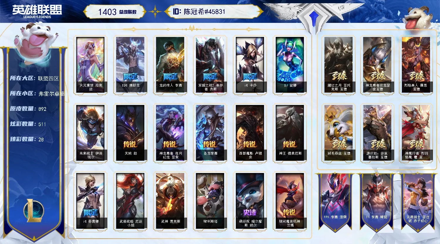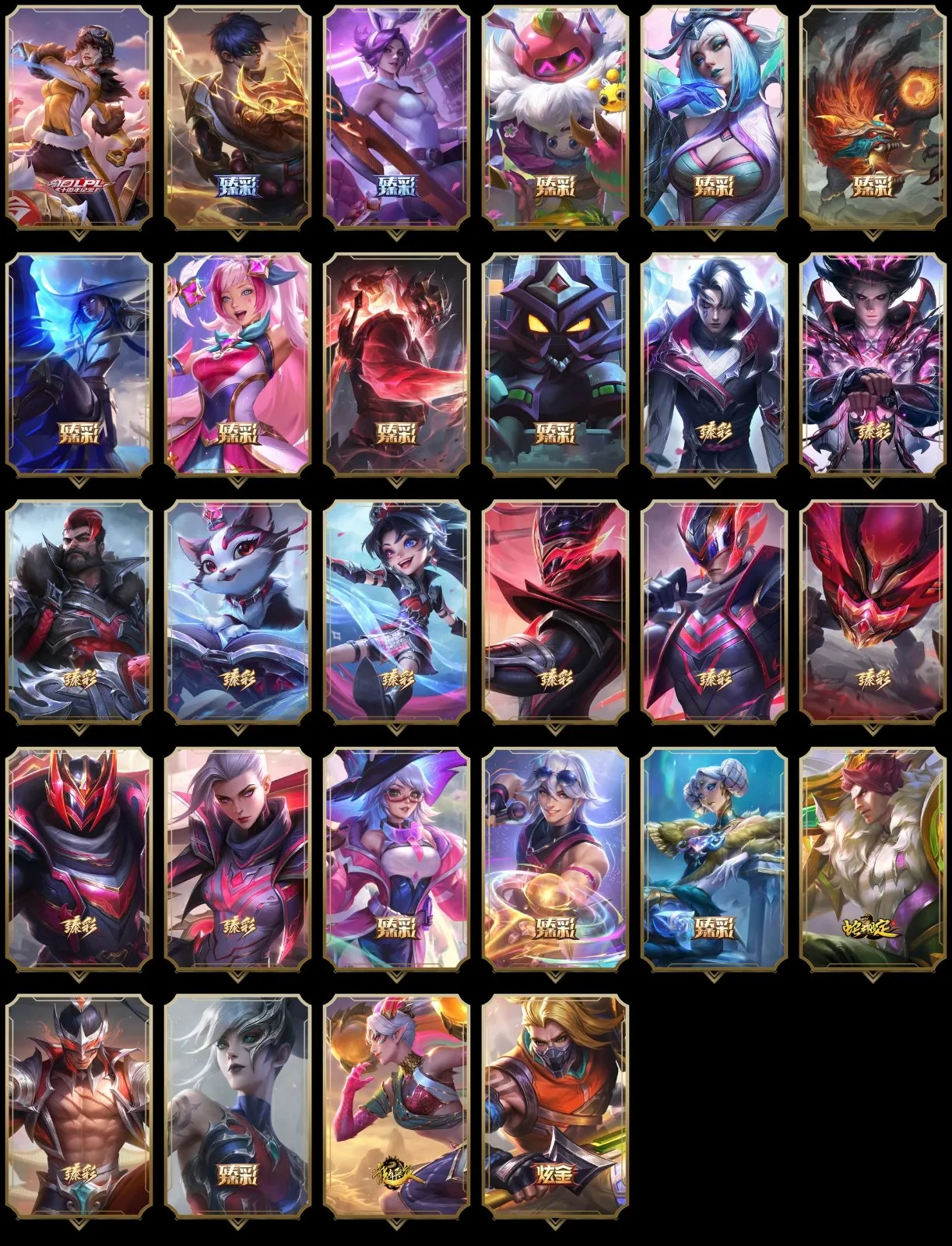 【重要皮肤】狼神英灵斯维因至臻 绝息圣堂厄运小姐至臻 至高天奎桑提至臻 星之守护者艾克至臻 西部魔影猎天使恶魔泰隆至臻 神凰行者烈羽焰凰霞至臻 女帝黛安娜至臻 魔女乐芙兰至臻 未来战士卢锡安至臻 真实伤害亚索至臻 真实伤害赛娜至臻 源计划逆流塞拉斯至臻 神龙尊者炎龙瑟提至臻 烈焰美人薇恩至臻 绒毛菲兹至臻 玉剑传说武剑仙至臻 腥红之月亚托克斯至臻 腥红之月亚托克斯2022至臻 未来战士锤石至臻 未来战士锤石2022至臻 黑夜使者李青至臻 黑夜使者李青2022至臻 灰烬杀手塞拉斯 海克斯科技瑟庄妮 海克斯科技雷克顿 海克斯科技斯维因 圣天龙李青 新卧虎藏龙贾克斯 永恒之森奥恩 暗星科加斯 光明哨兵奥拉夫 黎明使者卡尔玛 零之枪骑赫卡里姆 摄魂使者薇恩 胜利剑圣易 胜利巨口克格莫 战熊骑士瑟庄妮 创星之灵璐璐 钢铁军团拉克丝 荣誉使者玛尔扎哈 电玩女神厄运小姐 星之守护者伊泽瑞尔 神凰行者烈羽焰凰霞 海珀利安小队Z01猎户座卢锡安 海珀利安小队Y03权天使卡蜜尔 玉剑传说神机花火 玉剑传说无劫 玉剑传说舞龙卫 星之守护者佐伊 灵能特工易 黎明使者薇恩 龙的传人李青 天龙之子李青 天龙之子斯莫德 替父从军花木兰 神龙烈焰金克丝 古琴余韵娑娜 北辰之威内瑟斯 美猴王孙悟空 定海神珍孙悟空 紫金罗刹莫甘娜 广寒仙子嫦娥 神龙之翼库奇 福牛守护者厄斐琉斯 福牛守护者德莱厄斯 福牛守护者阿利斯塔 福牛守护者嘉文四世 胜利枪神卢锡安 水晶玫瑰阿克尚 甜心宝贝安妮 甜心宝贝娑娜 觅心游侠卢锡安 觅心魔灵奥莉安娜 双城之战2幸存者杰斯 双城之战2微光实验室辛吉德 北极星守护者卢锡安 北极星神黛安娜 冬季仙境奥莉安娜 冰雪风暴希维尔 冬季仙境卡尔玛 持胡萝卜的雪人易 狂心冰王图奇 魄罗骑士瑟庄妮 平安夜女神娑娜 圣诞糖果棒厄运小姐 魅惑女巫乐芙兰 魅惑女巫厄运小姐 死亡誓约劫 小恶魔菲兹 海之歌永恩 泳池派对佐伊 泳池派对普朗克 泳池派对奥莉安娜 泳池派对厄运小姐 泳池派对格雷福斯 泳池派对李青 泳池派对雷克顿 泳池派对瑟提 电玩战魂赫卡里姆 克格汪 制胜金靴李青 制胜金球拉莫斯 T1李青 EDG厄斐琉斯 EDG佛耶戈 EDG格雷福斯 EDG悠米 EDG佐伊 DWG烬 FPX锤石 FPX薇恩 FPX李青 FPX普朗克 FPX墨菲特 iG卡蜜尔 iG洛 iG卡莎 iG艾瑞莉娅 iG乐芙兰 iG菲奥娜 SSG霞 SSG纳尔 SSG伊泽瑞尔 SKTT1扎克 SKTT1烬 SKTT1辛德拉 SKTT1奥拉夫 SKTT1阿利斯塔 SKTT1瑞兹 SKTT1雷克顿 SSW泰隆 SSW图奇 SSW辛吉德 SKTT1贾克斯 SKTT1劫 SKTT1婕拉 SKTT1李青 暗杀星奥莉安娜 暗杀星蒙多 Fnatic迦娜 冰雪节格雷福斯 冰雪节玛尔扎哈 冰雪节辛吉德 防暴机器人布里茨 防暴士兵格雷福斯 防暴天使凯尔 钢铁之翼艾尼维亚 冠军典狱长锤石 冠军掠夺者卡兹克 冠军之矛卡莉丝塔 冠军之刃锐雯2016 冠军之血希瓦娜 冠军之隐劫 冠军之志瑞兹 春晖海神卡兹克 鬼影森森茂凯 鬼影重重魔腾 海贼瑞兹 胡桃夹子萨科 警用试作体K9内瑟斯 蒙多蒙多 密林猎手提莫 南瓜头费德提克 女猎手希维尔 破空枪骑孙悟空 圣诞开心鬼提莫 圣诞狂欢基兰 圣诞狂欢努努和威朗普 圣诞老人古拉加斯 圣诞玩偶波比 圣诞驯鹿克格莫 外星装甲库奇 卧虎藏龙贾克斯 无头骑士赫卡里姆 喜庆之树茂凯 邪恶圣诞老人维迦 幸福女神乐芙兰 雪默丁格 野兽猎人德莱文 野兽猎人瑟庄妮 野兽猎人泰达米尔 勇者阿狸 勇者奈德丽 征服者卡尔玛 暗影沃里克 冠军之箭艾希 诺斯费拉图弗拉基米尔 阿木木主人不要我了 2022全球总决赛阿兹尔 波比的巧克力工坊 地底世界崔斯特 都铎王朝图奇 十五周年纪念希维尔 十周年纪念安妮 源代码乐芙兰 神凰行者瑞羽圣凰艾尼维亚 机神白虎贾克斯 机神青龙德莱文 斗魂觉醒佛耶戈 暗裔英雄盖伦 DJ娑娜 大元素使拉克丝 灵魂守卫乌迪尔 未来战士伊泽瑞尔 武装战姬厄运小姐 绝息圣堂洛 魔女娜美