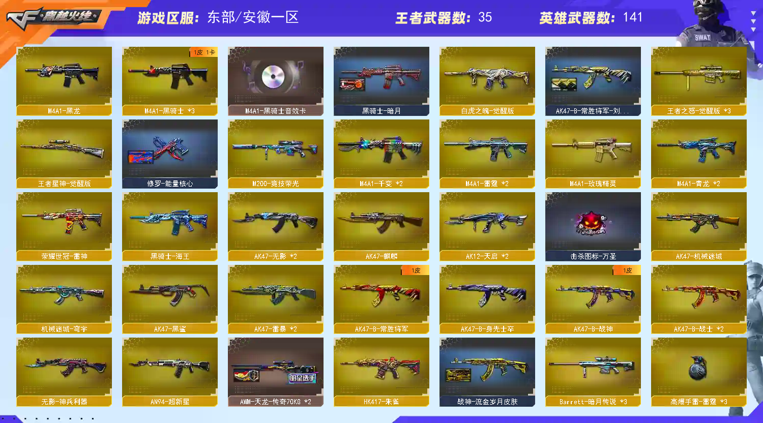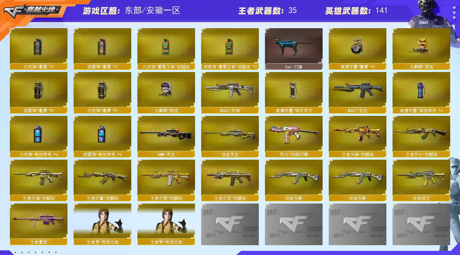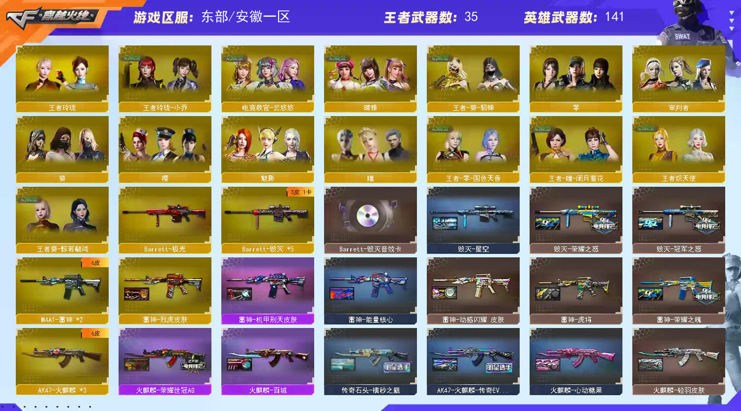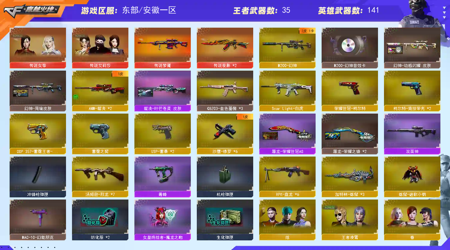 基本介绍:传说女帝/传说艾丽莎/传说夜影x2/传说梦魇/清雅/职业经理/幻神周瑜音效四件套带动感闪耀/王者星神觉醒/白虎/六烈六盘蝴蝶刀小刚/毁灭三件套/2usp雷暴/2竞技荣光柯尔特/cop雷霆/cop王者雷霆/6修罗/五套雷暴/竞技荣光套/雷暴套/雷霆套