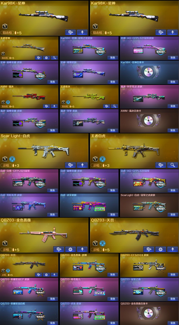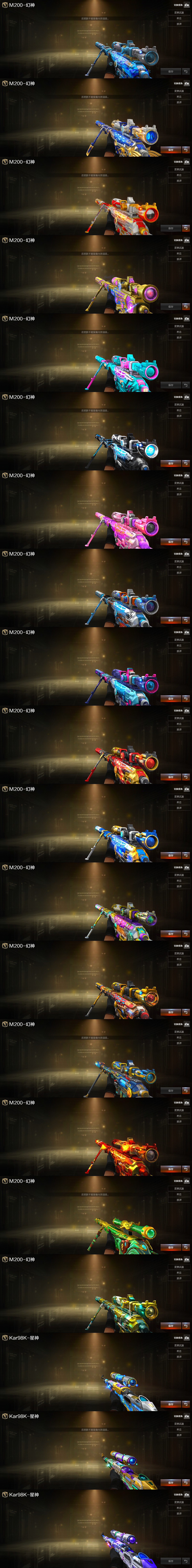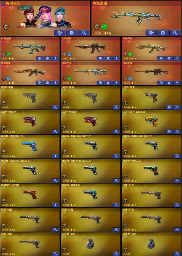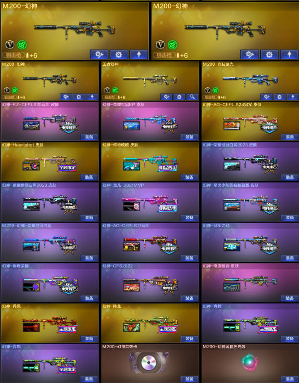 【稀有武器】:传说光耀/传说暗裔/传说辉光/传说夜影/传说圣灵/传说梦魇/M200-幻神(3)/Kar98K-星神(2)/G36C-幻影/ScarLight-白虎/M14EBR-玄武/HK417-朱雀(2)/QBZ03-天罚(2)/M4A1-堕天神/USP-雷暴(2)/COP-堕天神(2)/柯尔特-竞技荣光/柯尔特-荣耀世冠白鲨2023(4)/柯尔特-无冕之王/修罗-古蛇迷踪/沙鹰-幻兽(5)/荣耀世冠-柯尔特/COP357-雷霆王者-觉醒版/金色蔷薇-古蛇迷踪/QBZ03-金色蔷薇(2)/AK47-火麒麟(2)/AK47-麒麟/M4A1-黑龙(2)/M4A1-雷神(2)/M4A1-黑骑士(2)/荣耀世冠-雷神/Barrett-毁灭(2)/AWM-裁决/M200-竞技荣光/RPK-盘龙/炽芒蝶刃/麒麟刺-堕天神/龙啸-堕天神/马来剑-夜魔/擎天-竞技荣光