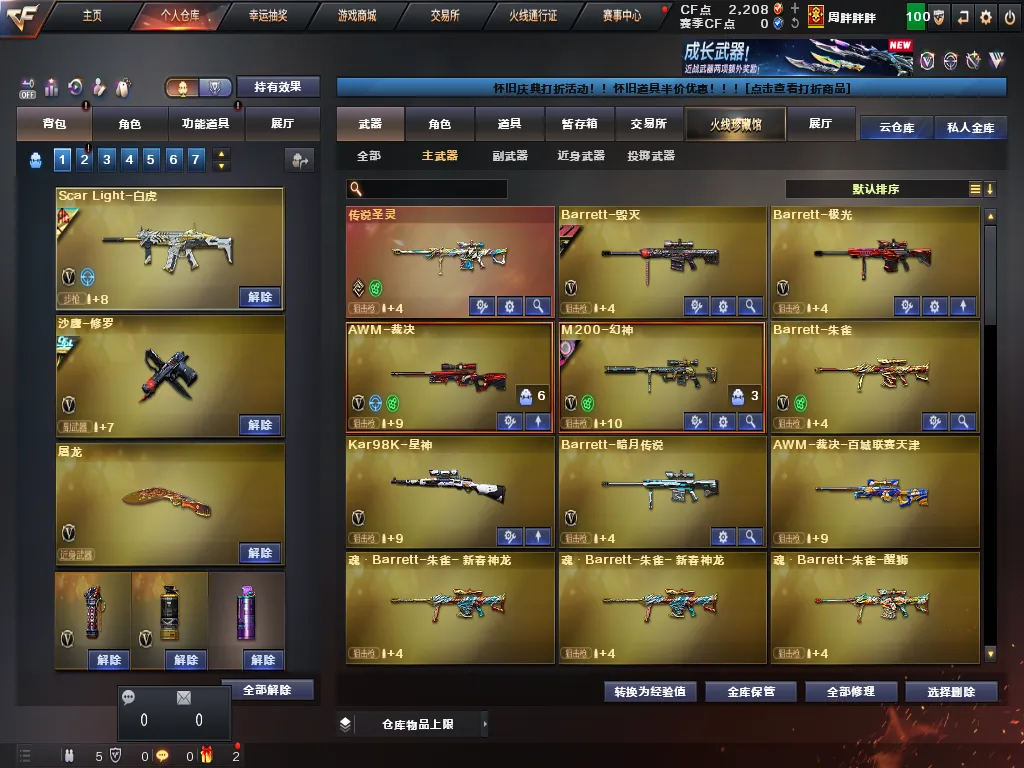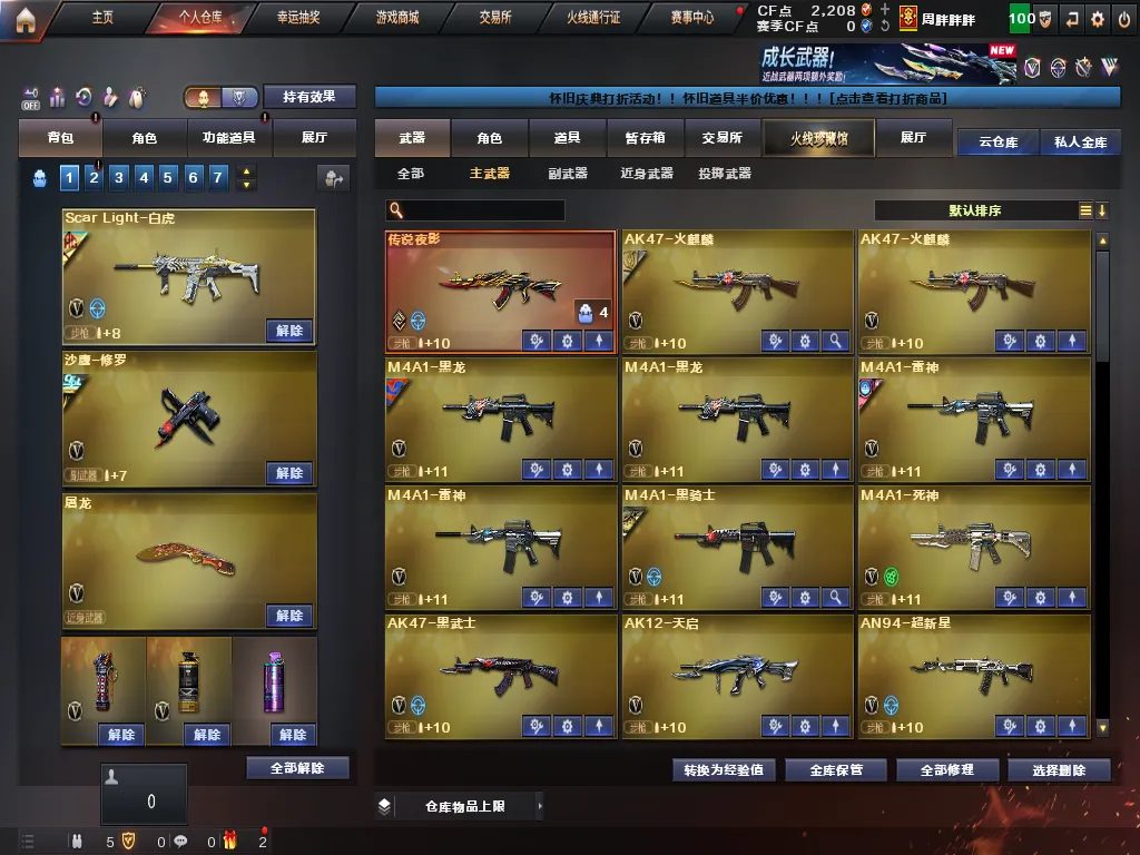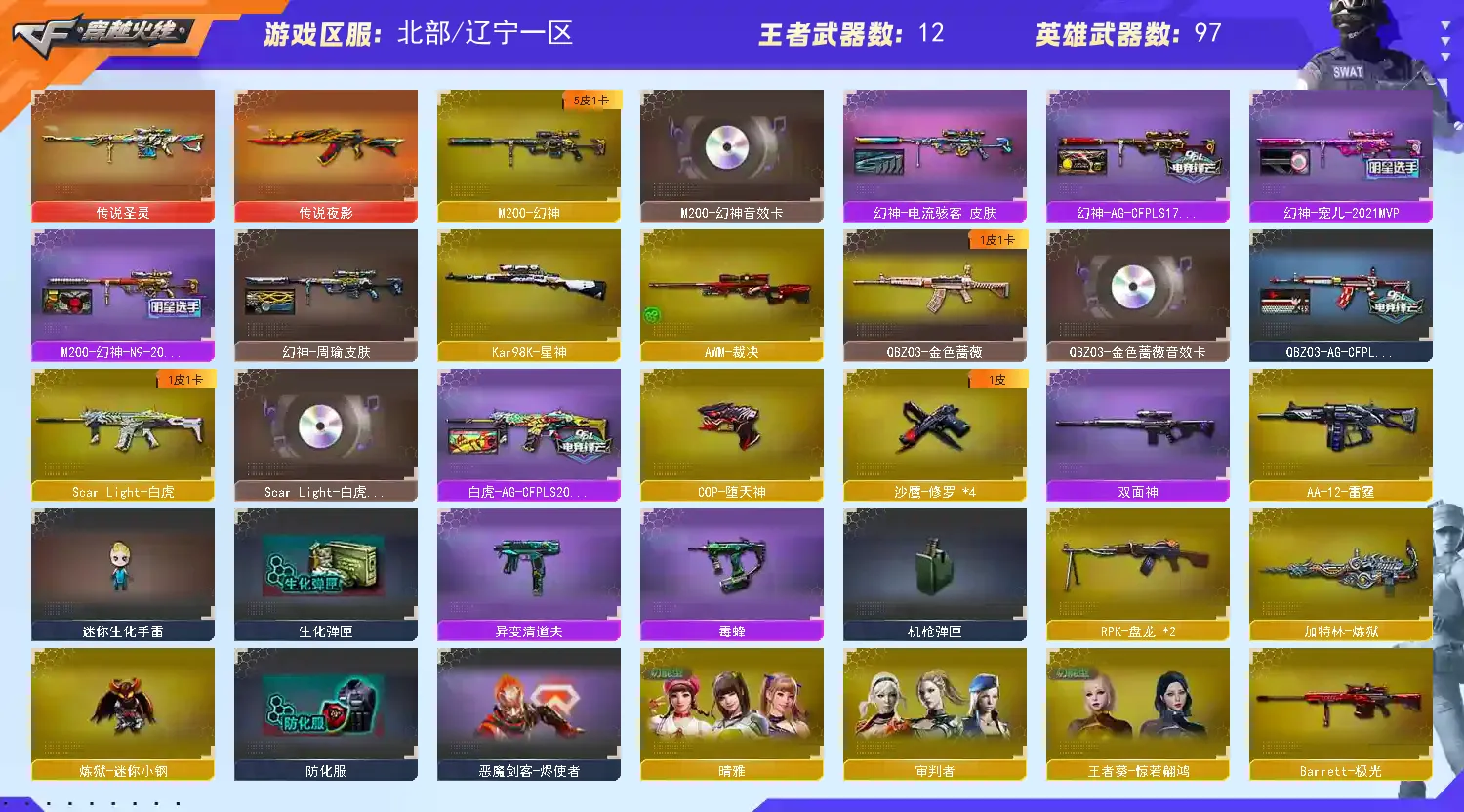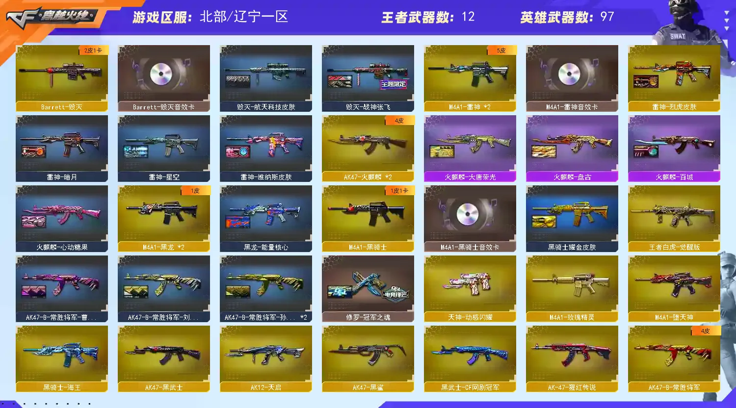 英雄武器:黑武士-锦绣游龙;黑骑士-海王;手雷-云海游龙;烈龙-云海游龙;擎天-云海游龙;天神-动感闪耀;屠龙-动感闪耀;烈火-动感闪耀;手雷-动感闪耀;传说夜影;无影-神兵利器;麒麟刺;AK47-火麒麟;Kar98K-星神;9A91-烈火;沙鹰-修罗;传说圣灵;AK12-天启;天神-CF网剧冠军;黑武士-CF网剧冠军;擎天-CF网剧冠军;AN94-超新星;闪光弹-幻灵;高爆手雷-幻灵;屠龙;幻灵之锋;烟雾弹-幻灵;AK-47-猩红传说;Barrett-暗月传说;AK47-B-常胜将军;AK47-B-战士;AK47-黑武士;M4A1-黑龙;M4A1-龙血;M200-幻神;烟雾弹-堕天神;高爆手雷-堕天神;闪光弹-堕天神;M4A1-堕天神;COP-堕天神;龙啸-堕天神;麒麟刺-堕天神;Barrett-极光;QBZ03-金色蔷薇;AK47-黑鲨;Scar Light-白虎;M4A1-死神;M4A1-雷神;沙鹰-天神;AK47-B-身先士卒;Barrett-朱雀;RPK-盘龙;AWM-裁决;龙啸;擎天;加特林-炼狱;AA-12-雷霆;M4A1-黑骑士;Barrett-毁灭;M4A1-玫瑰精灵