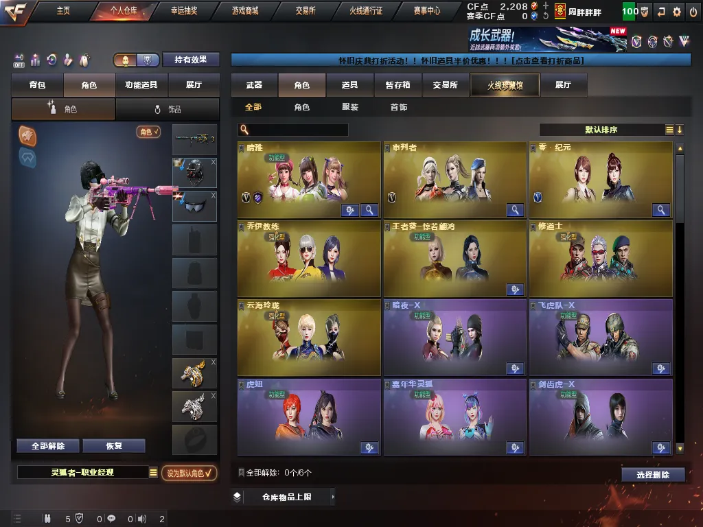 角色:审判者;晴雅;飞虎队;刀锋;潘多拉;曼陀罗;幻影;白狼;复仇者;堕天使;兰;威锋;陈龙野-X;娜塔莎;救世复仇;救世主;精英部队;灵狐者;烈锋;影武者;影武者-X;救世主-X;蜀雪;暗夜-X;妲己;职业选手;娟娟;灵狐者-职业经理;王者葵-惊若翩鸿;麻雀;剑齿虎-X;圣诞潘多拉-X;虎妞;潘多拉-甜心教官;雪莉杨-摸金校尉;曼陀罗-礼服;灵动武士;灵狐-花神;木兰;嘉年华灵狐;游珑儿;猎狐者-X;斯沃特精英;铁骑