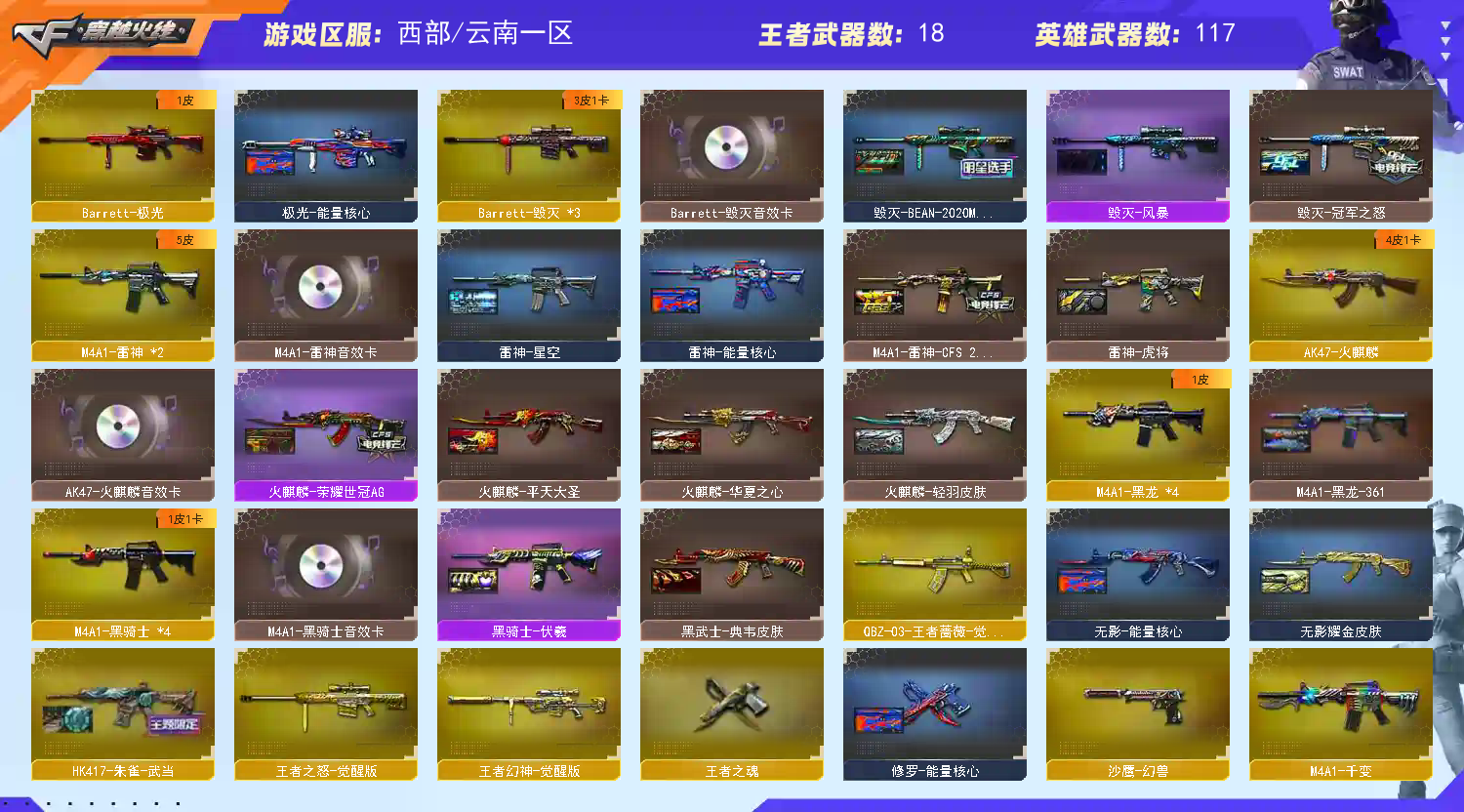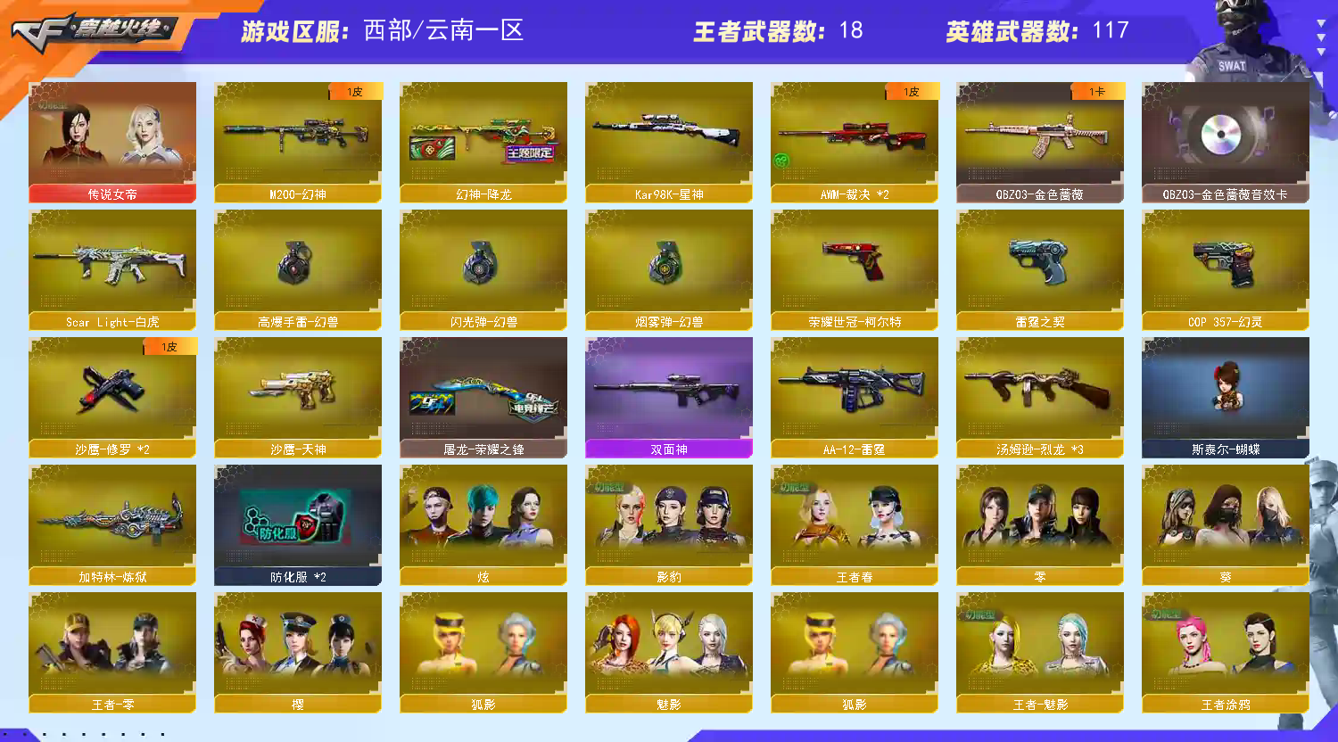 【稀有武器】:M200-幻神/Kar98K-星神/ScarLight-白虎/HK417-朱雀/M4A1-幻灵/雷霆之契/COP357-幻灵/沙鹰-幻兽/荣耀世冠-柯尔特/QBZ03-金色蔷薇/AK47-火麒麟/AK47-麒麟/M4A1-黑龙(4)/M4A1-雷神(2)/M4A1-黑骑士(4)/AK47-无影/AK47-黑武士/Barrett-毁灭(3)/Barrett-极光/AWM-裁决(2)/加特林-炼狱/汤姆逊-烈龙(3)/AA-12-雷霆/幻灵之锋/女皇利刃-幻兽