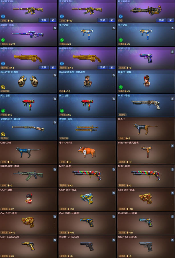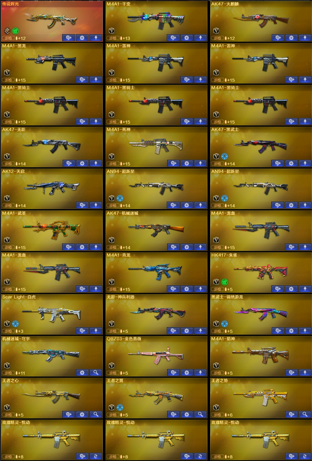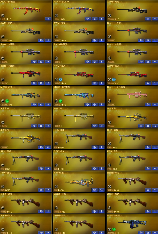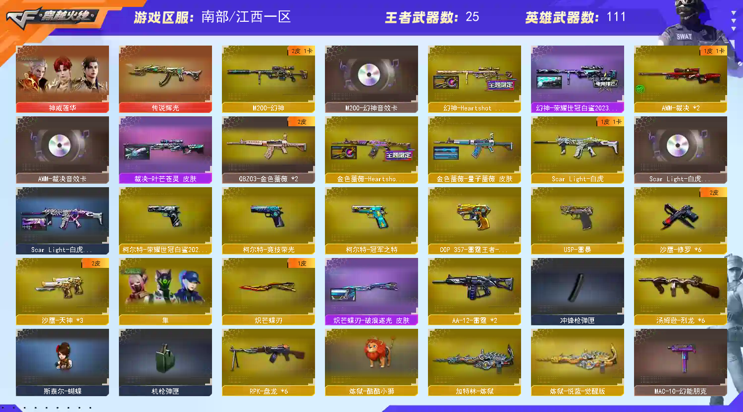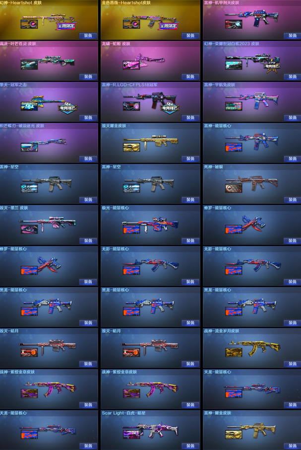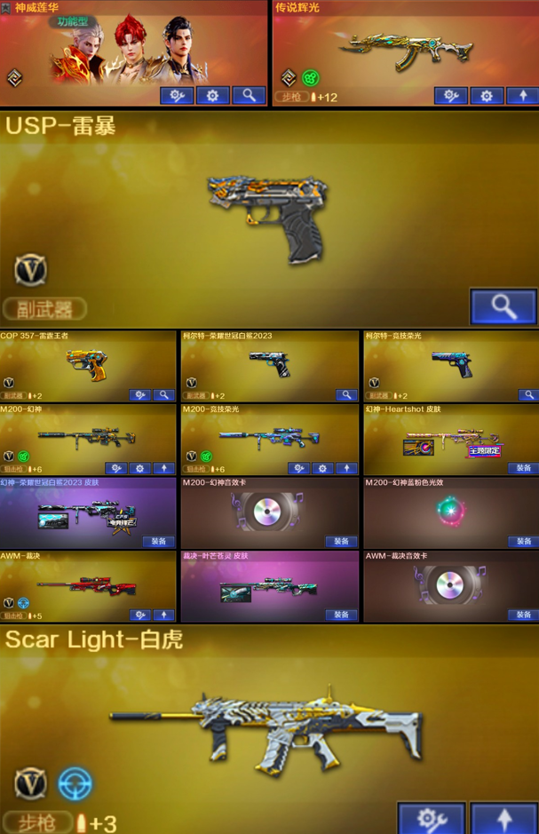 【稀有武器】:神威莲华/传说辉光/M200-幻神/ScarLight-白虎/M4A1-青龙/HK417-朱雀/USP-雷暴/柯尔特-竞技荣光/柯尔特-荣耀世冠白鲨2023/COP357-雷霆王者-觉醒版/QBZ03-金色蔷薇/AK47-火麒麟/M4A1-黑龙/M4A1-雷神(2)/M4A1-黑骑士(3)/AK47-无影/AK47-黑武士/Barrett-毁灭(4)/Barrett-极光/AWM-裁决(2)/M200-竞技荣光/RPK-盘龙(6)/汤姆逊-烈龙(6)/AA-12-雷霆/炽芒蝶刃/擎天-竞技荣光(2)
