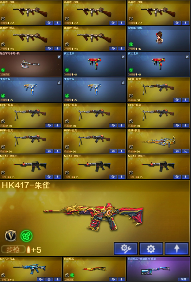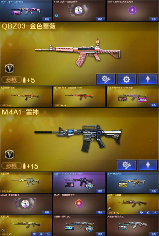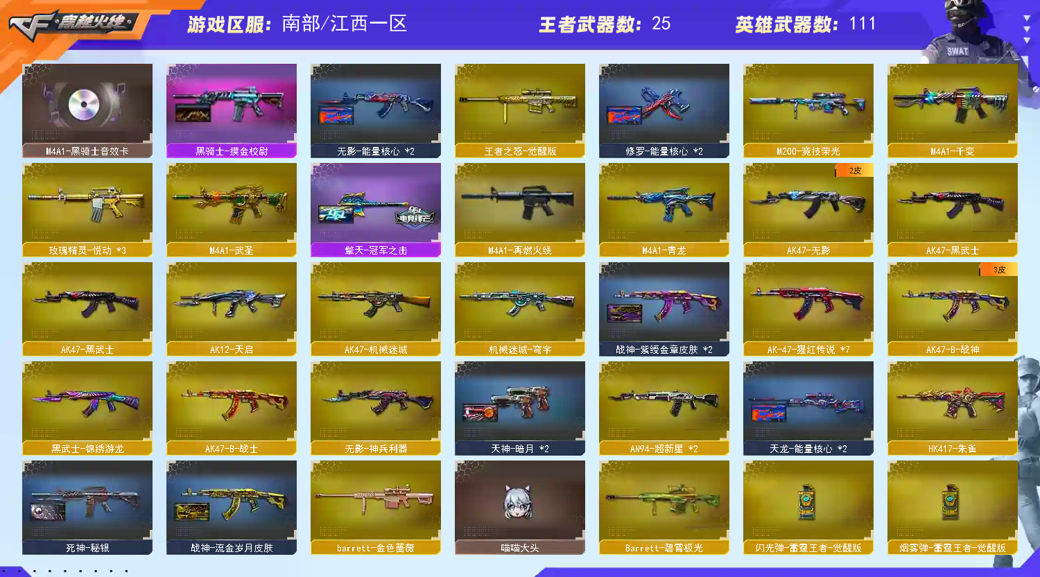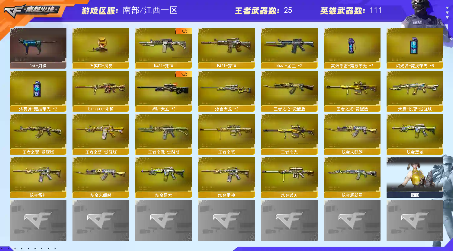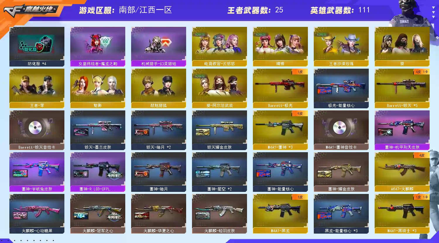 【稀有武器】:神威莲华/传说辉光/M200-幻神/ScarLight-白虎/M4A1-青龙/HK417-朱雀/USP-雷暴/柯尔特-竞技荣光/柯尔特-荣耀世冠白鲨2023/COP357-雷霆王者-觉醒版/QBZ03-金色蔷薇/AK47-火麒麟/M4A1-黑龙/M4A1-雷神(2)/M4A1-黑骑士(3)/AK47-无影/AK47-黑武士/Barrett-毁灭(4)/Barrett-极光/AWM-裁决(2)/M200-竞技荣光/RPK-盘龙(6)/汤姆逊-烈龙(6)/AA-12-雷霆/炽芒蝶刃/擎天-竞技荣光(2)