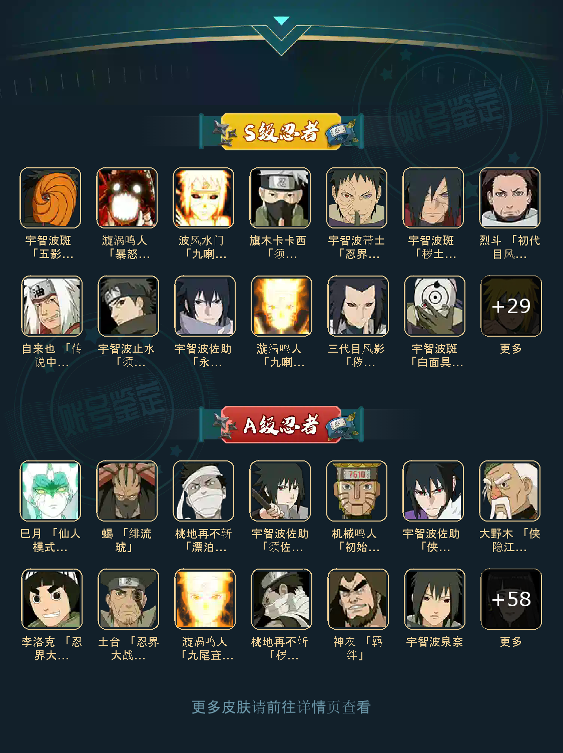 仙人自来也 纲手 波风水门 百战水门 猿飞日斩 千手柱间 宇智波斑 宇智波鼬 舞之自来也 大蛇丸 百战大蛇 秽土四代 秽土三代 秽土长门 仙人兜 黄猿九喇嘛鸣人 紫狗永恒佐助 樱婊忍战樱 秽土鼬 普通自来也 百豪纲手 死门凯 二代扉间 秽土二代 秽土初代 秽土柱间 白面具 须佐卡卡西 小胡子鬼灯幻月 雷影 土影 无 佩恩 百战佩恩 青年柱间 创立初代 秽土斑 青年斑 解斑 须佐止水 虎皮 破面带土 红夜带土 罗砂 秽土三代风影 忍战雷影 三代雷影 金角银角 秽土半藏 忍战大野木 小土豆 天道超 大筒木桃式 大筒木金式 钢铁之躯凯 桀骜之刃阿斯玛 狂野之鲨鬼鲛 飞段 黑飞段 百豪樱 忍战李 大卡卡西 五代水影照美冥 宇智波鼬 仙鸣 九尾查克拉鸣人 鹰佐 奇拉比 青年艾 半蛇兜 晓蛇 新春鼬 面麻 须佐佐助 疾风咒印佐助 忍战宁次 忍战天天 最终章雏田 幻容卡卡西 神卡 忍战卡卡西 泳装卡卡西 忍战凯 青春哥 惊门凯 爱情哥 新春止水 新春水门 青年水门 青水 新春我爱罗 泳装照美冥 侠隐照美冥 侠隐纲手 侠隐兜 漂泊再不斩 漂泊佩恩 漂泊二代 漂泊小南 漂泊佩恩 三船 青年三船 青年长门 泳装南 新春南 春大蛇丸 晓创生角度 晓创生蝎 晓创生飞段 泳装鼬 鲛肌融合鬼鲛 新春迪达拉 秽土迪达拉 恶灵之影飞段 暴怒带土 忍战黄土 卑留呼 桃博 黑土