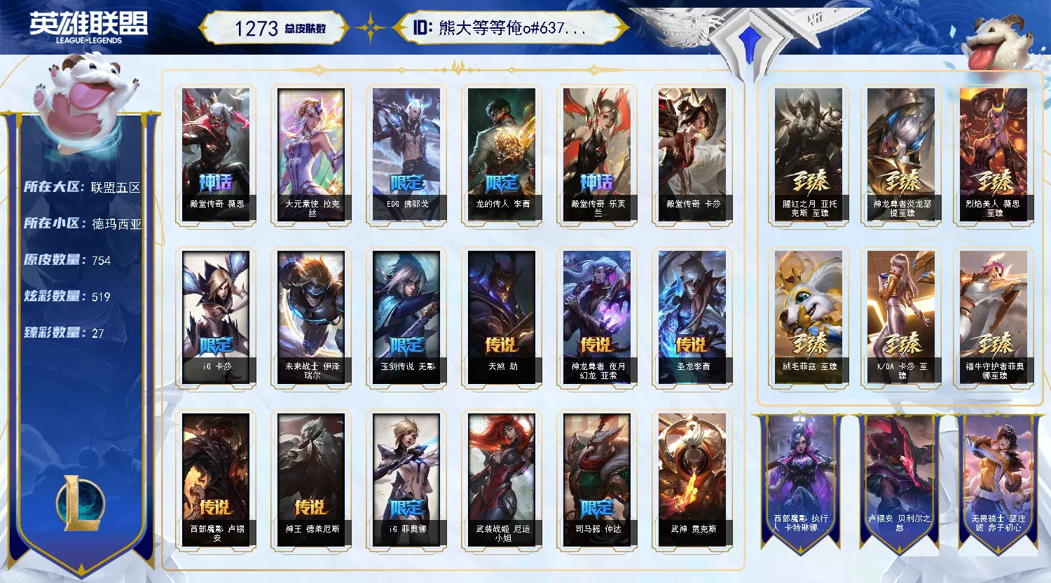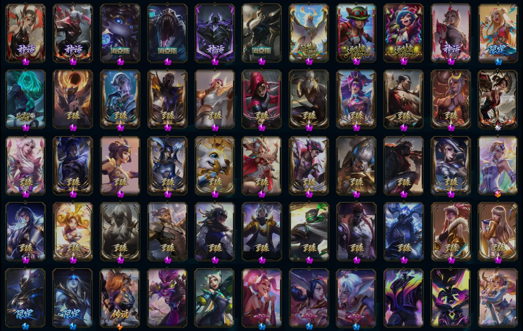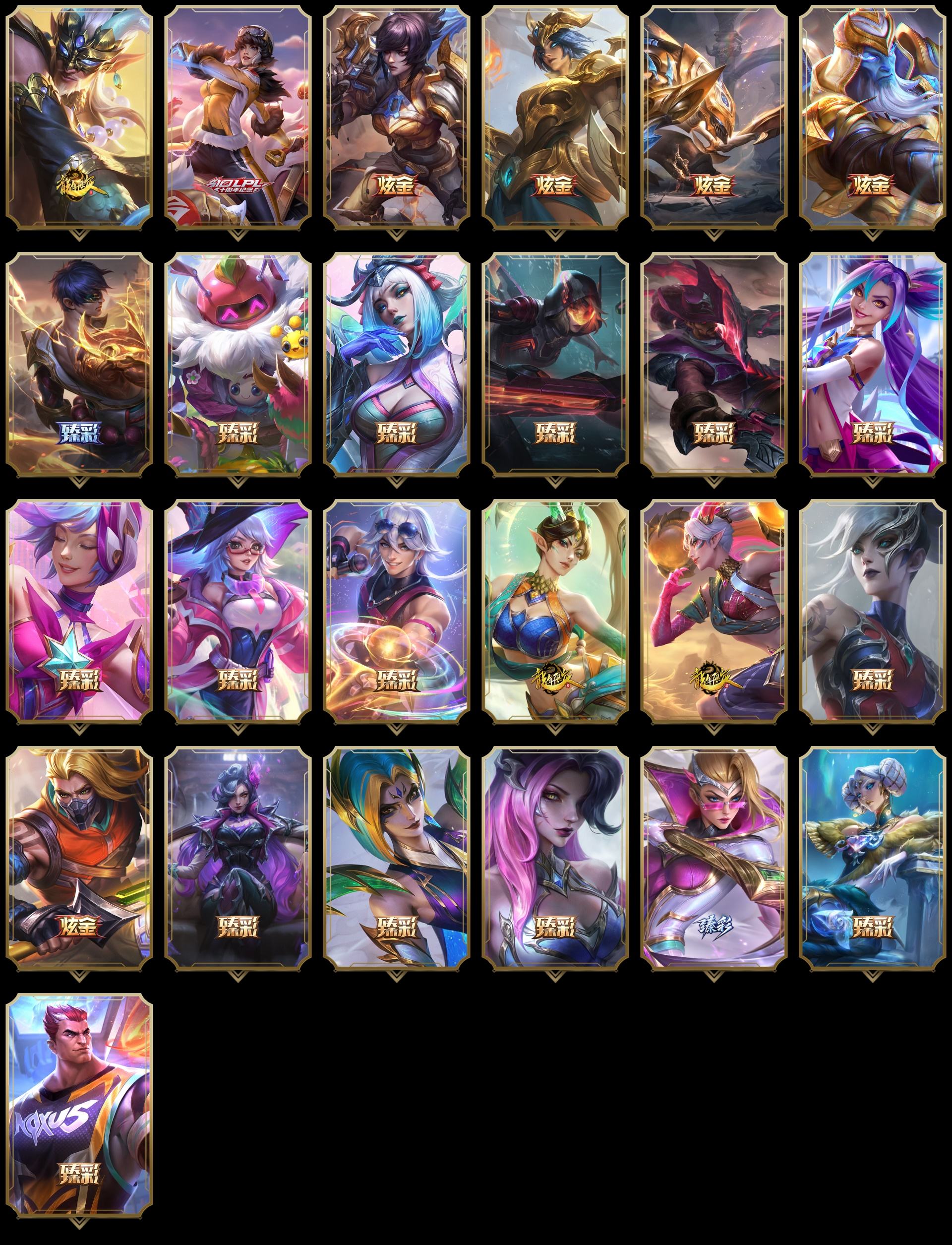 【重要皮肤】殿堂传奇卡莎 灵魂莲华拉克丝至臻 凯旋将军德莱厄斯至臻 黑色玫瑰假面舞会卡特琳娜至臻 幻灵狮心蕾欧娜至臻 西部魔影伊芙琳至臻 神龙尊者比翼之龙洛至臻 北极星钢影卡蜜尔至臻 心之钢永恩至臻 斗魂觉醒派克至臻 DRX亚托克斯至臻 墨之影武者亚索至臻 青花瓷丽桑卓至臻 至高天奎桑提至臻 西部魔影猎天使恶魔泰隆至臻 青花瓷拉克丝至臻 神凰行者烈羽焰凰霞至臻 真实伤害亚索至臻 真实伤害赛娜至臻 福牛守护者菲奥娜至臻 源计划逆流塞拉斯至臻 暗星墨菲特至臻 神龙尊者炎龙瑟提至臻 征服者贾克斯至臻 KDA一代卡莎至臻 KDA阿卡丽至臻 烈焰美人薇恩至臻 星之守护者妮蔻至臻 绒毛菲兹至臻 腥红之月亚托克斯至臻 黑夜使者李青至臻 殿堂传奇薇恩 殿堂传奇乐芙兰 灰烬骑士莫德凯撒 海克斯科技雷克顿 海克斯科技波比 水晶圣骑艾希 零之枪骑赫卡里姆 双城之战2救世主维克托 胜利剑圣易 胜利女神娑娜 胜利之王泰达米尔 胜利巨口克格莫 哥特萝莉安妮 钢铁军团拉克丝 荣誉使者玛尔扎哈 电玩女神厄运小姐 玉剑传说无影 海珀利安小队Z01猎户座卢锡安 女帝厄运小姐 女帝格温 玉剑传说神机花火 玉剑传说无劫 玉剑传说星仙子 玉剑传说翼剑仙 灵能特工易 点心宝贝阿木木 龙的传人李青 天龙之子黛安娜 天龙之子迦娜 天龙之子卡莎 天龙之子李青 天龙之子斯莫德 天龙之子伊泽瑞尔 天龙之子易 剪纸仙灵艾瑞莉娅 剪纸仙灵希维尔 神龙烈焰金克丝 美猴王孙悟空 张辽文远 司马懿仲达 福牛守护者厄斐琉斯 胜利女神瑟庄妮 胜利机器人布里茨 胜利枪神卢锡安 胜利之剑亚托克斯 碎心之拳蔚 甜心之羽霞 甜心之翎洛 甜心宝贝安妮 觅心游侠卢锡安 觅心魔灵奥莉安娜 觅心女王艾希 觅心之翼奎因 觅心萝莉金克丝 觅心猎手薇恩 双城之战2微光实验室辛吉德 北极星使者沃里克 雪球也能爆炸吉格斯 圣诞捣蛋鬼金克丝 圣诞老人德莱文 狂心冰王图奇 冰雪女神辛德拉 魄罗骑士瑟庄妮 平安夜女神娑娜 死亡誓约卡特琳娜 死亡誓约劫 南瓜头王子阿木木 海之歌萨勒芬妮 海之歌永恩 海之歌泽丽 泳池派对凯特琳 泳池派对佐伊 泳池派对普朗克 泳池派对辛德拉 泳池派对奥莉安娜 泳池派对格雷福斯 泳池派对李青 泳池派对雷克顿 穿星魔锋赵信 御星魔矢艾希 鸡里奥 制胜金靴李青 DRX茂凯 EDG厄斐琉斯 EDG佛耶戈 EDG格雷福斯 EDG佐伊 DWG崔斯特 DWG凯南 iG卡蜜尔 iG洛 iG卡莎 iG艾瑞莉娅 iG乐芙兰 iG菲奥娜 SKTT1烬 SKTT1辛德拉 SKTT1卡莉丝塔 SKTT1瑞兹 SSW锤石 SKTT1劫 暗杀星伊泽瑞尔 Fnatic库奇 Fnatic古拉加斯 冰雪节格雷福斯 冰雪节辛吉德 防暴士兵辛吉德 防暴天使凯尔 钢铁之翼艾尼维亚 冠军之刃锐雯2016 春晖大帝锤石 春晖海神卡兹克 春晖神女艾希 春晖神女奇亚娜 鬼影重重魔腾 警用试作体K9内瑟斯 密林猎手提莫 南瓜头费德提克 圣诞狂欢基兰 圣诞狂欢努努和威朗普 无头骑士赫卡里姆 喜庆之树茂凯 邪恶圣诞老人维迦 幸福女神乐芙兰 野兽猎人德莱文 野兽猎人瑟庄妮 永恒之森乐芙兰 勇者奈德丽 征服者诺提勒斯 征服者韦鲁斯 暗影沃里克 2021全球总决赛嘉文四世 地底世界崔斯特 都铎王朝图奇 十五周年纪念希维尔 十周年纪念安妮 源代码乐芙兰 神凰行者瑞羽圣凰艾尼维亚 胜利凤凰艾尼维亚 机神玄武盖伦 暗裔英雄盖伦 大元素使拉克丝 未来战士伊泽瑞尔 武装战姬厄运小姐 绝息圣堂洛