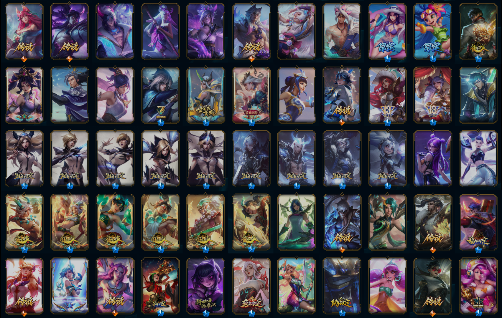 【传说皮肤】黯黑魔龙希瓦娜 月蚀骑士蕾欧娜 灵能特工娑娜 霸天零式赛恩 神龙尊者夜月幻龙亚索 钢铁军团盖伦 女主播迦娜 黑夜使者索拉卡 西部魔影永恩 星之守护者阿狸 黎明使者锐雯 墨之影武者易 最终BOSS维迦 苍穹之光韦鲁斯 屠龙勇士潘森 黯晶凤凰艾尼维亚 绅士科加斯 银河魔装机神兰博 丧尸布兰德 炼狱魔犬内瑟斯 偶像歌手阿狸 西部魔影大小姐蕾欧娜 电玩女神娑娜 日蚀骑士希维尔 星之守护者阿卡丽 鬼魂新娘莫甘娜 上古战魂魔腾 欧米伽小队幽灵特工 蔷薇绅士杰斯 未来战士凯特琳 女警狙击凯特琳 星之守护者霞 陆地王者4WD布里茨 战场女武神凯尔 星之守护者金克丝 至尊魔女莫甘娜 奥德赛凯隐 光明哨兵薇恩 耀星女神拉克丝 暗星女王拉克丝 暗星尊烬 幻灵战斗队长厄运小姐 西部魔影卢锡安 源计划毁灭派克 源计划超体莫德凯撒 源计划泯灭雷克顿 星之守护者卡莎 金牌主播德莱文 霸天异形卡兹克 至高天派克 焰尾妖狐阿狸 西部天使艾希 光明哨兵格雷福斯 灵魂莲华阿狸 暗星锤石 双重冰晶艾尼维亚 灵魂莲华锤石 灵魂莲华瑟提 神龙尊者圣龙李青 神龙尊者昼日真龙亚索 黎明使者永恩 恶魔男爵瑞兹 战斗学院伊泽瑞尔 青花瓷伊泽瑞尔 提莫约德尔人的一大步 女皇艾希 律政大亨蒙多 真实伤害艾克 合金巨兽努努和威朗普 星之守护者拉克丝 宇航员诺提勒斯 第三类接触黑默丁格 冰霜亚龙希瓦娜 大天使长米迦勒凯尔 黑夜使者亚索 地狱之门卫士加里奥 神拳李青 天煞劫 神王德莱厄斯 源计划净化薇恩 烈焰雄心崔丝塔娜 地狱行者孙悟空 源计划联合艾希 灌篮高手德莱厄斯 死亡骑士盖伦 约德尔国队长提莫 腥红之月鬼武姬阿卡丽 冰霜之刃艾瑞莉娅 源计划林易 恶魔之刃泰达米尔