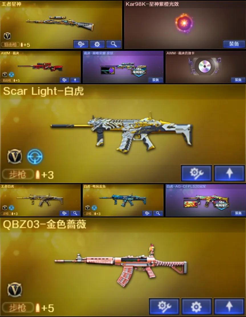 【王者武器】:王者之心-觉醒版/王者白虎-觉醒版/M4A1-雷霆王者-觉醒版/QBZ-03-王者蔷薇-觉醒版/王者之怒-觉醒版/王者星神-觉醒版/王者之光