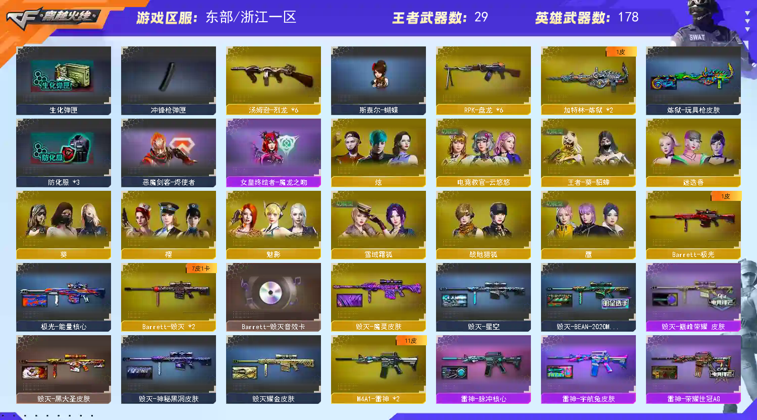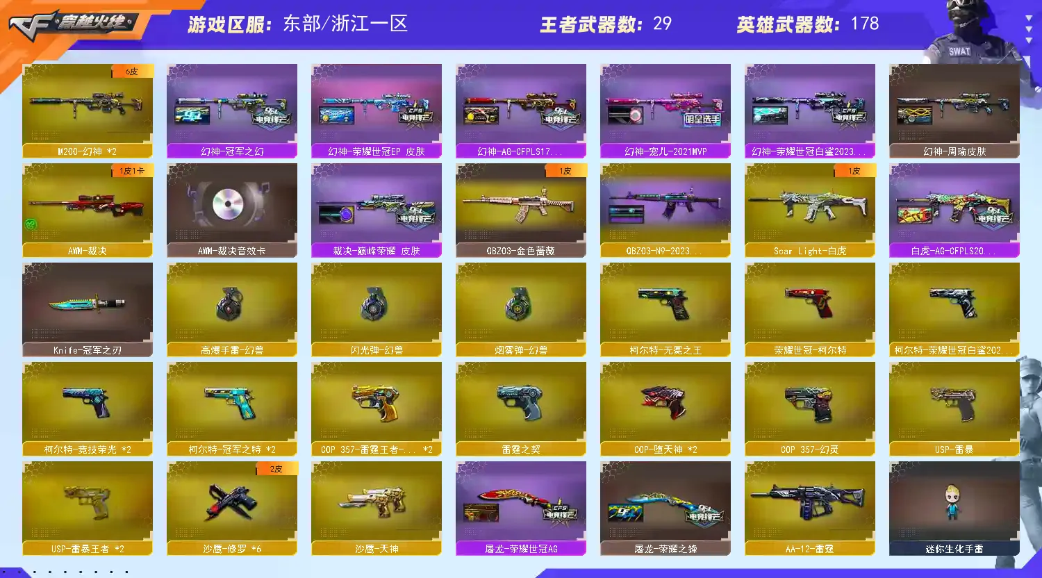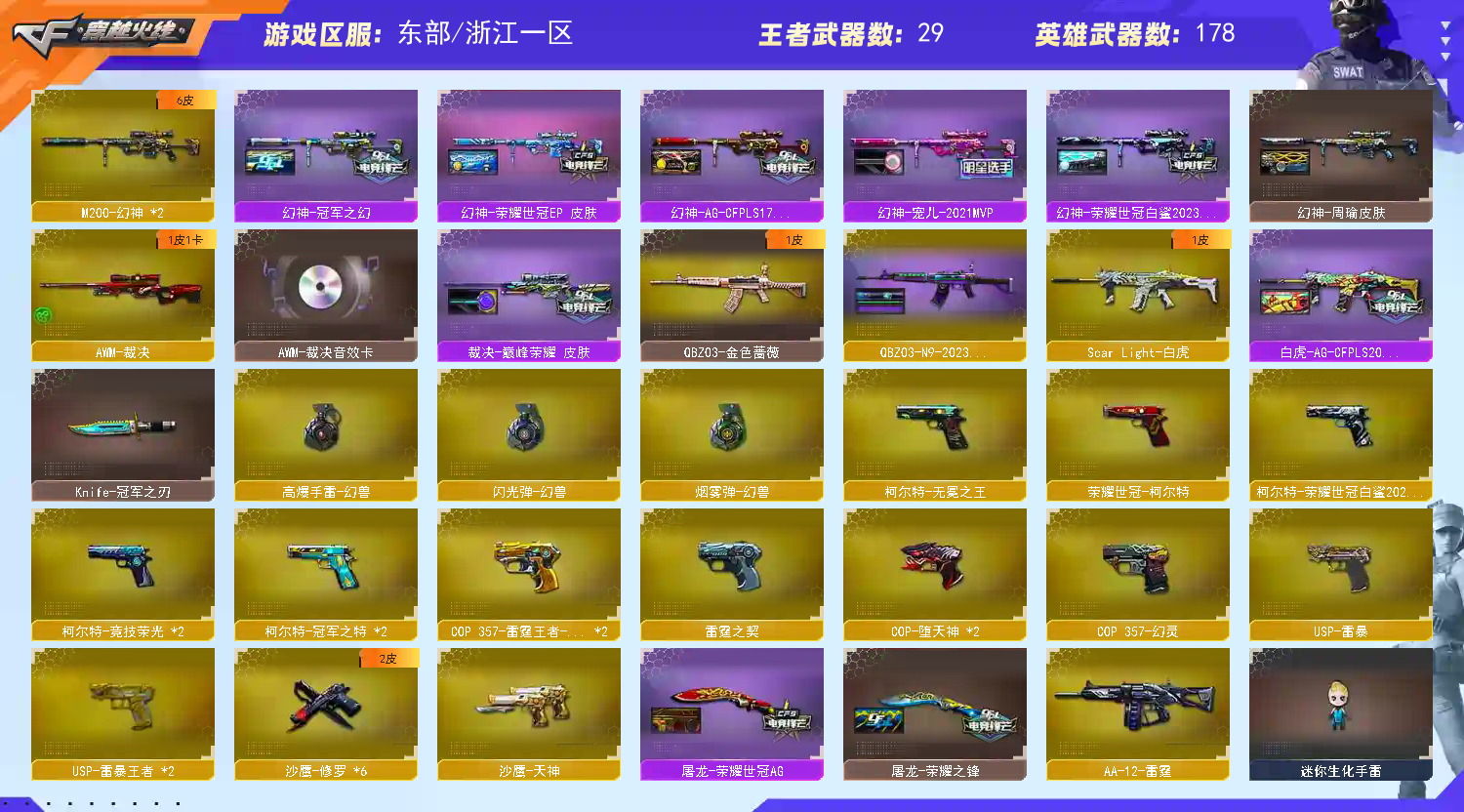 【稀有武器】:M200-幻神/ScarLight-白虎/M4A1-雷霆/AK47-雷暴/M4A1-堕天神/雷霆之契/USP-雷暴/COP-堕天神(2)/COP357-幻灵/柯尔特-竞技荣光(2)/柯尔特-荣耀世冠白鲨2023/沙鹰-幻兽/荣耀世冠-柯尔特/COP357-雷霆王者-觉醒版(2)/柯尔特-冠军之特(2)/QBZ03-金色蔷薇/AK47-火麒麟/AK47-麒麟/M4A1-黑龙/M4A1-雷神/M4A1-黑骑士(6)/AK47-无影/AK47-黑武士/荣耀世冠-火麒麟/荣耀世冠-雷神/白虎-电玩蓝兔/Barrett-毁灭(2)/Barrett-极光/AWM-裁决/M200-竞技荣光/RPK-盘龙(6)/加特林-炼狱(2)/汤姆逊-烈龙(6)/AA-12-雷霆/斩神刀-雷暴/麒麟刺-堕天神/龙啸-堕天神/幻灵之锋/擎天-竞技荣光/女皇利刃-幻兽