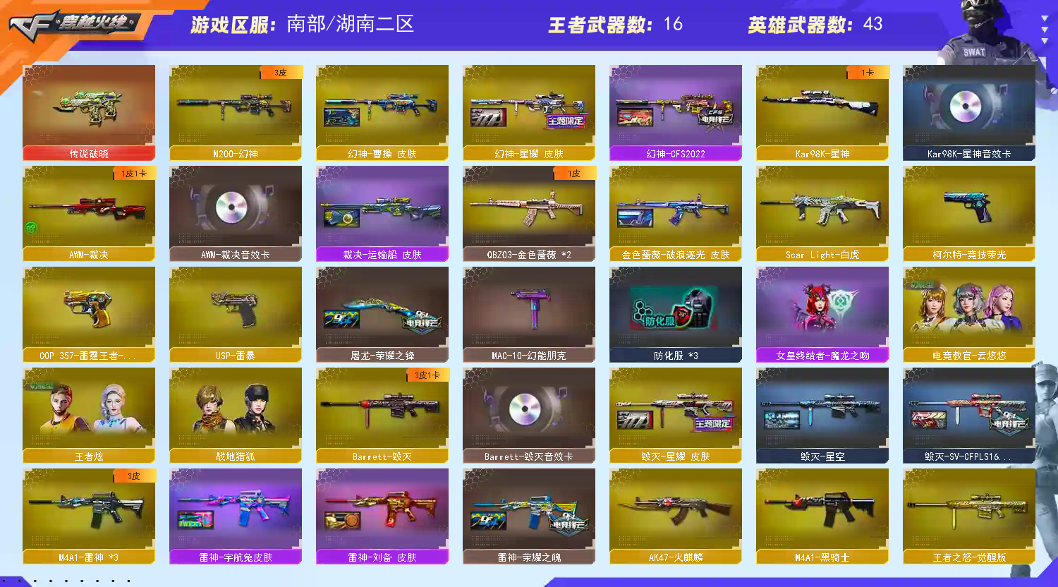 【亮点解析 裁决三件套 】【m200幻神+星耀+曹操+cfs2022】【98k星神+音效卡】【m200竞技荣光套+usp雷暴+云悠悠】【传说破晓】【scar白虎】【qbz金色蔷薇+破浪逐光】【火麒麟】【雷神+女团+荣耀之魄】【黑骑士】【毁灭+卡+星耀+sv16冠军】【裁决+卡+运输船】【武器:王者之怒 】【4手枪:雷暴 竞技荣光 修罗 雷霆王者 】【6刀具:屠龙 擎天 堕天神 竞技荣光 云龙扇 】【7雷套:堕天神*2 竞技荣光 云龙雷*2 雷霆王者*2】【小人枪:朱雀蛇隐宗 星神炽天使】【音效卡:星神音效卡 裁决音效卡 毁灭音效卡 】【四防角色:王者炫 】