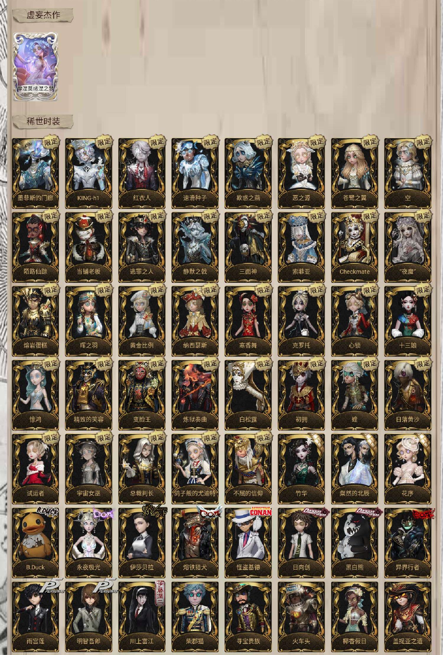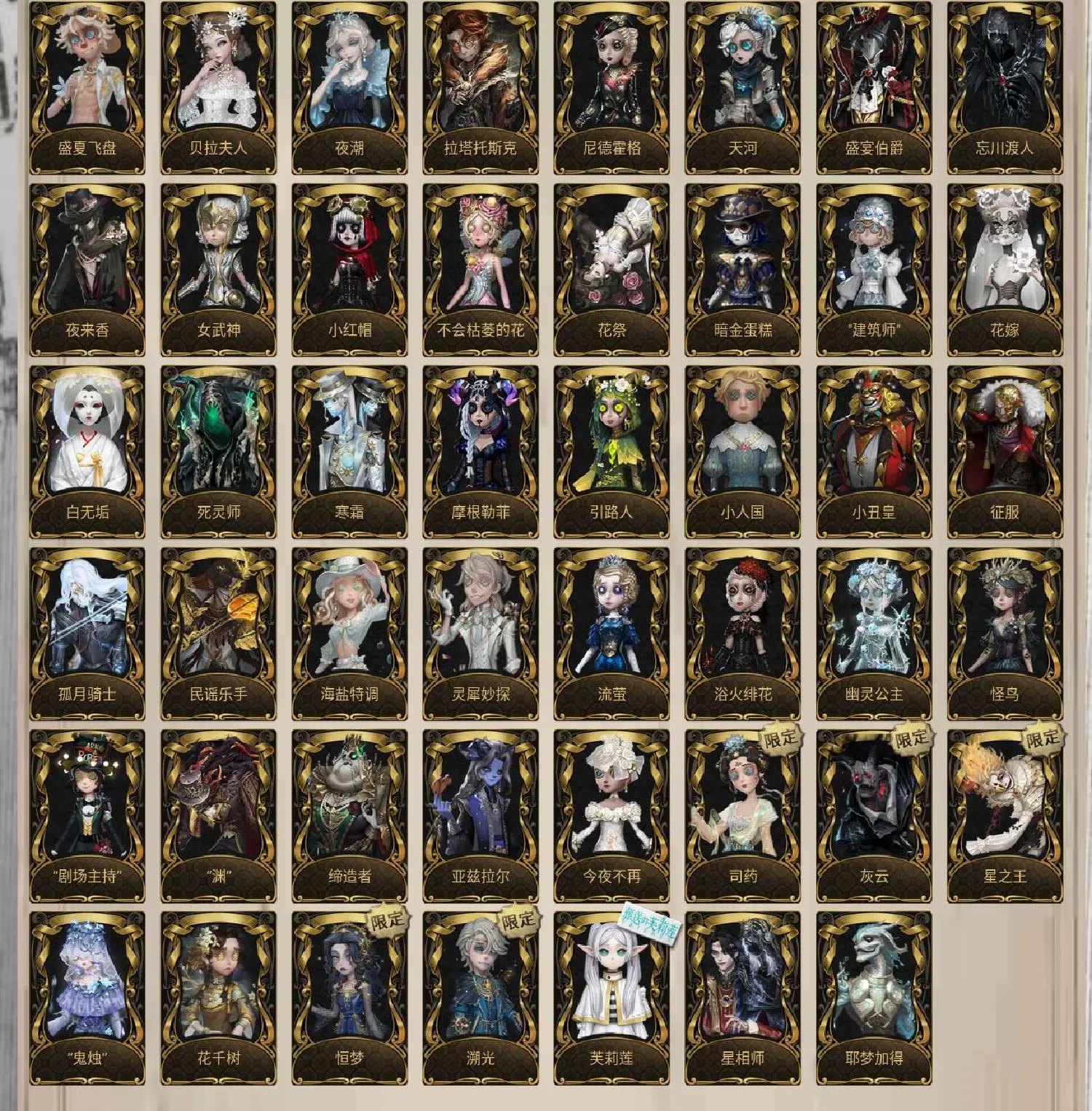 小丑皇、 拉塔托斯克、 流萤、 浴火绯花、 幽灵公主、 怪鸟、 “剧场主持”、 寻宝贵族、 小人国、 柴郡猫、 盛宴伯爵、 忘川渡人、 夜来香、 尼德霍格、 天河、 小红帽、 不会枯萎的花、 女武神、 火车头、 花祭、 暗金蛋糕、 建筑师、 花嫁、 白无垢、 死灵师、 寒霜、 摩根勒菲、 引路人、 今夜不再、 亚兹拉尔、 椰香假日、 贝拉夫人、 夜潮、 耶梦加得、 盖提亚之遗、 盛夏飞盘、 海盐特调、 灵犀妙探、 孤月骑士、 民谣乐手、 “鬼烛”、 征服、 花千树、 星相师、 缔造者、 “渊”、 片刻闲暇