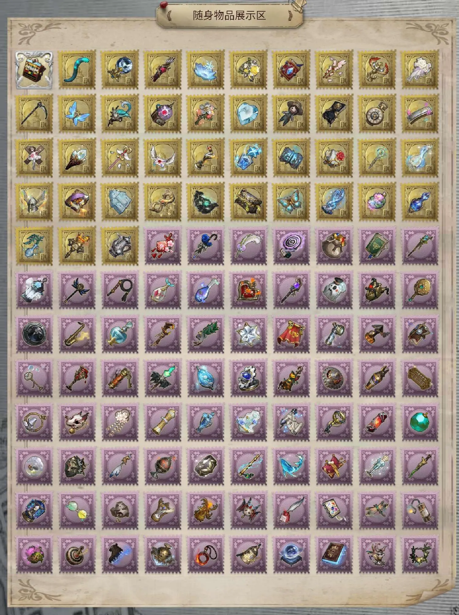 Vote盒子、 狂欢派对、 弄影、 医生-折柳、 兔美的魔法棒、 猫尾、 诅咒黑云、 猎人的箭囊、 雪莲、 黄玫瑰之骸、 魔典、 厌离、 涅槃、 玫瑰之下、 噬魂、 萤之羽、 唤潮、 雷电生成器、 未送出的花、 冰冻之心、 园丁布偶、 父亲的怀表、 最后的馈赠、 完美人偶、 梦魇结晶、 致命的邀请函、 残局的王将、 “星辰”、 最后的故事、 潘多拉、 宽恕、 逆转之战、 书中蝶、 水晶宫、 无尽森林、 呼唤、 邪火宝箱、 玩具商-发条蝴蝶、 孽蜥-进化、 渔女-夏、 盲女-“光明”、 不灭之火、 冒险家-咖啡壶、 十里芬芳、 卡住的齿轮、 金算盘、 沉沦的面具、 乾坤袋、 赤色墨水、 病患-记忆囚笼