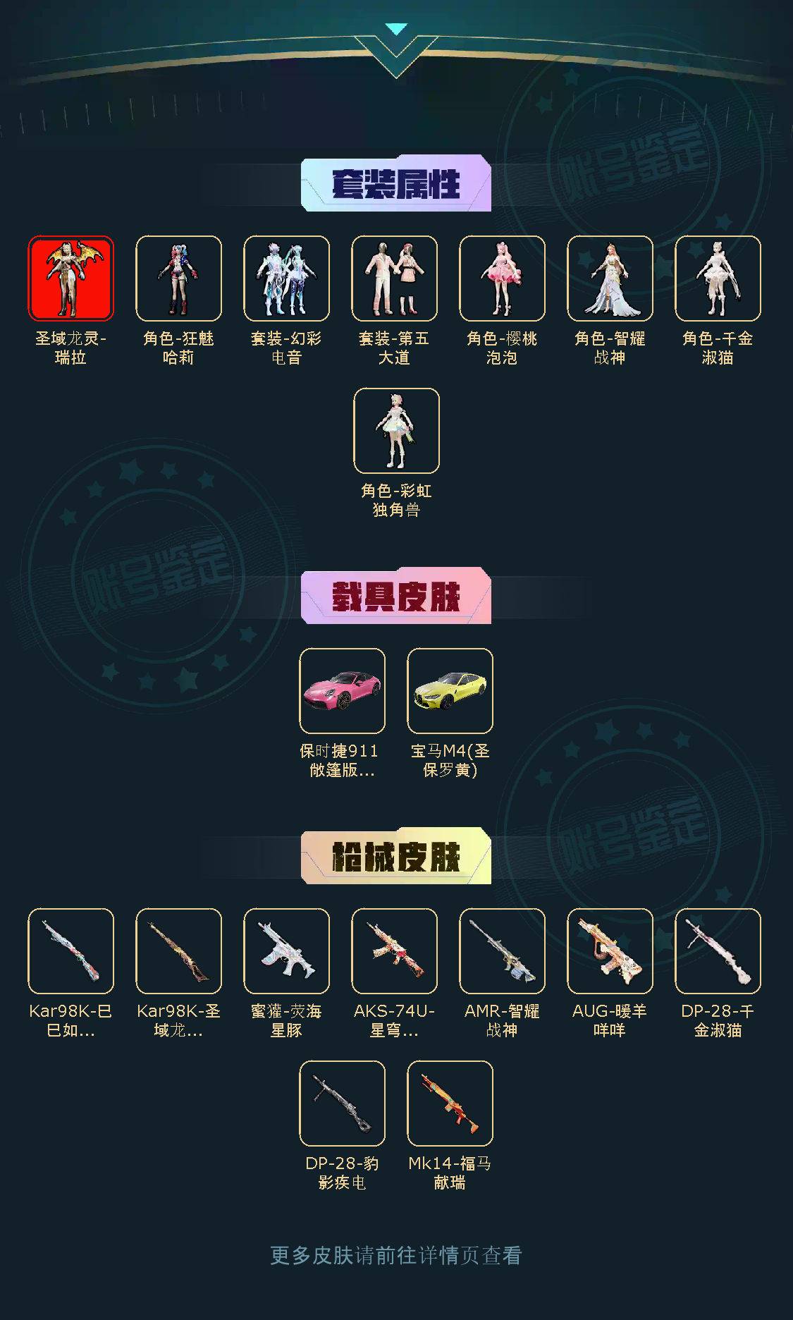 【稀有资产】圣域龙灵-瑞拉[3级]/角色-千金淑猫/套装-第五大道/AUG-暖羊咩咩/套装-雪山精英/套装-东方飞龙/角色-都市丽猫/角色-摩登魅猫/信号枪-彩虹独角兽/M416-仓鼠灰灰