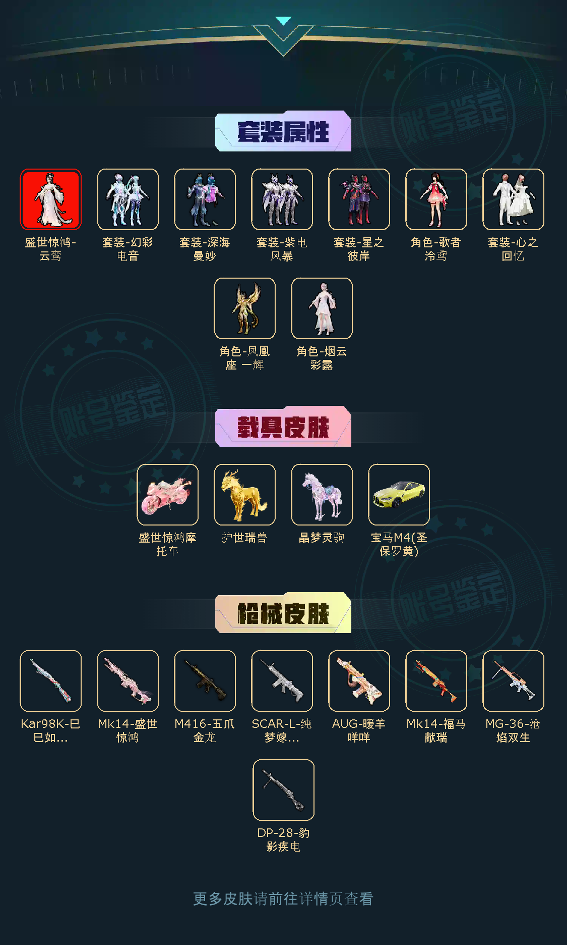 【稀有资产】盛世惊鸿-云鸾[3级]/M416-五爪金龙/AUG-暖羊咩咩/Mk14-盛世惊鸿/小恶魔头饰/套装-奇异狩猎者/套装-胖达圆圆/套装-潮萌小黄鸭/套装-雪山精英/套装-龟仙人/套装-银碳小老虎/玩偶服-憨乐熊二/角色-敖闰/角色-时希公主/角色-乐音