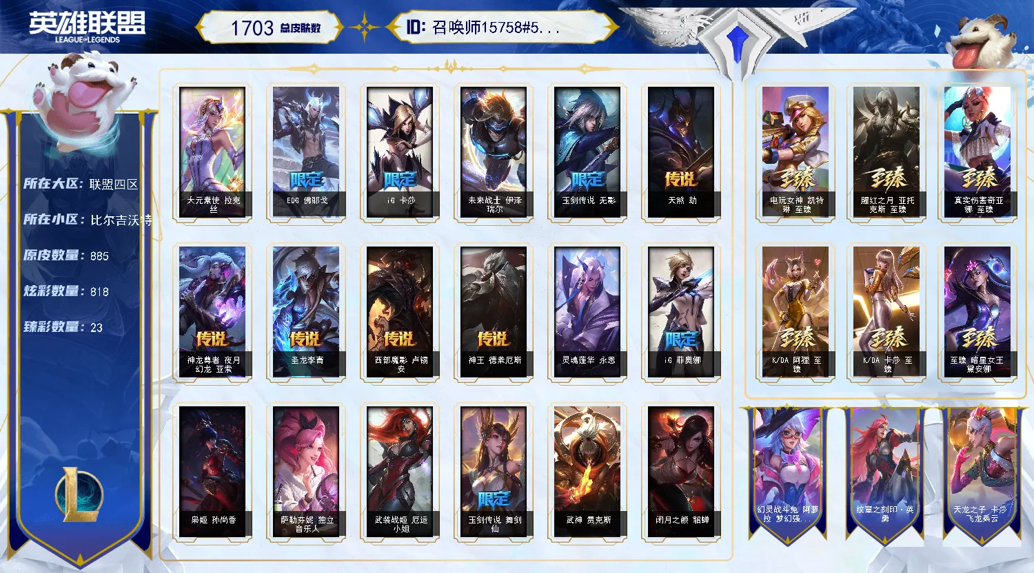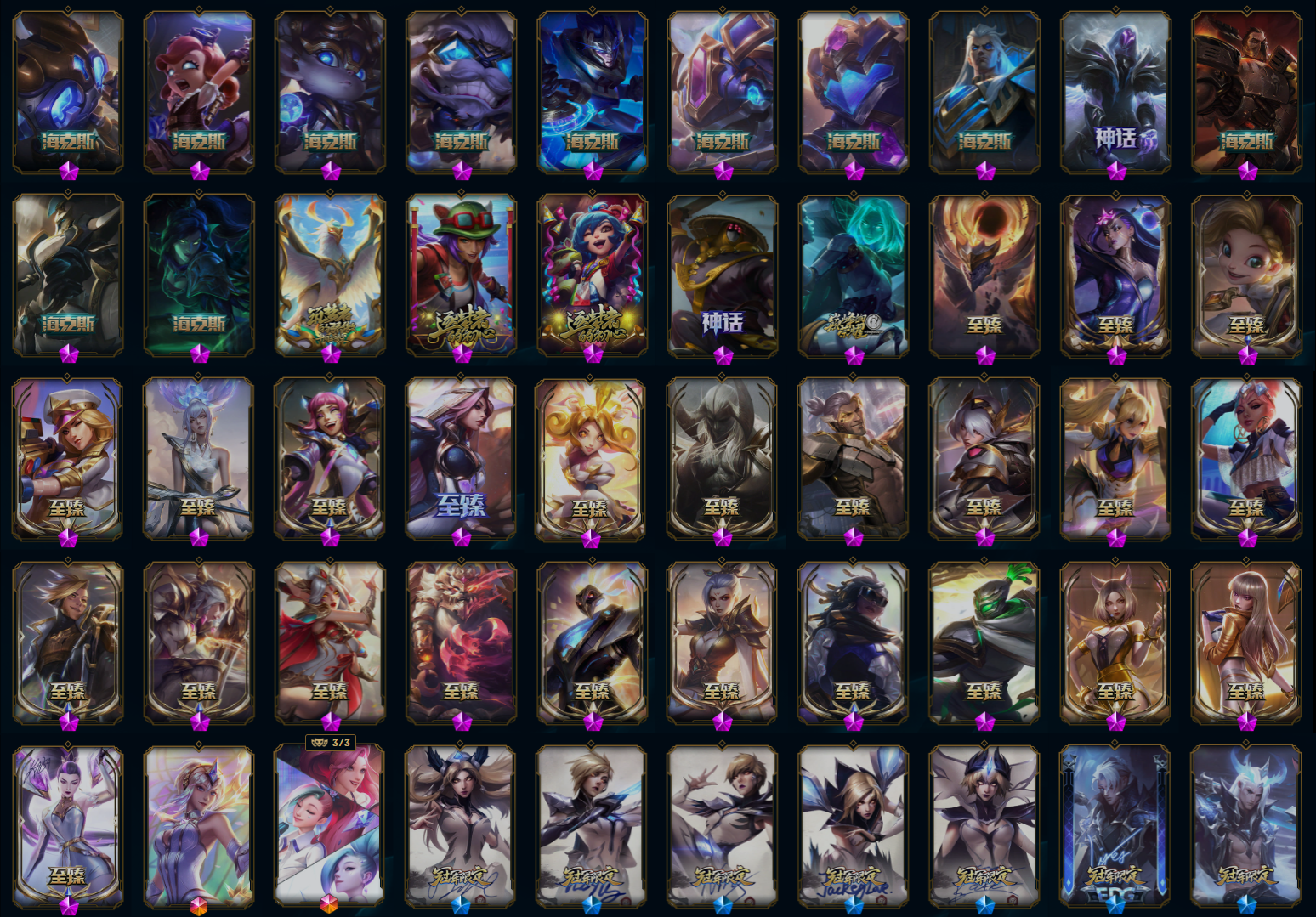 【重要皮肤】暗星女王黛安娜至臻 绝息圣堂厄运小姐至臻 海珀利安小队X09星环灵风迦娜至臻 幻灵战斗猫金克丝至臻 神凰行者烈羽焰凰霞至臻 女帝黛安娜至臻 战斗学院蕾欧娜至臻 奥术师佐伊至臻 真实伤害赛娜至臻 灵能特工伊泽瑞尔至臻 源计划逆流塞拉斯至臻 暗星墨菲特至臻 神龙尊者均衡之龙沃利贝尔至臻 征服者贾克斯至臻 KDA二代卡莎至臻 KDA一代卡莎至臻 KDA阿狸至臻 KDA阿狸2022至臻 电玩女神凯特琳至臻 电玩女神凯特琳2022至臻 星之守护者妮蔻至臻 星之守护者妮蔻2022至臻 源计划正义艾瑞莉娅至臻 源计划正义艾瑞莉娅2022至臻 真实伤害奇亚娜至臻 真实伤害奇亚娜2022至臻 玉剑传说武剑仙至臻 玉剑传说武剑仙2022至臻 腥红之月亚托克斯至臻 腥红之月亚托克斯2022至臻 未来战士锤石至臻 未来战士锤石2022至臻 灰烬骑士派克 海克斯科技安妮 海克斯科技克格莫 海克斯科技斯维因 海克斯科技吉格斯 海克斯科技波比 海克斯科技嘉文四世 海克斯科技阿木木 海克斯科技拉莫斯 新卧虎藏龙贾克斯 恐惧新星德莱厄斯 零之枪骑赫卡里姆 摄魂使者薇恩 胜利剑圣易 胜利女神希维尔 创星之灵璐璐 电玩女神厄运小姐 电玩勇者锐雯 星之守护者伊泽瑞尔 玉剑传说无影 玉剑传说舞剑仙 玉剑传说舞龙卫 玉剑传说星仙子 点心宝贝阿木木 剪纸仙灵娜美 天龙之子卡莎 天龙之子斯莫德 神龙烈焰金克丝 碧玉之牙卡西奥佩娅 你看见过我的熊猫吗安妮 玉净夜叉凯特琳 虎痴之拳蔚 征服者贾克斯 胜利女神瑟庄妮 胜利之树茂凯 胜利女神奥莉安娜 胜利枪神格雷福斯 胜利枪神卢锡安 胜利之剑亚托克斯 怦然心动凯特琳 水晶玫瑰迦娜 幽梦玫瑰伊莉丝 甜心之羽霞 甜心宝贝安妮 觅心萝莉金克丝 觅心猎手薇恩 幽梦玫瑰辛德拉 北极星使者彗 雪球也能爆炸吉格斯 圣诞捣蛋鬼金克丝 圣诞老人布隆 魄罗骑士瑟庄妮 夺命美人卡特琳娜 平安夜女神娑娜 魅惑女巫崔丝塔娜 泳池派对凯特琳 泳池派对厄运小姐 泳池派对格雷福斯 泳池派对李青 泳池派对蕾欧娜 泳池派对雷克顿 电玩战魂赫卡里姆 御星魔矢艾希 送披萨的小姐姐希维尔 EDG厄斐琉斯 EDG佛耶戈 DWG奈德丽 FPX李青 iG卡蜜尔 iG洛 iG卡莎 iG艾瑞莉娅 iG乐芙兰 iG菲奥娜 SKTT1扎克 SKTT1烬 SKTT1辛德拉 SKTT1娜美 SKTT1奥拉夫 SKTT1阿利斯塔 SKTT1瑞兹 SKTT1阿兹尔 SSW泰隆 SSW图奇 SSW辛吉德 SKTT1劫 SKTT1婕拉 SKTT1李青 暗杀星蒙多 暗杀星努努和威朗普 暗杀星慎 Fnatic迦娜 Fnatic古拉加斯 Fnatic卡尔萨斯 冰雪节玛尔扎哈 冰雪节辛吉德 防暴机器人布里茨 防暴士兵辛吉德 防暴天使凯尔 钢铁之翼艾尼维亚 冠军掠夺者卡兹克 冠军之刃锐雯 冠军之刃锐雯2016 冠军之血希瓦娜 冠军之隐劫 冠军之志瑞兹 鬼影森森茂凯 鬼影重重魔腾 红桃杰克崔斯特 胡桃夹子萨科 惊悚派对阿木木 蒙多蒙多 密林猎手提莫 南瓜头费德提克 圣诞精灵崔丝塔娜 圣诞开心鬼提莫 圣诞狂欢基兰 圣诞狂欢努努和威朗普 圣诞老人古拉加斯 圣诞玩偶波比 圣诞驯鹿克格莫 外星装甲库奇 卧虎藏龙贾克斯 无头骑士赫卡里姆 喜庆之树茂凯 幸福女神乐芙兰 雪默丁格 雪球也能爆炸吉格斯 野兽猎人德莱文 野兽猎人瑟庄妮 野兽猎人泰达米尔 英勇玩具兵普朗克 勇者奈德丽 征服者卡尔玛 征服者韦鲁斯 暗影沃里克 战场BOSS吉格斯 阿木木主人不要我了 波比的巧克力工坊 地底世界崔斯特 都铎王朝图奇 十五周年纪念希维尔 十周年纪念安妮 源代码乐芙兰 神凰行者瑞羽圣凰艾尼维亚 胜利凤凰艾尼维亚 大元素使拉克丝 灵魂守卫乌迪尔 未来战士伊泽瑞尔 武装战姬厄运小姐 KDAALLOUT萨勒芬妮独立音乐人 KDAALLOUT萨勒芬妮明日新星 KDAALLOUT萨勒芬妮超级巨星 绝息圣堂洛