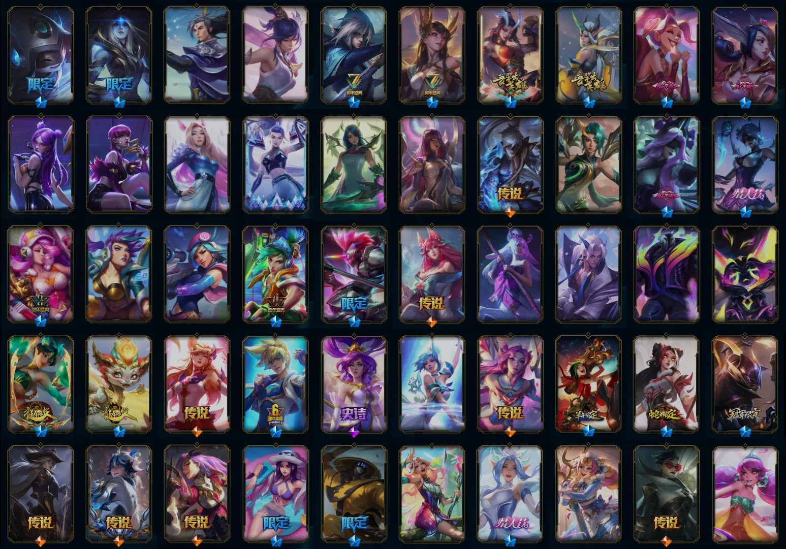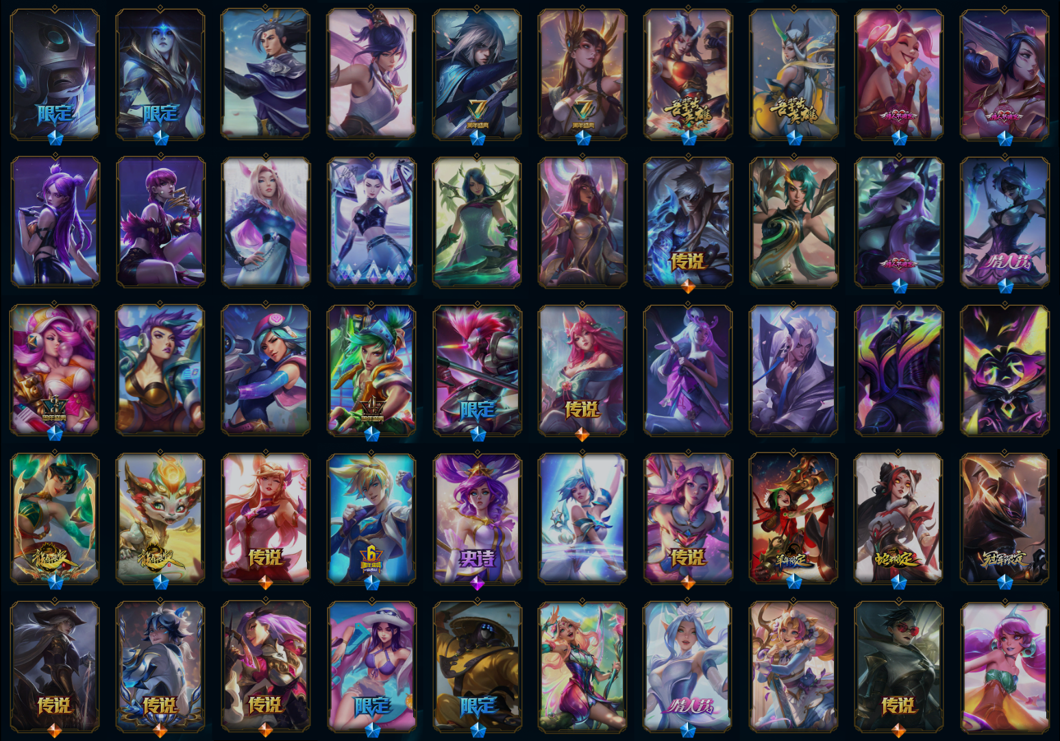 【传说皮肤】黯黑魔龙希瓦娜 黯晶凤凰艾尼维亚 暗星锤石 暗星尊烬 奥德赛凯隐 霸天零式赛恩 霸天异形卡兹克 冰川巨兽墨菲特 冰霜亚龙希瓦娜 冰霜之刃艾瑞莉娅 苍穹之光韦鲁斯 电玩女神娑娜 地狱行者孙悟空 地狱之门卫士加里奥 恶魔男爵瑞兹 钢铁之翼凯尔 光明哨兵薇恩 灌篮高手德莱厄斯 黑夜使者亚索 合金巨兽努努和威朗普 红色男爵库奇 枯萎之壤泽拉斯 炼狱魔犬内瑟斯 烈焰雄心崔丝塔娜 黎明使者锐雯 黎明使者索拉卡 灵魂莲华阿狸 灵能特工娑娜 陆地王者4WD布里茨 律政大亨蒙多 魔幻卡牌崔斯特 魔女伊芙琳 女帝卡特琳娜 女皇艾希 女警狙击凯特琳 女校长菲奥娜 女主播迦娜 偶像歌手阿狸 青花瓷伊泽瑞尔 日蚀骑士蕾欧娜 上古战魂魔腾 神龙尊者圣龙李青 神龙尊者夜月幻龙亚索 神拳李青 绅士科加斯 神王德莱厄斯 双重冰晶艾尼维亚 死亡骑士盖伦 天煞劫 铁哥们儿奥拉夫 提莫约德尔人的一大步 未来战士凯特琳 西部魔影卢锡安 西部天使艾希 邪鸦魅影乐芙兰 腥红之月鬼武姬阿卡丽 星之守护者阿狸 星之守护者金克丝 星之守护者卡莎 星之守护者霞 血石领主弗拉基米尔 驯龙炮手崔丝塔娜 驯龙学者黑默丁格 焰尾妖狐阿狸 影执事劫 银河魔装机神兰博 泳池派对吉格斯 源计划超体莫德凯撒 源计划毁灭派克 源计划净化薇恩 源计划联合艾希 源计划林易 源计划泯灭雷克顿 约德尔国队长提莫 宇航员诺提勒斯 战场女武神凯尔 战地机甲厄加特 战地巨兽科加斯 战斗学院凯特琳 战斗学院伊泽瑞尔 真实伤害艾克 最终BOSS维迦