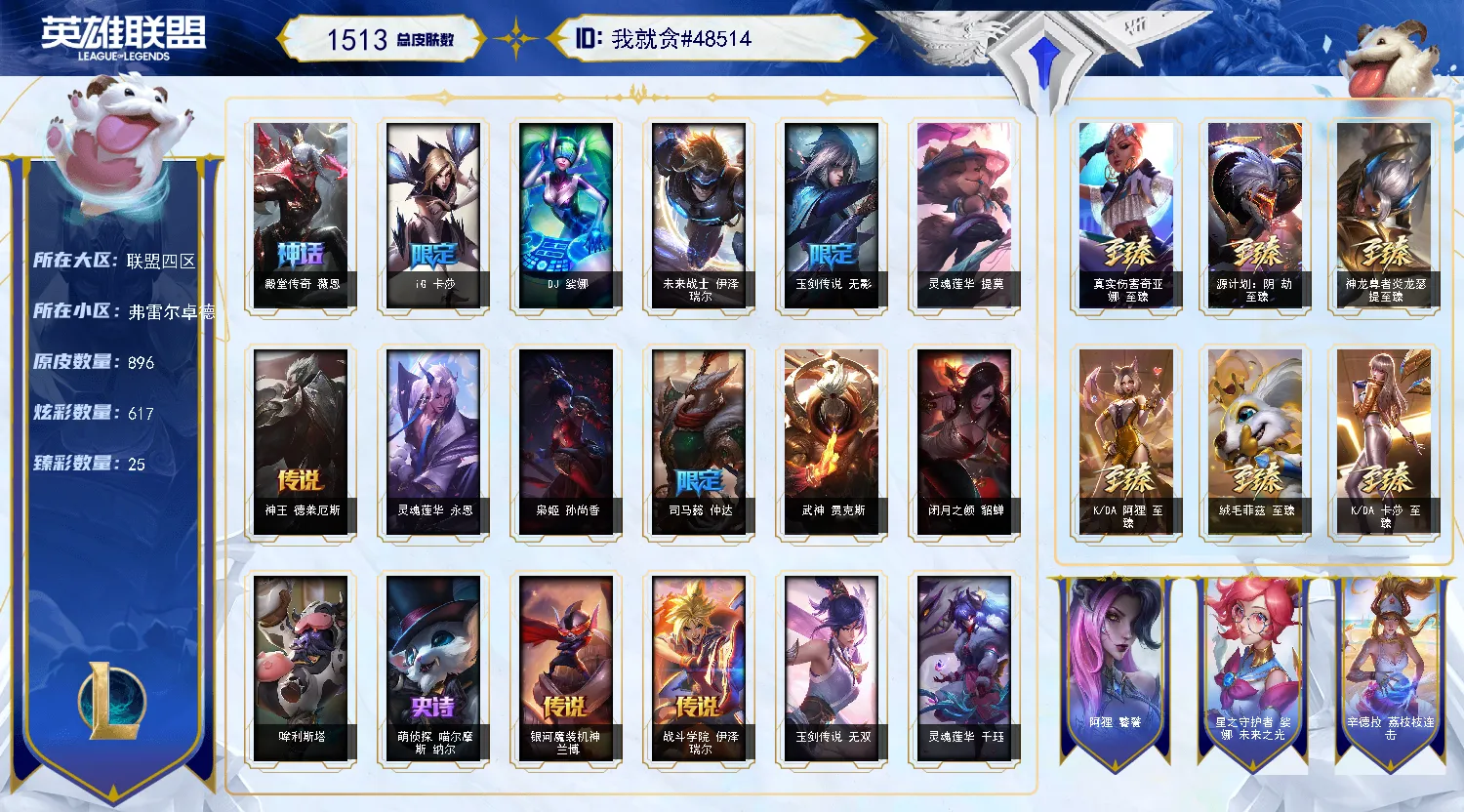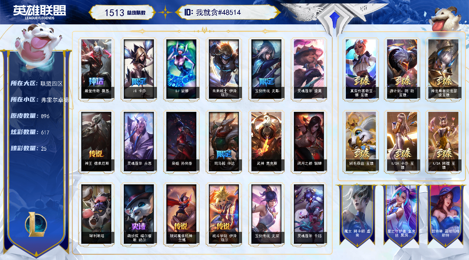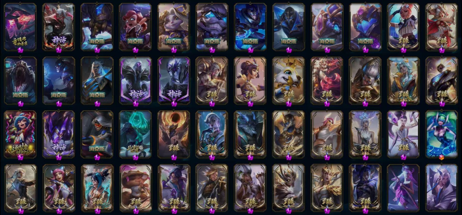 【重要皮肤】莲华温泉厄斐琉斯至臻 至高天凯尔至臻 西部魔影伊芙琳至臻 天龙之子伊泽瑞尔至臻 北极星钢影卡蜜尔至臻 玉剑传说琴仙子至臻 DRX亚托克斯至臻 墨之影武者亚索至臻 北极星使者沃里克至臻 灵魂莲华易至臻 海珀利安小队X09星环灵风迦娜至臻 星之守护者艾克至臻 西部魔影猎天使恶魔泰隆至臻 月蚀骑士赛娜至臻 幻灵战斗猫金克丝至臻 青花瓷拉克丝至臻 神凰行者烈羽焰凰霞至臻 女帝黛安娜至臻 魔女婕拉至臻 魔女乐芙兰至臻 真实伤害亚索至臻 真实伤害赛娜至臻 星之守护者索拉卡至臻 灵魂莲华提莫至臻 灵能特工伊泽瑞尔至臻 福牛守护者菲奥娜至臻 源计划逆流塞拉斯至臻 源计划阴劫至臻 暗星墨菲特至臻 神龙尊者炎龙瑟提至臻 黑夜使者凯隐至臻 神龙尊者均衡之龙沃利贝尔至臻 征服者贾克斯至臻 飞升战神潘森至臻 焰执事布兰德至臻 KDA二代卡莎至臻 KDA一代卡莎至臻 KDA阿狸至臻 KDA伊芙琳至臻 魅惑女巫厄运小姐至臻 源计划正义艾瑞莉娅至臻 真实伤害奇亚娜至臻 真实伤害奇亚娜2022至臻 绒毛菲兹至臻 绒毛菲兹2022至臻 未来战士锤石至臻 未来战士锤石2022至臻 殿堂传奇薇恩 灰烬骑士派克 灰烬杀手塞拉斯 海克斯科技安妮 海克斯科技雷克顿 海克斯科技克格莫 海克斯科技斯维因 海克斯科技吉格斯 海克斯科技玛尔扎哈 海克斯科技嘉文四世 海克斯科技阿利斯塔 海克斯科技拉莫斯 海克斯科技崔丝塔娜 水晶掠夺者卡兹克 暗星科加斯 黎明使者卡尔玛 恐惧新星德莱厄斯 摄魂使者薇恩 新创战纪希维尔 胜利女神娑娜 胜利之王泰达米尔 胜利巨口克格莫 养蜂人辛吉德 玉剑传说无影 神凰行者幽羽玄凰萨勒芬妮 玉剑传说星仙子 点心宝贝阿木木 天龙之子斯莫德 虎头虎脑崔丝塔娜 猛虎下山赵信 招财进宝提莫 神龙烈焰金克丝 你看见过我的熊猫吗安妮 北辰之威内瑟斯 南天之怒沃里克 美猴王孙悟空 紫金罗刹莫甘娜 虎痴之拳蔚 司马懿仲达 金猪烈焰瑟庄妮 烈焰美人薇恩 纳财大帝塔姆 醒狮克格莫 神龙之翼库奇 福牛守护者德莱厄斯 福牛守护者阿利斯塔 胜利女神奥莉安娜 胜利枪神卢锡安 胜利之剑亚托克斯 觅心游侠卢锡安 北极星神黛安娜 寒冬精灵璐璐 雪球也能爆炸吉格斯 冰雪驯鹿波比 冬季仙境卡尔玛 平安夜女神娑娜 大魔王提莫 海之歌泽丽 泳池派对凯特琳 泳池派对佐伊 泳池派对辛德拉 泳池派对奥莉安娜 泳池派对塔莉垭 泳池派对塔里克 泳池派对菲奥娜 泳池派对格雷福斯 泳池派对雷克顿 制胜金靴李青 制胜金球拉莫斯 FPX薇恩 iG卡莎 SSG霞 SSG纳尔 SKTT1娜美 SKTT1瑞兹 SKTT1阿兹尔 SKTT1雷克顿 SSW锤石 SSW雷恩加尔 SSW泰隆 SSW图奇 SSW辛吉德 SKTT1贾克斯 SKTT1劫 暗杀星奥莉安娜 暗杀星蒙多 暗杀星努努和威朗普 暗杀星伊泽瑞尔 暗杀星慎 Fnatic迦娜 Fnatic古拉加斯 Fnatic嘉文四世 Fnatic卡尔萨斯 冰雪节辛吉德 冰雪兽纳尔 防暴士兵辛吉德 防暴天使凯尔 冠军典狱长锤石 冠军掠夺者卡兹克 冠军之志瑞兹 鬼影森森茂凯 鬼影重重魔腾 海贼瑞兹 红桃杰克崔斯特 胡桃夹子萨科 警用试作体K9内瑟斯 蓝色忧郁崔斯特 密林猎手提莫 南瓜头费德提克 圣诞精灵崔丝塔娜 圣诞开心鬼提莫 圣诞狂欢基兰 圣诞狂欢努努和威朗普 圣诞老人古拉加斯 圣诞玩偶波比 圣诞驯鹿克格莫 外星装甲库奇 无头骑士赫卡里姆 喜庆之树茂凯 邪恶圣诞老人维迦 幸福女神乐芙兰 雪默丁格 雪装奈德丽 野兽猎人瑟庄妮 野兽猎人泰达米尔 勇者阿狸 勇者奈德丽 暗影沃里克 冠军之箭艾希 阿木木主人不要我了 2021全球总决赛嘉文四世 波比的巧克力工坊 都铎王朝图奇 十五周年纪念希维尔 十周年纪念安妮 源代码乐芙兰 神凰行者瑞羽圣凰艾尼维亚 机神白虎贾克斯 机神青龙德莱文 机神玄武盖伦 机神朱雀蕾欧娜 暗裔英雄盖伦 DJ娑娜 未来战士伊泽瑞尔 魔女娜美