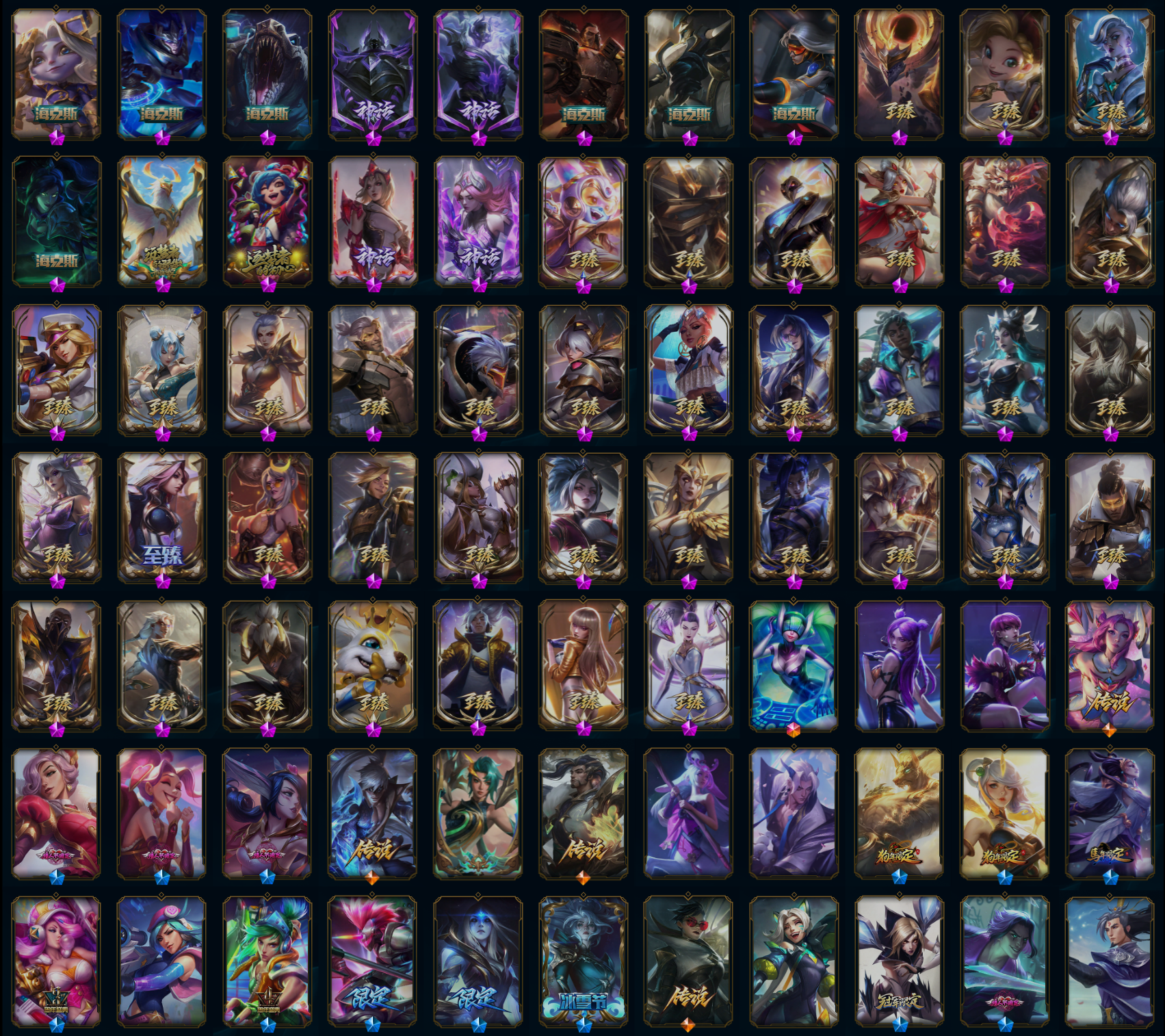 【传说皮肤】丧尸布兰德 屠龙勇士潘森 太空律动律动队长提莫 霸天零式赛恩 黎明使者索拉卡 战斗学院凯特琳 苹果机器人布里茨 黎明使者永恩 血石领主弗拉基米尔 苍穹之光韦鲁斯 女警狙击凯特琳 第三类接触黑默丁格 钢铁之翼凯尔 神龙尊者圣龙李青 神王德莱厄斯 西部天使艾希 蔷薇绅士杰斯 真实伤害艾克 恶魔之刃泰达米尔 源计划超体莫德凯撒 源计划毁灭派克 战地机甲厄加特 魔幻卡牌崔斯特 偶像歌手阿狸 黯黑魔龙希瓦娜 暗星锤石 冰川巨兽墨菲特 魔女伊芙琳 光明哨兵薇恩 黑夜使者亚索 驯龙学者黑默丁格 未来战士凯特琳 红色男爵库奇 绅士科加斯 西部天使赛娜 腥红之月鬼武姬阿卡丽 源计划联合艾希 律政大亨蒙多 约德尔国队长提莫 女皇艾希 上古战魂魔腾 战场女武神凯尔 源计划净化薇恩 霸天异形卡兹克 源计划林易 焰尾妖狐阿狸 铁哥们儿奥拉夫 黎明使者锐雯 星之守护者卡莎 邪鸦魅影乐芙兰 提莫约德尔人的一大步 神拳李青 泳池派对吉格斯 恶魔男爵瑞兹 黯晶凤凰艾尼维亚 最终BOSS维迦 枯萎之壤泽拉斯 女校长菲奥娜 地狱之门卫士加里奥 神龙尊者昼日真龙亚索 大天使长米迦勒凯尔 合金巨兽努努和威朗普 电玩女神娑娜 陆地王者4WD布里茨 灌篮高手德莱厄斯 暗星尊烬 星之守护者金克丝 驯龙炮手崔丝塔娜 西部魔影卢锡安 天煞劫 双重冰晶艾尼维亚 奥德赛凯隐 战地巨兽科加斯 烈焰雄心崔丝塔娜 金牌主播德莱文 地狱行者孙悟空 炼狱魔犬内瑟斯 女主播迦娜 符文战熊沃利贝尔 冰霜之刃艾瑞莉娅 冰霜亚龙希瓦娜 鬼魂新娘莫甘娜 源计划泯灭雷克顿 宇航员诺提勒斯