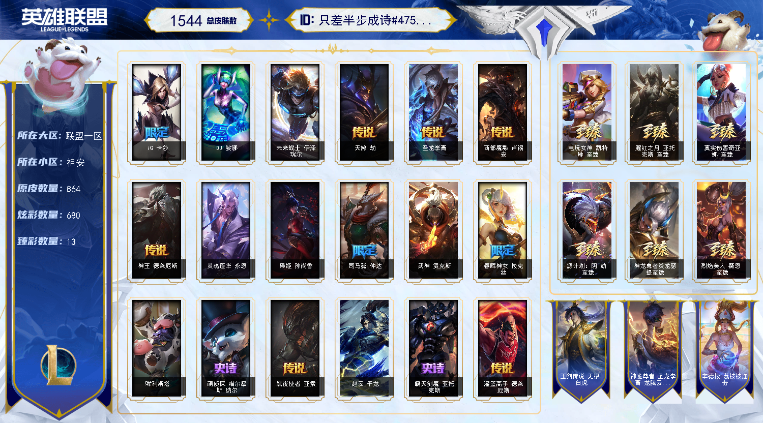【重要皮肤】北极星钢影卡蜜尔至臻 心之钢永恩至臻 魔女阿卡丽至臻 玉剑传说琴仙子至臻 斗魂觉醒派克至臻 墨之影武者亚索至臻 花仙使者卡特琳娜至臻 绝息圣堂厄运小姐至臻 青花瓷丽桑卓至臻 星之守护者辛德拉至臻 星之守护者艾克至臻 神凰行者烈羽焰凰霞至臻 女帝黛安娜至臻 太空律动璐璐至臻 魔女乐芙兰至臻 奥术师佐伊至臻 未来战士卢锡安至臻 真实伤害亚索至臻 灵能特工伊泽瑞尔至臻 源计划逆流塞拉斯至臻 源计划阴劫至臻 王国机神玄武盖伦至臻 暗星墨菲特至臻 神龙尊者炎龙瑟提至臻 黑夜使者凯隐至臻 神龙尊者均衡之龙沃利贝尔至臻 KDA二代卡莎至臻 KDA一代卡莎至臻 烈焰美人薇恩至臻 电玩女神凯特琳至臻 电玩女神凯特琳2022至臻 魅惑女巫厄运小姐至臻 源计划正义艾瑞莉娅至臻 真实伤害奇亚娜至臻 真实伤害奇亚娜2022至臻 绒毛菲兹至臻 绒毛菲兹2022至臻 玉剑传说武剑仙至臻 腥红之月亚托克斯至臻 腥红之月亚托克斯2022至臻 未来战士锤石至臻 未来战士锤石2022至臻 黑夜使者李青至臻 灰烬守护者慎 灰烬骑士莫德凯撒 海克斯科技安妮 海克斯科技瑟庄妮 海克斯科技雷克顿 海克斯科技嘉文四世 海克斯科技阿木木 海克斯科技崔丝塔娜 水晶圣骑艾希 水晶圣骑蕾欧娜 恐惧新星德莱厄斯 零之枪骑赫卡里姆 摄魂使者薇恩 新创战纪希维尔 胜利女神希维尔 胜利巨口克格莫 钢铁军团拉克丝 电玩女神厄运小姐 电玩勇者锐雯 玉剑传说神机花火 玉剑传说无劫 碧玉之牙卡西奥佩娅 春晖神女拉克丝 北辰之威内瑟斯 南天之怒沃里克 玉净夜叉凯特琳 广寒仙子嫦娥 司马懿仲达 金猪烈焰瑟庄妮 烈焰美人薇恩 纳财大帝塔姆 神龙之翼库奇 福牛守护者嘉文四世 胜利女神瑟庄妮 胜利之树茂凯 胜利女神奥莉安娜 胜利枪神格雷福斯 胜利枪神卢锡安 胜利女神莫甘娜 胜利之剑亚托克斯 甜心之羽霞 穿心之剑菲奥娜 觅心游侠卢锡安 觅心魔灵奥莉安娜 觅心女王艾希 觅心萝莉金克丝 幽梦玫瑰泰隆 水晶玫瑰婕拉 北极星守护者赫卡里姆 北极星神黛安娜 圣诞老人德莱文 冰雪女神辛德拉 魄罗骑士瑟庄妮 夺命美人卡特琳娜 平安夜女神娑娜 圣诞糖果棒厄运小姐 死亡誓约劫 泳池派对奥莉安娜 泳池派对嘉文四世 泳池派对菲奥娜 泳池派对格雷福斯 泳池派对蕾欧娜 泳池派对雷克顿 电玩战魂赫卡里姆 御星魔矢艾希 创战纪希维尔 克格汪 DWG烬 FPX薇恩 FPX墨菲特 iG卡莎 SSG纳尔 SSG嘉文四世 SKTT1烬 SKTT1娜美 SKTT1奥拉夫 SKTT1卡莉丝塔 SKTT1伊莉丝 SSW雷恩加尔 SSW泰隆 SSW辛吉德 SKTT1劫 SKTT1李青 暗杀星奥莉安娜 暗杀星蒙多 暗杀星努努和威朗普 Fnatic迦娜 Fnatic库奇 Fnatic古拉加斯 Fnatic嘉文四世 Fnatic卡尔萨斯 冰雪节格雷福斯 冰雪节辛吉德 防暴士兵格雷福斯 防暴士兵辛吉德 防暴天使凯尔 钢铁之翼艾尼维亚 冠军之血希瓦娜 冠军之隐劫 春晖海神卡兹克 鬼影森森茂凯 鬼影重重魔腾 海贼瑞兹 红桃杰克崔斯特 警用试作体K9内瑟斯 蓝色忧郁崔斯特 密林猎手提莫 南瓜头费德提克 女猎手希维尔 圣诞精灵崔丝塔娜 圣诞开心鬼提莫 圣诞狂欢基兰 圣诞老人古拉加斯 圣诞玩偶波比 圣诞驯鹿克格莫 外星装甲库奇 无头骑士赫卡里姆 喜庆之树茂凯 邪恶圣诞老人维迦 幸福女神乐芙兰 雪默丁格 野兽猎人德莱文 英勇玩具兵普朗克 勇者奈德丽 征服者韦鲁斯 暗影沃里克 机械迷城加里奥 诺斯费拉图弗拉基米尔 战场BOSS吉格斯 阿木木主人不要我了 2021全球总决赛嘉文四世 波比的巧克力工坊 都铎王朝图奇 十周年纪念安妮 源代码乐芙兰 神凰行者瑞羽圣凰艾尼维亚 胜利凤凰艾尼维亚 DJ娑娜 灵魂守卫乌迪尔 未来战士伊泽瑞尔 绝息圣堂洛