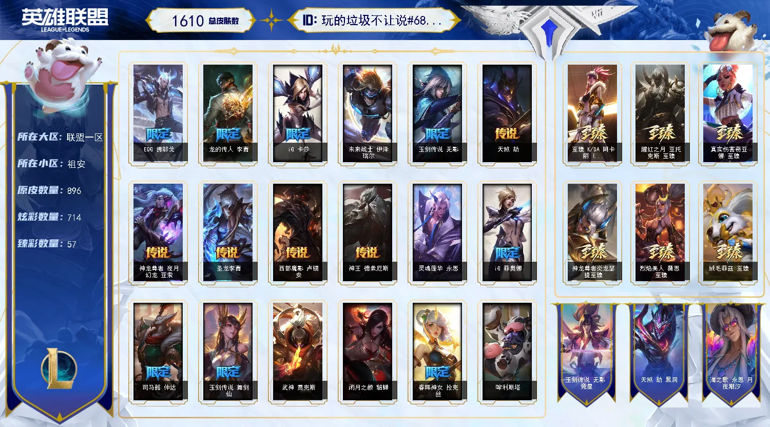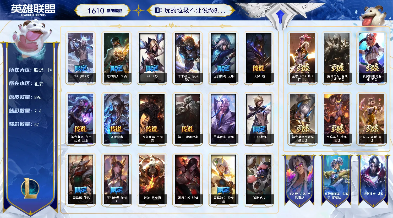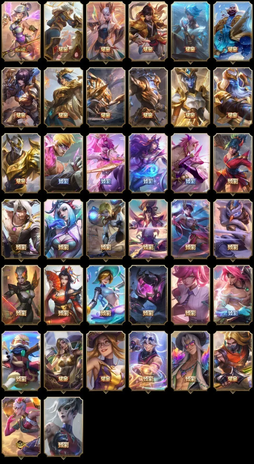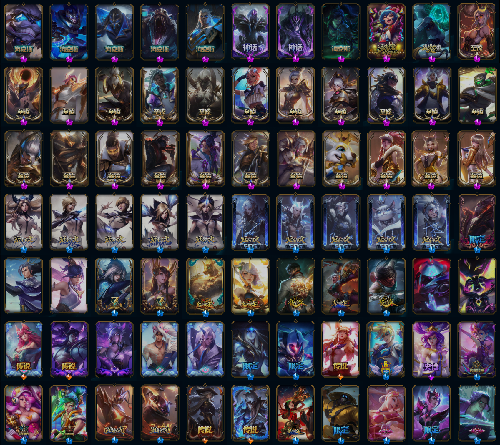 【重要皮肤】灵魂莲华易至臻 星之守护者艾克至臻 西部魔影猎天使恶魔泰隆至臻 女帝黛安娜至臻 未来战士卢锡安至臻 真实伤害亚索至臻 真实伤害赛娜至臻 灵能特工伊泽瑞尔至臻 福牛守护者菲奥娜至臻 王国机神玄武盖伦至臻 暗星墨菲特至臻 神龙尊者炎龙瑟提至臻 征服者贾克斯至臻 KDA一代卡莎至臻 KDA卡莎2022至臻 KDA阿狸至臻 KDA阿狸2022至臻 KDA阿卡丽至臻 KDA阿卡丽2022至臻 烈焰美人薇恩至臻 烈焰美人薇恩2022至臻 源计划正义艾瑞莉娅至臻 源计划正义艾瑞莉娅2022至臻 真实伤害奇亚娜至臻 真实伤害奇亚娜2022至臻 绒毛菲兹至臻 绒毛菲兹2022至臻 玉剑传说武剑仙至臻 玉剑传说武剑仙2022至臻 腥红之月亚托克斯至臻 腥红之月亚托克斯2022至臻 黑夜使者李青至臻 黑夜使者李青2022至臻 灰烬骑士派克 灰烬征服者潘森 海克斯科技雷克顿 海克斯科技斯维因 海克斯科技吉格斯 海克斯科技嘉文四世 摄魂使者薇恩 胜利女神希维尔 黑夜使者弗拉基米尔 电玩女神厄运小姐 电玩勇者锐雯 星之守护者伊泽瑞尔 玉剑传说无影 玉剑传说舞剑仙 星之守护者佐伊 灵能特工易 龙的传人李青 银龙裁决泰隆 替父从军花木兰 神龙烈焰金克丝 碧玉之牙卡西奥佩娅 春晖神女拉克丝 北辰之威内瑟斯 南天之怒沃里克 美猴王孙悟空 玉净夜叉凯特琳 司马懿仲达 胜利之树茂凯 胜利女神奥莉安娜 胜利枪神格雷福斯 胜利枪神卢锡安 胜利女神莫甘娜 胜利之剑亚托克斯 碎心之拳蔚 甜心宝贝娑娜 觅心游侠卢锡安 幽梦玫瑰泰隆 冬境仙灵索拉卡 雪球也能爆炸吉格斯 冰雪驯鹿波比 冬季仙境卡尔玛 持胡萝卜的雪人易 狂心冰王图奇 冰雪女神辛德拉 魄罗骑士瑟庄妮 平安夜女神娑娜 圣诞糖果棒厄运小姐 魅惑女巫迦娜 魅惑女巫奈德丽 伯爵卡萨丁 死亡誓约卡特琳娜 死亡誓约劫 死亡誓约维克托 海之歌永恩 泳池派对奥莉安娜 泳池派对塔莉垭 泳池派对格雷福斯 泳池派对李青 泳池派对雷克顿 斩星魔剑易 御星魔矢艾希 克格汪 制胜金靴李青 EDG厄斐琉斯 EDG佛耶戈 EDG格雷福斯 EDG悠米 EDG佐伊 FPX锤石 FPX薇恩 FPX李青 FPX普朗克 FPX墨菲特 iG卡蜜尔 iG洛 iG卡莎 iG艾瑞莉娅 iG乐芙兰 iG菲奥娜 SSG洛 SSG纳尔 SKTT1烬 SKTT1辛德拉 SKTT1娜美 SKTT1瑞兹 SKTT1伊莉丝 SSW雷恩加尔 SSW图奇 SSW辛吉德 SKTT1婕拉 SKTT1薇恩 暗杀星蒙多 暗杀星努努和威朗普 暗杀星慎 Fnatic迦娜 Fnatic库奇 Fnatic古拉加斯 Fnatic嘉文四世 冰雪节格雷福斯 冰雪节玛尔扎哈 冰雪节辛吉德 防暴士兵格雷福斯 防暴士兵辛吉德 防暴天使凯尔 钢铁之翼艾尼维亚 冠军典狱长锤石 冠军掠夺者卡兹克 冠军之矛卡莉丝塔 冠军之刃锐雯 冠军之刃锐雯2016 冠军之血希瓦娜 冠军之隐劫 冠军之志瑞兹 鬼影森森茂凯 鬼影重重魔腾 海贼瑞兹 红桃杰克崔斯特 胡桃夹子萨科 惊悚派对阿木木 惊悚派对费德提克 蓝色忧郁崔斯特 蒙多蒙多 密林猎手提莫 南瓜头费德提克 女猎手希维尔 圣诞精灵崔丝塔娜 圣诞开心鬼提莫 圣诞狂欢基兰 圣诞狂欢努努和威朗普 圣诞老人古拉加斯 圣诞玩偶波比 圣诞驯鹿克格莫 糖果使徒费德提克 外星装甲库奇 卧虎藏龙贾克斯 无头骑士赫卡里姆 喜庆之树茂凯 邪恶圣诞老人维迦 幸福女神乐芙兰 雪默丁格 雪球也能爆炸吉格斯 野兽猎人德莱文 野兽猎人泰达米尔 英勇玩具兵普朗克 勇者阿狸 勇者奈德丽 征服者韦鲁斯 暗影沃里克 机械迷城加里奥 阿木木主人不要我了 波比的巧克力工坊 地底世界崔斯特 都铎王朝图奇 十周年纪念安妮 源代码乐芙兰 未来战士伊泽瑞尔