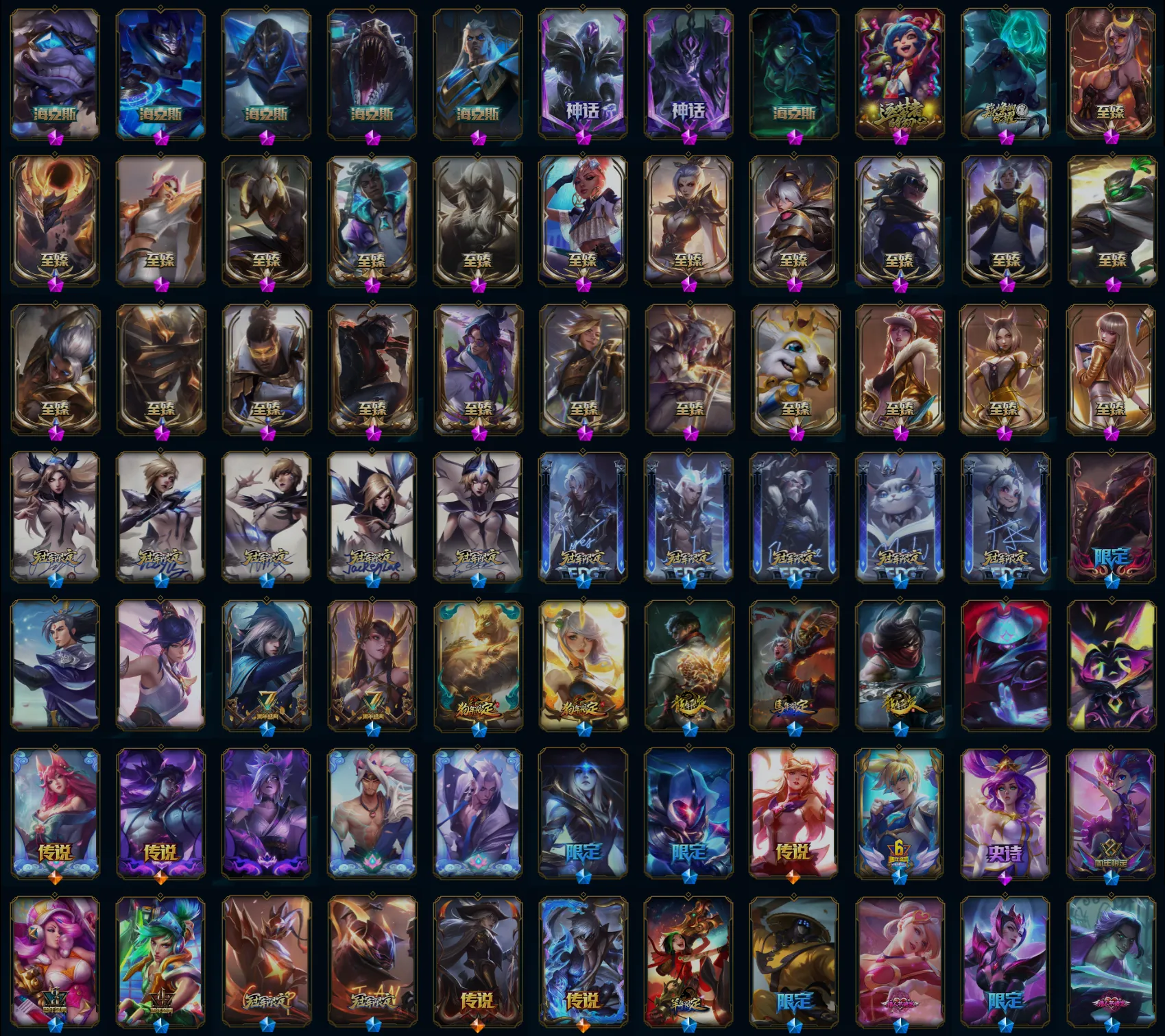 【传说皮肤】银河魔装机神兰博 黎明使者锐雯 魔女伊芙琳 地狱行者孙悟空 光明哨兵格雷福斯 黎明使者永恩 神龙尊者夜月幻龙亚索 神龙尊者圣龙李青 冰霜之刃艾瑞莉娅 灵魂莲华阿狸 灵魂莲华锤石 天煞劫 偶像歌手阿狸 星之守护者霞 战斗学院伊泽瑞尔 真实伤害艾克 源计划毁灭派克 约德尔国队长提莫 钢铁之翼凯尔 驯龙学者黑默丁格 苍穹之光韦鲁斯 焰尾妖狐阿狸 女皇艾希 泳池派对吉格斯 合金巨兽努努和威朗普 霸天零式赛恩 西部天使艾希 陆地王者4WD布里茨 奥德赛凯隐 最终BOSS维迦 战地机甲厄加特 地狱之门卫士加里奥 丧尸布兰德 冰川巨兽墨菲特 星之守护者阿狸 上古战魂魔腾 神拳李青 星之守护者拉克丝 电玩女神娑娜 宇航员诺提勒斯 女校长菲奥娜 暗星锤石 欧米伽小队幽灵特工 星之守护者金克丝 双重冰晶艾尼维亚 黯晶凤凰艾尼维亚 符文战熊沃利贝尔 西部魔影卢锡安 神王德莱厄斯 神王盖伦 律政大亨蒙多 鬼魂新娘莫甘娜 腥红之月鬼武姬阿卡丽 血石领主弗拉基米尔 源计划净化薇恩 第三类接触黑默丁格 战地巨兽科加斯 死亡骑士盖伦 屠龙勇士潘森 炼狱魔犬内瑟斯 女警狙击凯特琳 女主播迦娜 烈焰雄心崔丝塔娜 铁哥们儿奥拉夫 绅士科加斯 驯龙炮手崔丝塔娜 红色男爵库奇 魔幻卡牌崔斯特 灌篮高手德莱厄斯 黑夜使者亚索 提莫约德尔人的一大步 恶魔男爵瑞兹 恶魔之刃泰达米尔 蔷薇绅士杰斯 金牌主播德莱文 霸天异形卡兹克 枯萎之壤泽拉斯 黯黑魔龙希瓦娜 大天使长米迦勒凯尔 战场女武神凯尔 源计划林易