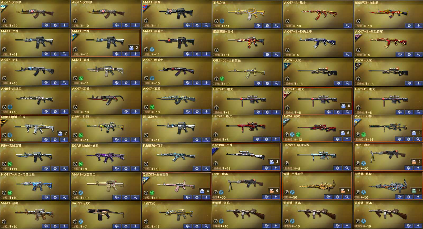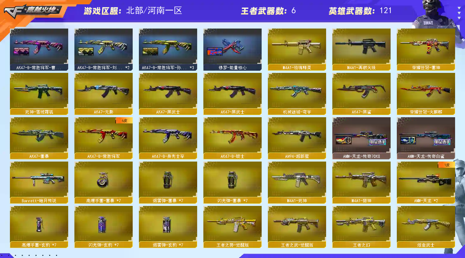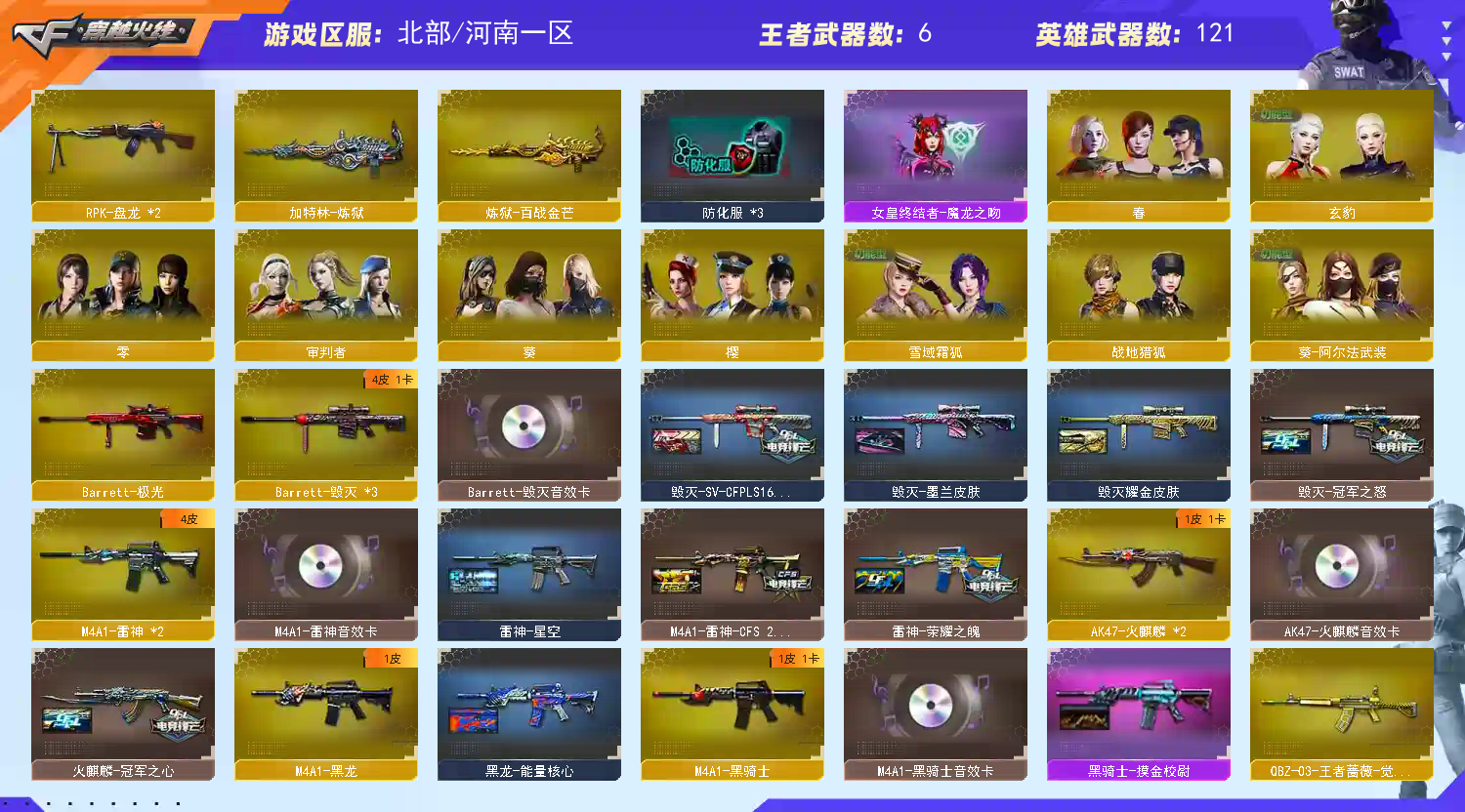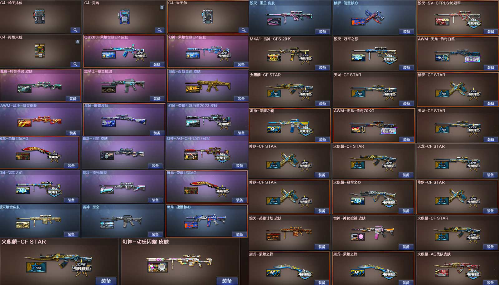 多四防角色,各种皮肤武器光效玩偶道具,欢迎来体验!武器太多,截不了那么多图!【此号全部装备太多截不了太多图,还有很多神器未截图,普通CF点武器也是一百多个就不截图了(满背包满道具爆破、生化、挑战武器应有尽有多个玩偶主流武器多光效),主流枪械都有皮肤】