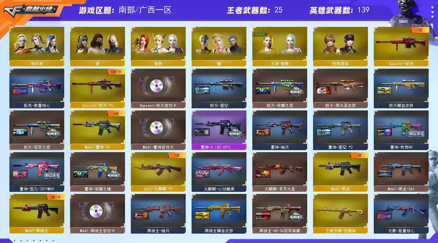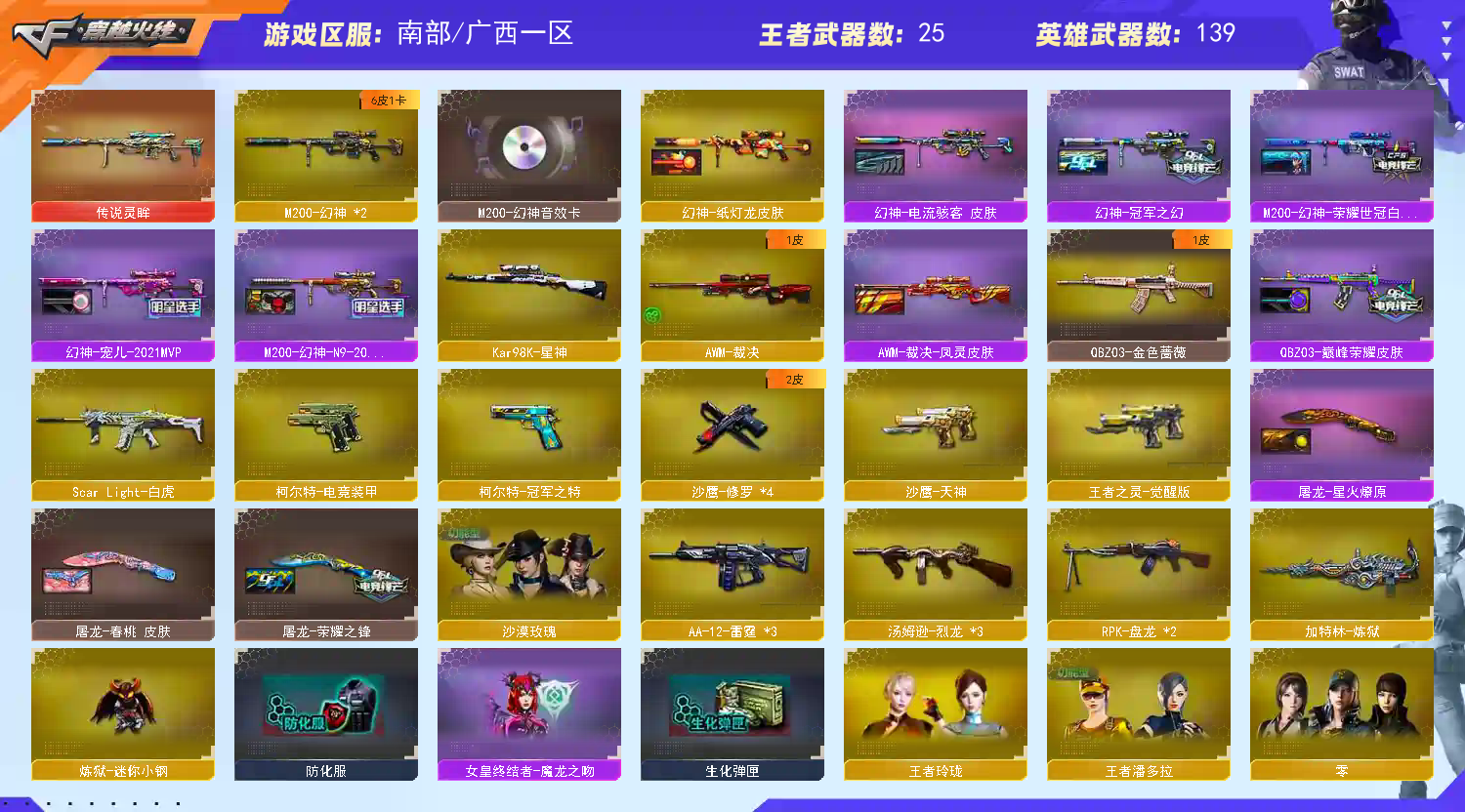 【重要武器皮肤】幻神-电流骇客 皮肤/幻神-纸灯龙皮肤/M200-幻神-荣耀世冠白鲨/M200-幻神-N9-2022MVP/幻神-宠儿-2021MVP/幻神-冠军之幻/极光-能量核心/雷神-R.LGD-CFPLS18冠军/黑骑士-AG-S4冠军典藏/QBZ03-巅峰荣耀皮肤/毁灭-冠军之怒/擎天-冠军之击/龙啸-冠军之啸/毁灭-星空/毁灭-荣耀之怒/毁灭耀金皮肤/毁灭-黑大圣皮肤/AWM-天龙-传奇白鲨/天龙-CFSTAR/天龙-能量核心/雷神-宠儿-2019MVP/雷神-传奇N9/雷神-荣耀之魄/雷神-暗月/雷神-星空/黑骑士耀金皮肤/黑骑士-暗月/黑龙-暗月/M4A1-黑龙-361/火麒麟-CFSTAR/火麒麟-AG/火麒麟-平天大圣/火麒麟-心动糖果/无影-霓裳皮肤/无影-能量核心/无影耀金皮肤/AK-47-雷神/战神-流金岁月皮肤/战神-紫绶金章皮肤/战神-粉色甜心皮肤/修罗-星空/修罗-CFSTAR/修罗-能量核心/麒麟刺-甜蜜糖果 皮肤/屠龙-春桃 皮肤/屠龙-荣耀之锋/屠龙-星火燎原