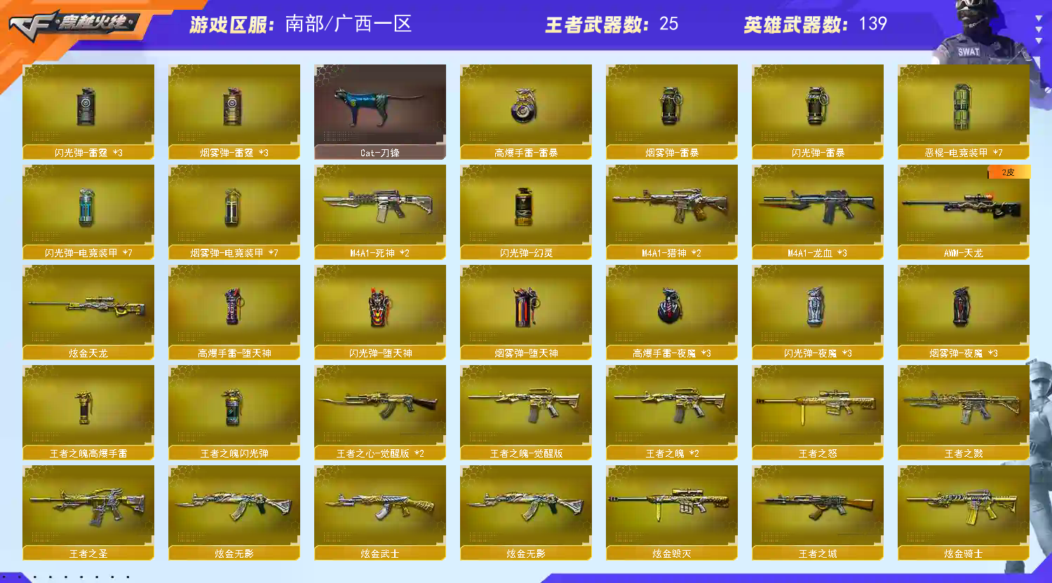 【其他重要武器】炫金超新星/炫金武士/炫金无影/炫金骑士/炫金天龙/炫金毁灭/炫金天神/炫金修罗/机械青龙/M4A1-十二生肖·龙-雷神/冰龙粉碎者-白马银枪(2)/激光毁灭者III(2)/激光毁灭者III-白马银枪/AK47-轮回/AK47-十二生肖-蛇(2)/AT15-万圣节/AK47-SS-枪王排位/黄金AK-47(5)/AK47-枪娘/AK12-幽灵/M4A1-樱/M4A1-破空冰刃/AK47-肯德基/M4A1-SS-枪王排位/AK47-B-十周年(2)/AK47-樱花/AK47-十年火线(2)/HK417-红龙/M4A1-樱花/AK-12-CFS2017纪念版/雷神-赛博朋克(2)/AK-47-红龙/红龙AK47/QBZ03-锋芒破茧/M4A1C-死亡之翼/M4A1-XS-翔龙/AK47-苍龙/金色小号/M4A1-电音(2)/AK-12-恶棍/M4A1-C-海浪(2)/XM8-炫彩/M4A1-圣诞2021(2)/AK47-QT/9A91-平安夜/AK47-娜塔莎(2)/AK-47-二次元(2)/AK47-大帝林肯/G3A3-SS-枪王排位/AK103-神秘黑洞/M4CQBR-AP-孔明/M4A1-S-火种/百城M4A1/百城AK47/AWM-S/AWM-万圣节刀锋/AWM-圣诞/M200-情人节2019/M200-赤血龙魂(3)/暗金M200/M200-万圣节/M200-圣诞/雷蛇AWM/AWM-2018圣诞/巴雷特-情人节2020/破天狂龙/AWM-T(2)/凤凰之力/AWM-Red/M200-落樱/Barrett-苍龙/蓝色魅影/AWM-红色悦动/98K-火线13周年/黄金AWM/AWM-银月/AWM-A-十周年wegame/Barrett-怒火大圣/破天九龙/AWM-枪娘/暗金AWM/Barrett-孔明/M200-青花瓷/M200-青帝/AWM-盛典-CFS 2022/M200-萌杀/M82A1-青龙/AWM-卡通/KAC-圣炎切割者III/巨龙咆哮Ⅲ(2)/KAC-赤烛/阿梅利轻机枪-暗夜风暴/Steyr TMP-CFS2020纪念版/EVO III-赤血龙魂(5)/EVO3A1-火线13周年/P90-炫彩/神圣爆裂者(2)/SPAS-12-雷电核心(2)/Spas-12-幻能朋克/柯尔特-赛博朋克/修罗-年鹏/阐释者III/凤凰之火(3)/COP 357--绚樱(2)/新USP-枪王排位奖励(3)/沙漠之鹰-A-摸金校尉/凤凰之灵(2)/沙鹰-青龙(2)/沙鹰-雷蛇/愤怒的公牛-朋克/COP357-绚樱-圣诞/COP357-十二生肖·羊/Anaconda-情人节2021/COP 357-万圣节2020/COP 357-平天大圣/新USP-怒火大圣(2)/迷彩沙鹰-70KG(2)/愤怒公牛左轮-枪王排位/沙鹰-枪王排位/Cop357-萌杀/柯尔特-百城/USP-黑大圣/丛林匕首-卧龙(4)/尼泊尔-炎龙/尼泊尔军刀-9周年/军用铁锹-飞龙在天(2)/军用铁锹-赤龙(2)/Knife-冠军之刃/尼泊尔军刀-战龙/无畏之矛/斩魔刀-怒火大圣/唐刀-九五至尊/魔能镰刀/尼泊尔-CFS 2020/尼泊尔-庆典-CFS 2021/猫猫手套/雷神之怒-机甲核心/闪光弹-枪王排位(2)/手雷-能量核心(2)/胜利奖杯烟雾弹-枪王排位/红色诅咒娃娃手雷