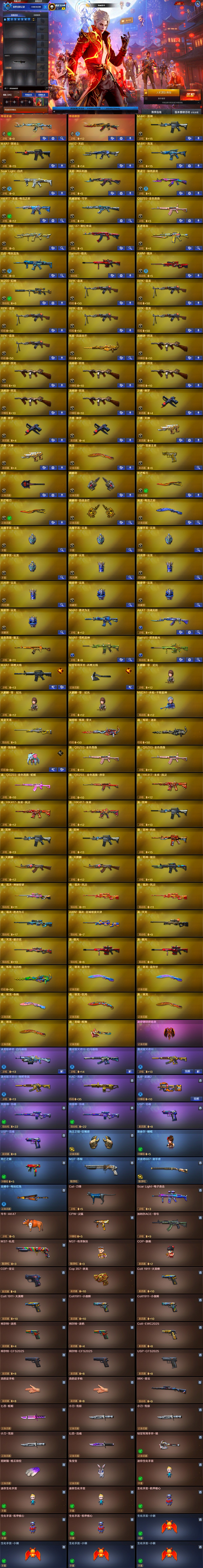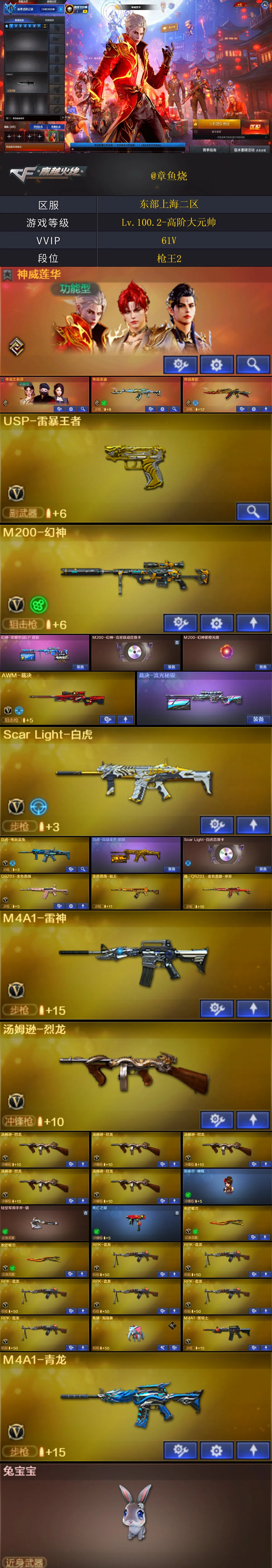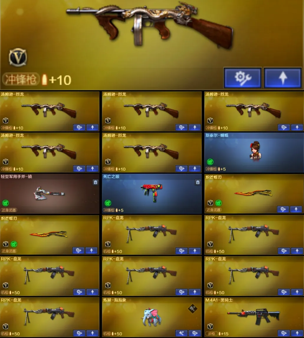 【稀有武器】:传说夜影/M200-幻神/ScarLight-白虎/M4A1-青龙/QBZ03-金色蔷薇/M4A1-黑骑士/白虎-电玩蓝兔/Barrett-极光/AWM-裁决/RPK-盘龙(6)/汤姆逊-烈龙(6)/炽芒蝶刃