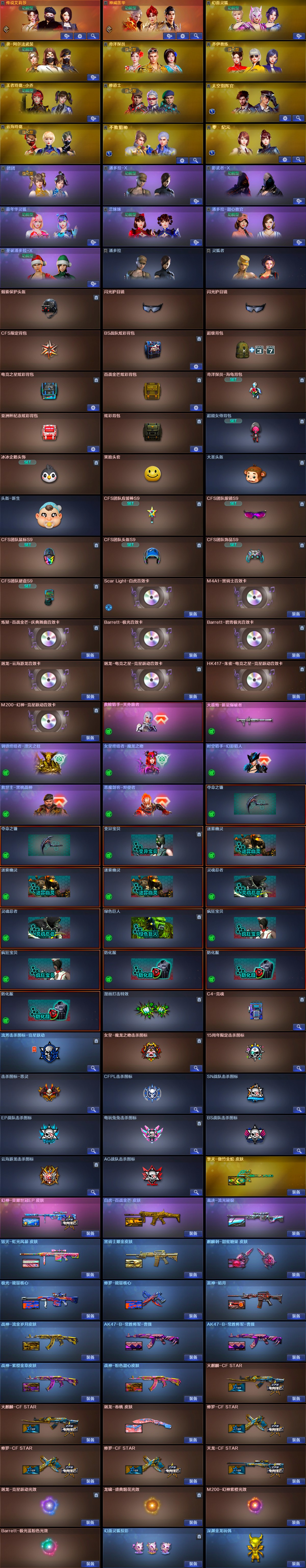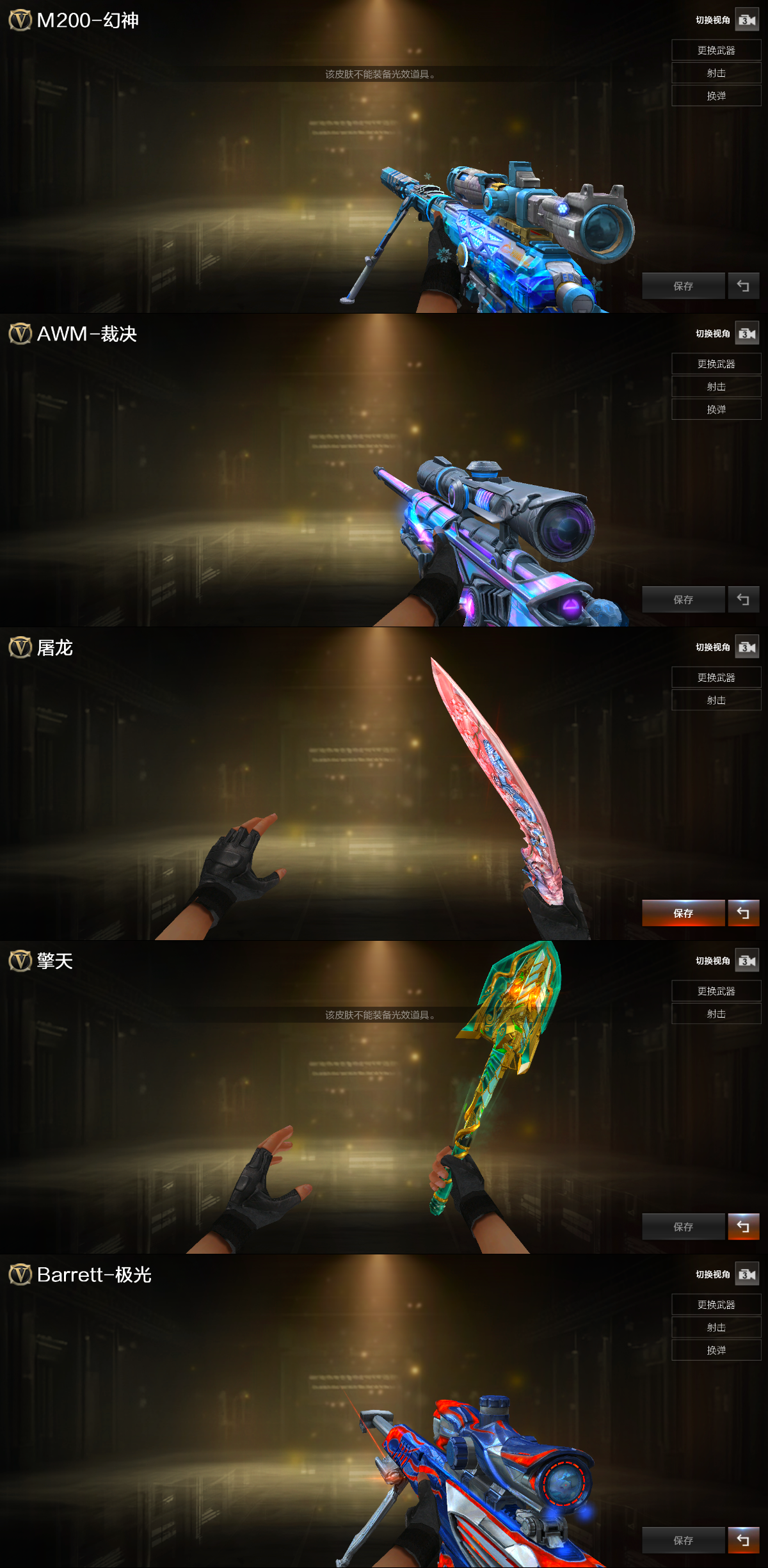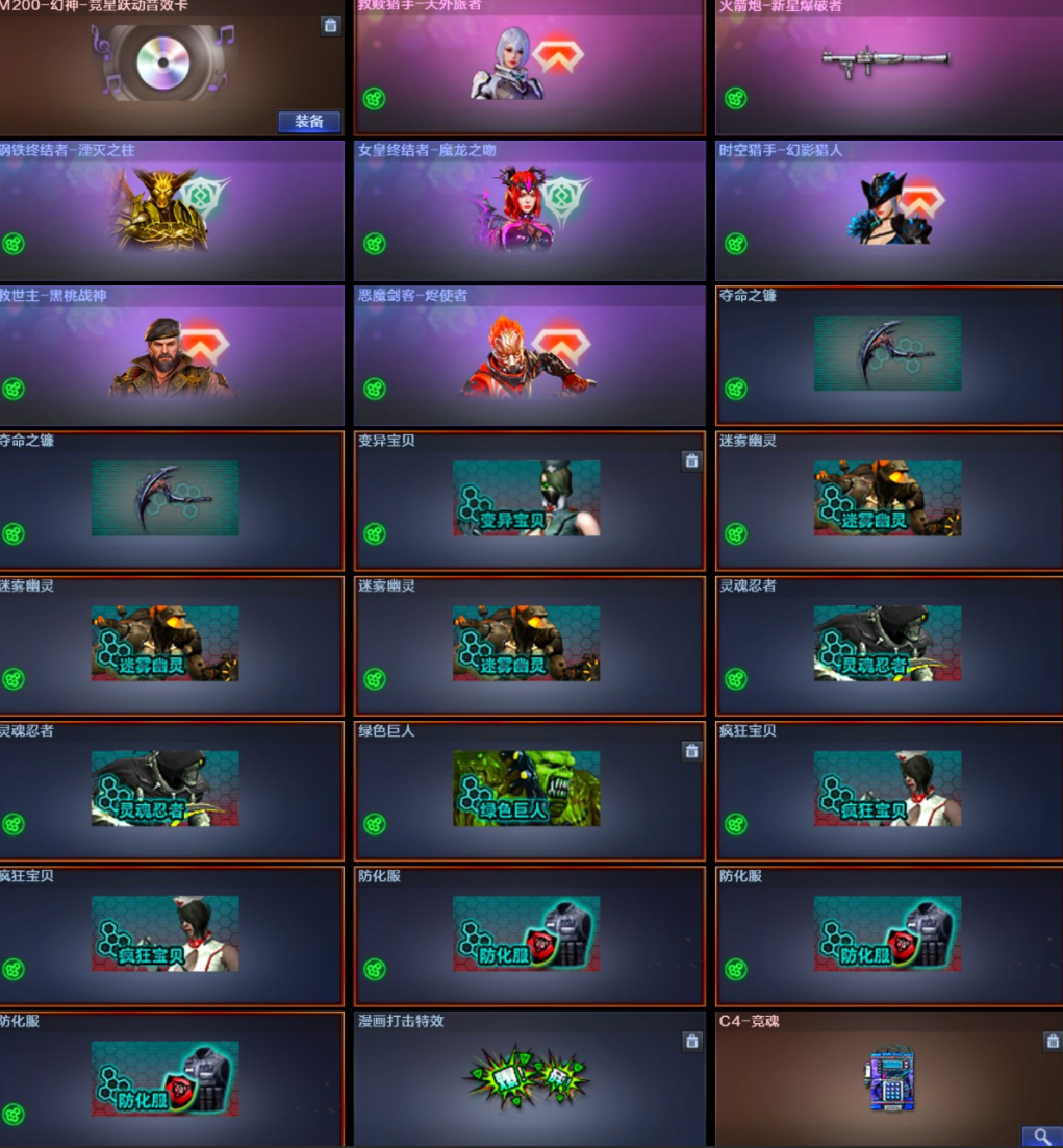 【稀有武器】:传说夜影/M200-幻神/ScarLight-白虎/M4A1-青龙/QBZ03-金色蔷薇/M4A1-黑骑士/白虎-电玩蓝兔/Barrett-极光/AWM-裁决/RPK-盘龙(6)/汤姆逊-烈龙(6)/炽芒蝶刃