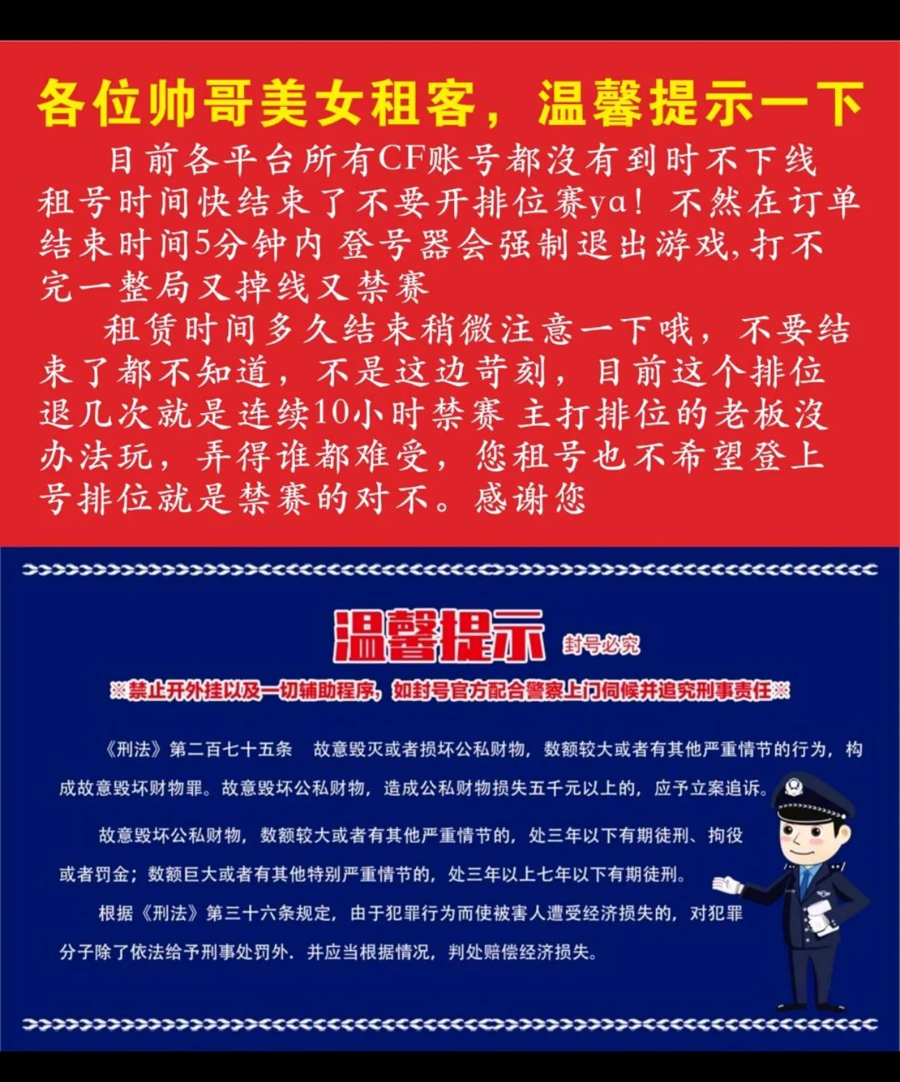 【订单时间快到了禁止再开排位赛,导致账号禁赛的租客将被永久拉黑!]