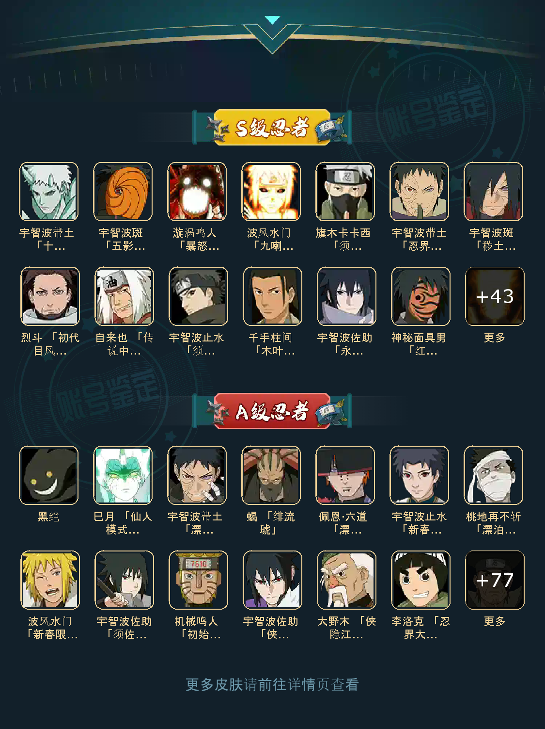 仙人自来也 纲手 波风水门 百战水门 猿飞日斩 千手柱间 宇智波斑 宇智波鼬 舞之自来也 大蛇丸 百战大蛇 秽土四代 秽土三代 秽土长门 仙人兜 黄猿九喇嘛鸣人 紫狗永恒佐助 樱婊忍战樱 秽土鼬 普通自来也 百豪纲手 死门凯 二代扉间 秽土二代 秽土初代 秽土柱间 白面具 须佐卡卡西 小胡子鬼灯幻月 雷影 土影 无 佩恩 百战佩恩 青年柱间 创立初代 秽土斑 青年斑 解斑 须佐止水 虎皮 破面带土 红夜带土 罗砂 秽土三代风影 忍战雷影 三代雷影 金角银角 秽土半藏 忍战大野木 小土豆 天道超 大筒木桃式 大筒木金式 钢铁之躯凯 桀骜之刃阿斯玛 狂野之鲨鬼鲛 飞段 黑飞段 百豪樱 忍战李 大卡卡西 五代水影照美冥 宇智波鼬 仙鸣 九尾查克拉鸣人 鹰佐 奇拉比 青年艾 半蛇兜 晓蛇 新春鼬 面麻 须佐佐助 疾风咒印佐助 忍战宁次 忍战天天 最终章雏田 幻容卡卡西 神卡 忍战卡卡西 泳装卡卡西 忍战凯 青春哥 惊门凯 爱情哥 新春止水 新春水门 青年水门 青水 新春我爱罗 泳装照美冥 侠隐照美冥 侠隐纲手 侠隐兜 漂泊再不斩 漂泊佩恩 漂泊二代 漂泊小南 漂泊佩恩 三船 青年三船 青年长门 泳装南 新春南 黑绝 新春大蛇丸 晓创生角度 晓创生蝎 晓创生飞段 泳装鼬 鲛肌融合鬼鲛 新春迪达拉 秽土迪达拉 恶灵之影飞段 暴怒带土 忍战黄土 卑留呼 桃博 黑土