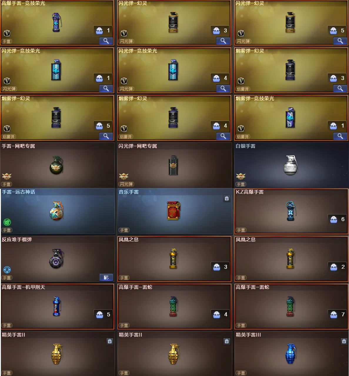 投掷套装及手雷:竞技荣光套、幻灵套、音乐手雷、凤凰之息X2、迷你生化手雷