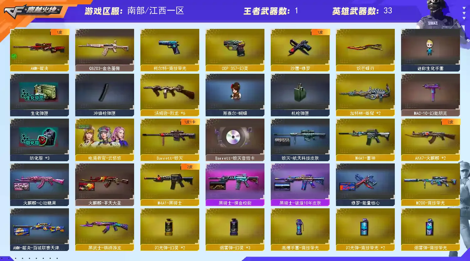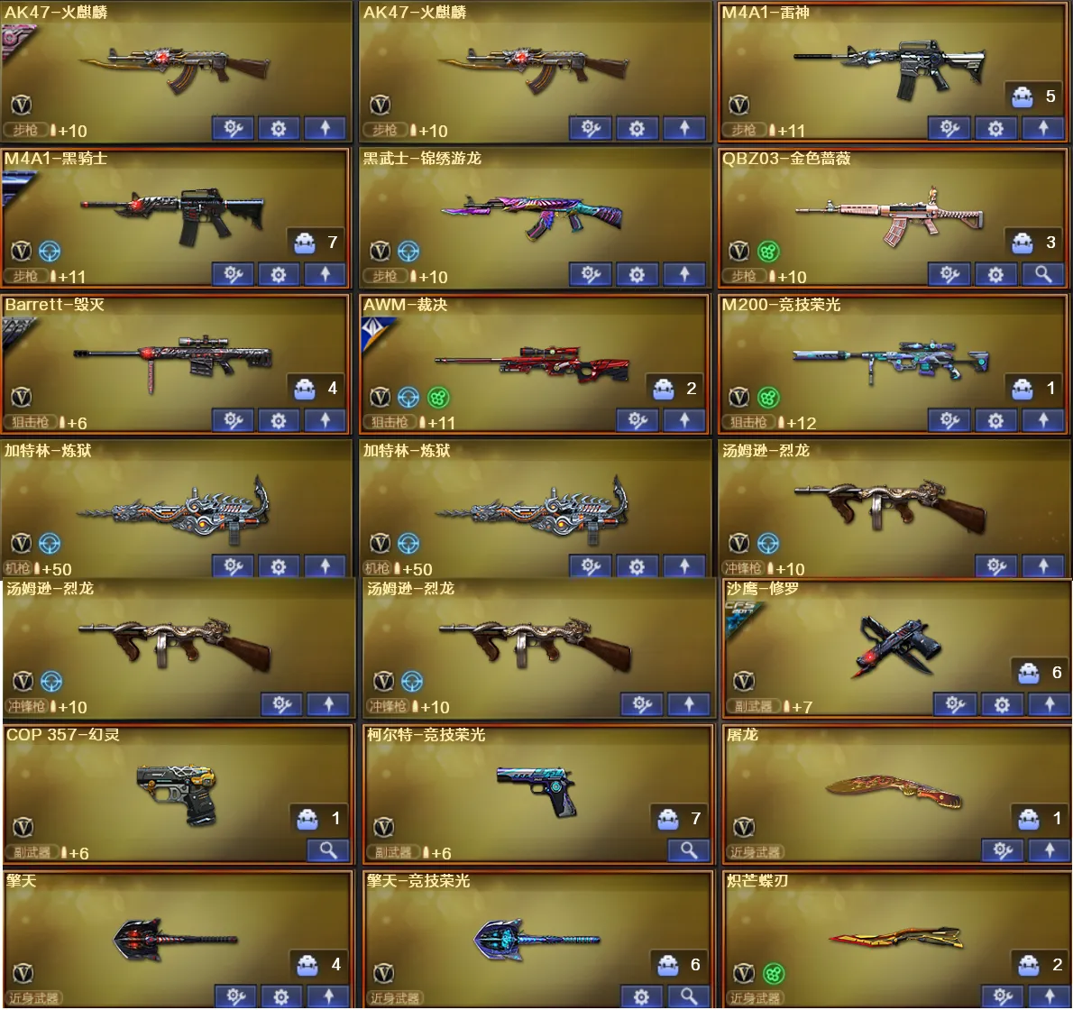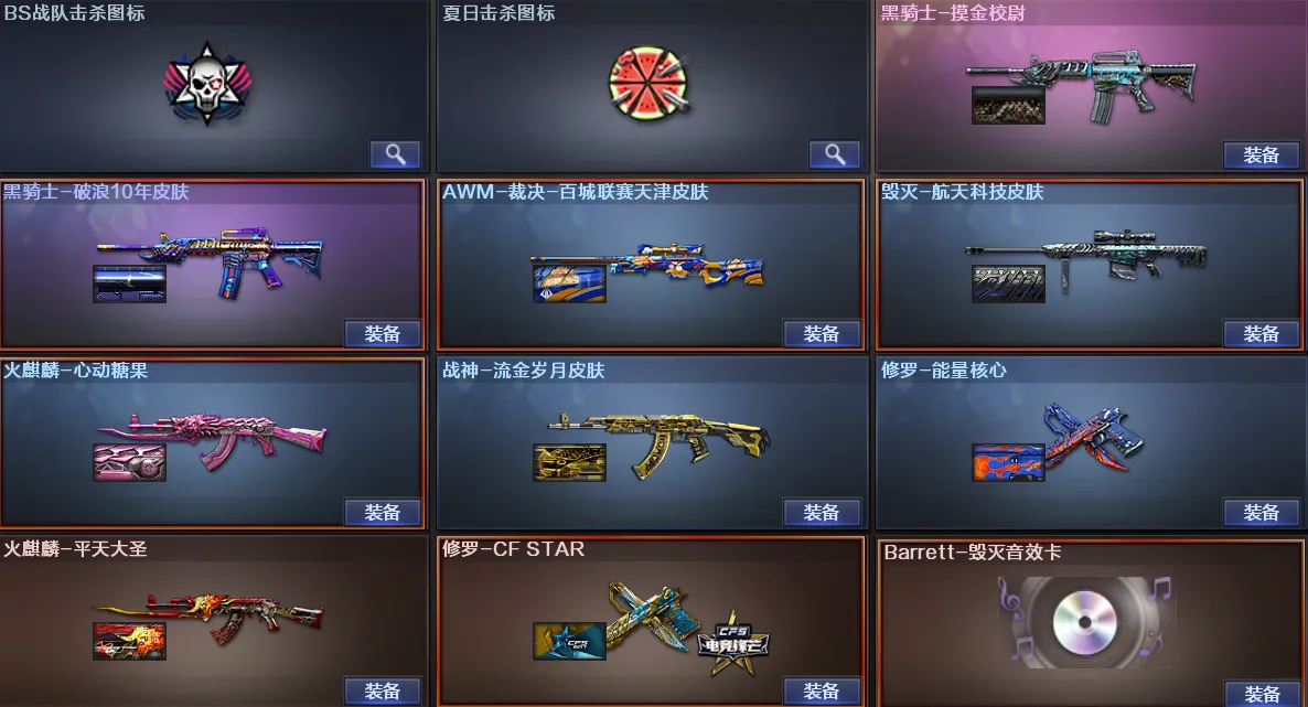 稀有武器:火麒麟X3、黑骑士、黑武士锦绣游龙、雷神、QBZ金色蔷薇、毁灭、裁决、M200竞技荣光、炼狱X2、烈龙X6、修罗、COP幻灵、柯尔特竞技荣光、屠龙、擎天、擎天竞技荣光、炽芒碟刃