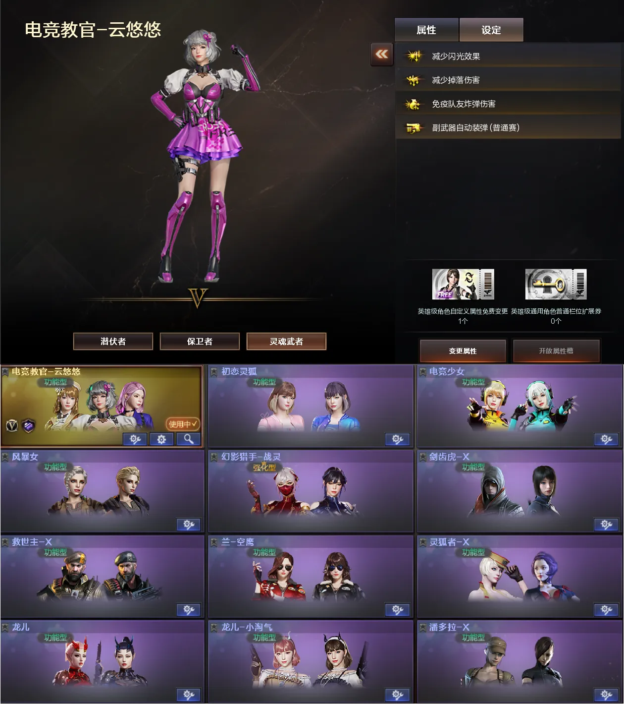 稀有角色:电竞教官云悠悠(四防免疫队友炸弹伤害/减少掉落伤害/减少闪光效果/副武器自动装弹)、幻影猎手战灵、电竞少女、风暴女