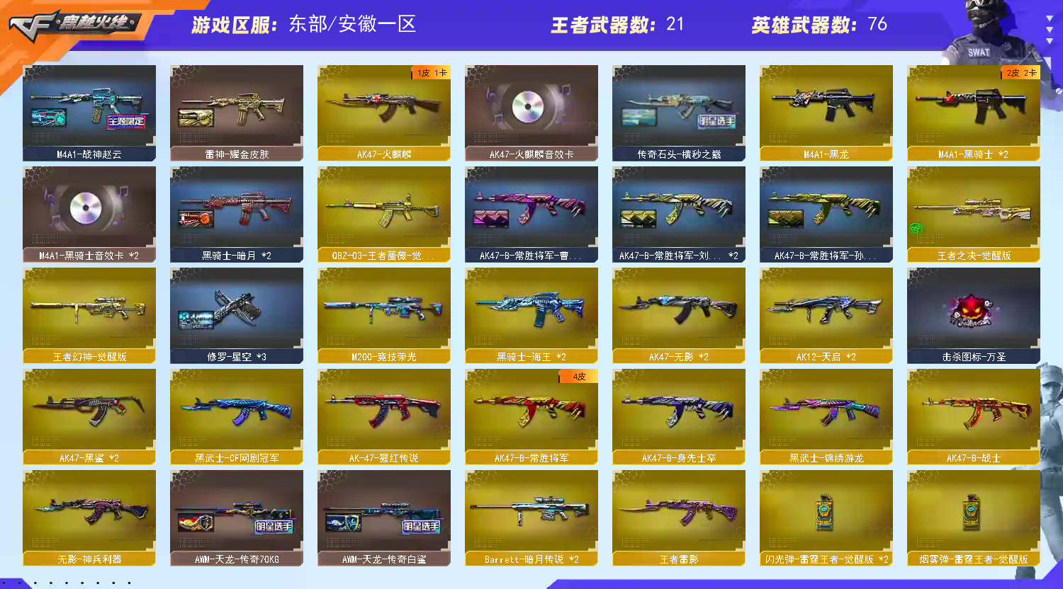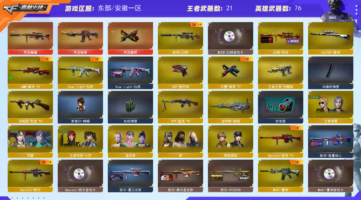 【传说幽瞳+传说幽冥】 【m200-幻神+音效卡+幻神-丹凤】 【竞技荣光套】 【98k星神】 【王者幻神】 【传说暗裔】 【scar白虎】 【生化 6盘龙 炼狱 6烈龙 蝴蝶】 【裁决】 【毁灭+音效卡】 【极光】 【火麒麟+音效卡+火麒麟-横秒之巅】 【黑龙】 【雷神+音效卡】 【黑骑士+音效卡+白马银呛】 【王者之心 王者之魄 王者冰魄】 【11手呛 修罗*7 cop堕天神 王者之灵】 【17近战 屠龙*2 龙啸 擎天*5 麒麟刺 斩神刀雷暴 幻灵之锋 王者之锋 王者之啸 王者之击 王者之刺】 【四防 王者玲珑小乔 职业经理】