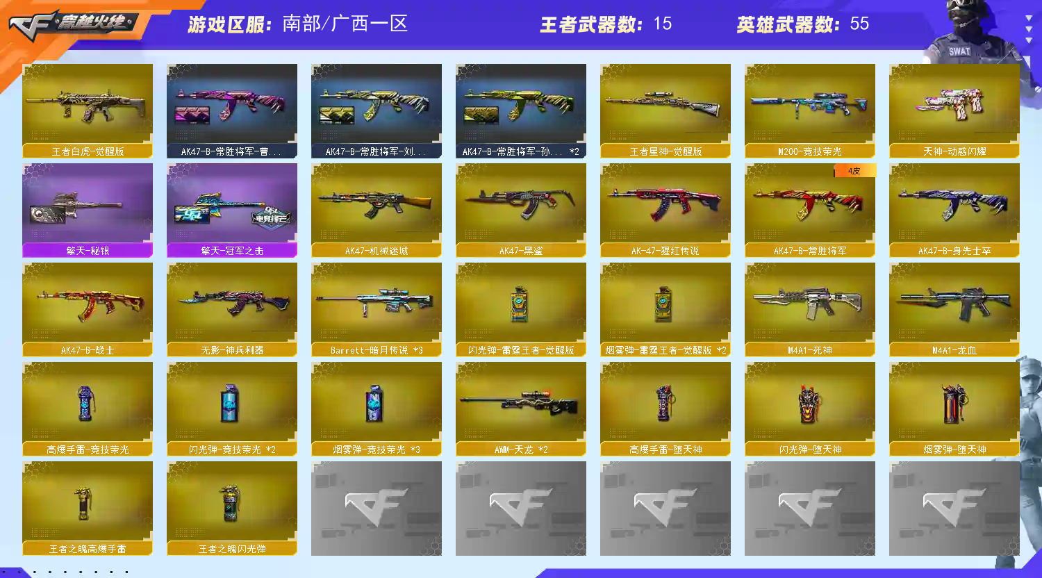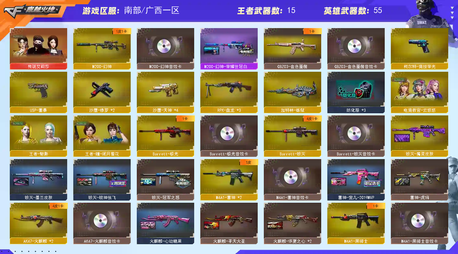 【亮点解析 传说角色 幻神三件套 】【四防传说艾莉莎 】【m200幻神+音效卡+荣耀世冠白鲨】【m200竞技荣光+usp雷暴+四防云悠悠】【王者星神】【王者白虎】【qbz金色蔷薇+卡】【火麒麟+卡】【雷神+卡+宠儿】【黑骑士+卡】【毁灭+卡+冠军之怒】【极光+卡】 【武器:天龙 盘龙*3 炼狱 】 【8手呛:修罗*2 天神*4 雷暴 竞技荣光 】 【10刀具:屠龙 擎天 麒麟刺 竞技荣光 王者之锋 王者之啸 王者之击*2】 【3雷套:堕天神雷 竞技荣光雷 雷霆王者雷】 【音效卡:毁灭音效卡 极光音效卡 幻神音效卡 金色蔷薇音效卡 火麒麟音效卡 黑骑士音效卡 白虎音效卡 雷神音效卡2 】 【四防角色:云悠悠 王者魅影 暗夜审判 职业经理】
