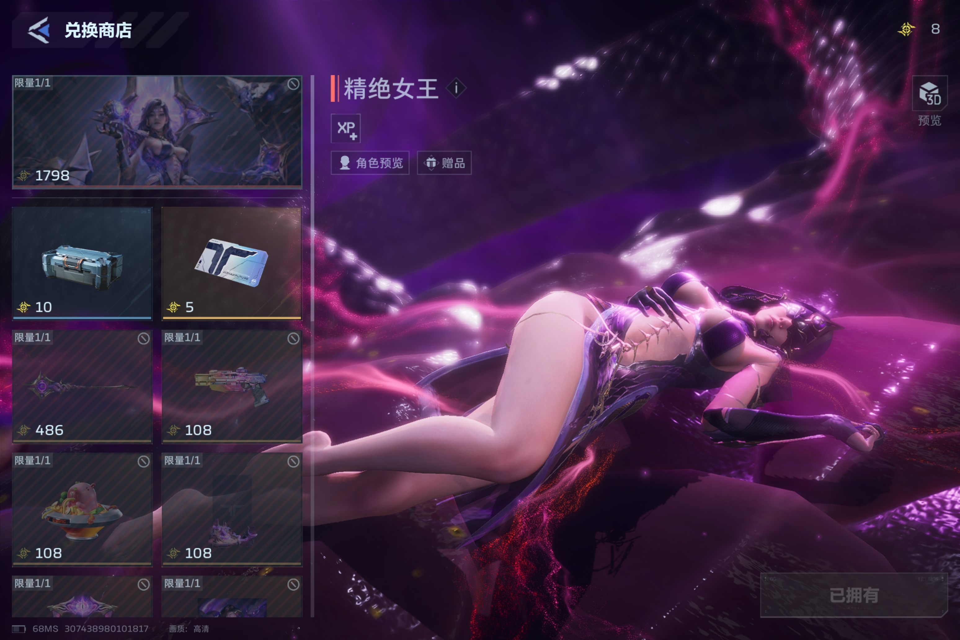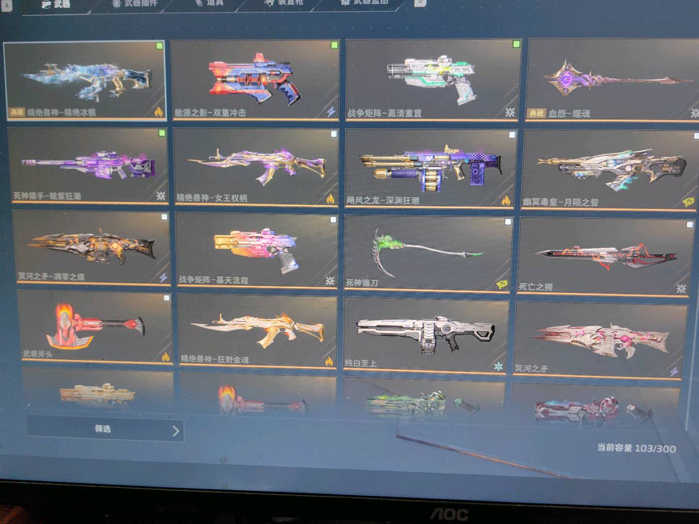 精绝女王全套 兽神典藏普通兽神2把 血冤典藏 死神猎手 能源之影 战争矩阵3把 毒皇 冥河之矛2把 斧头两把 镰刀死亡之拥 纯白 钢铁轰鸣 春雷震 鬼铜两把 全插件不够可以碎片合成 塔防全解锁 天启 天网 88 98 皮肤都有