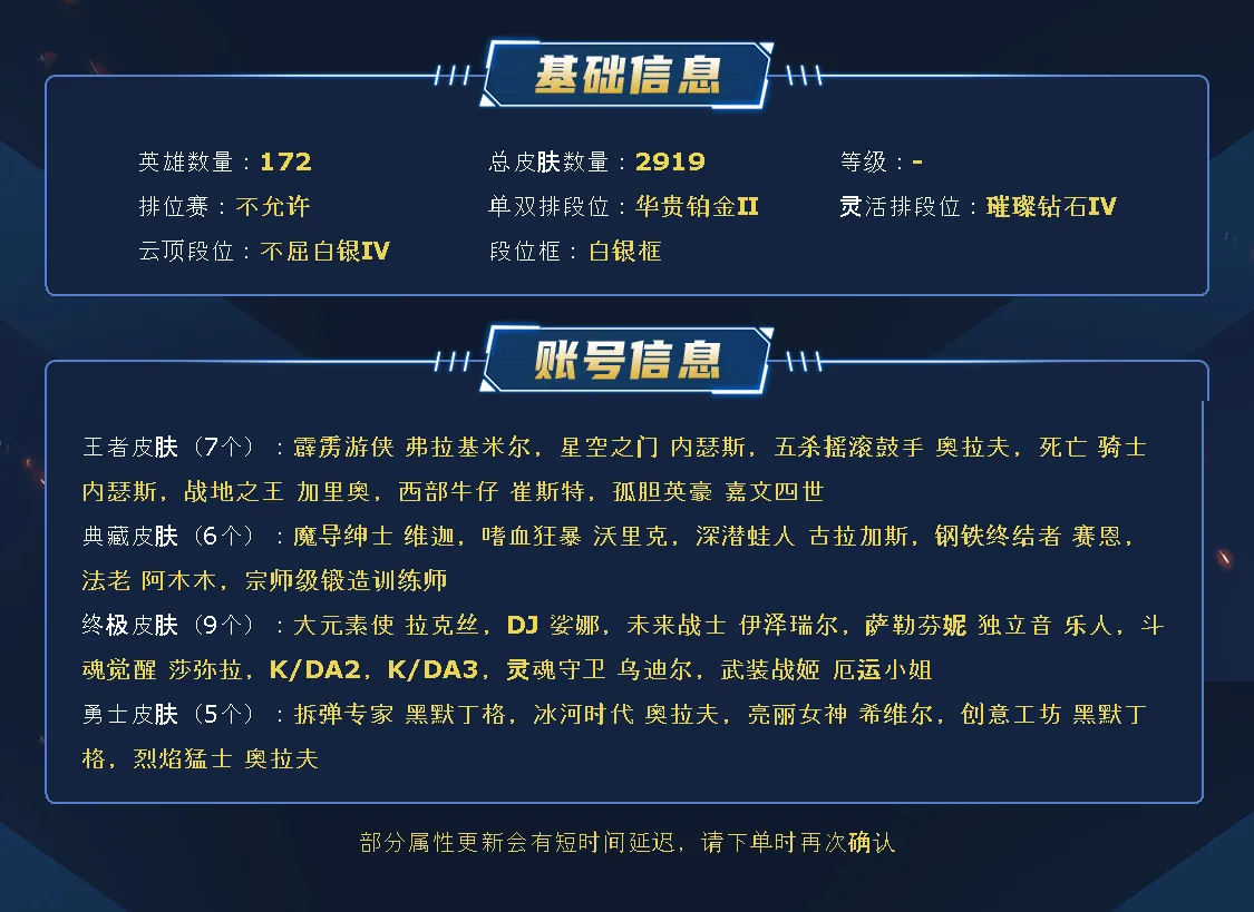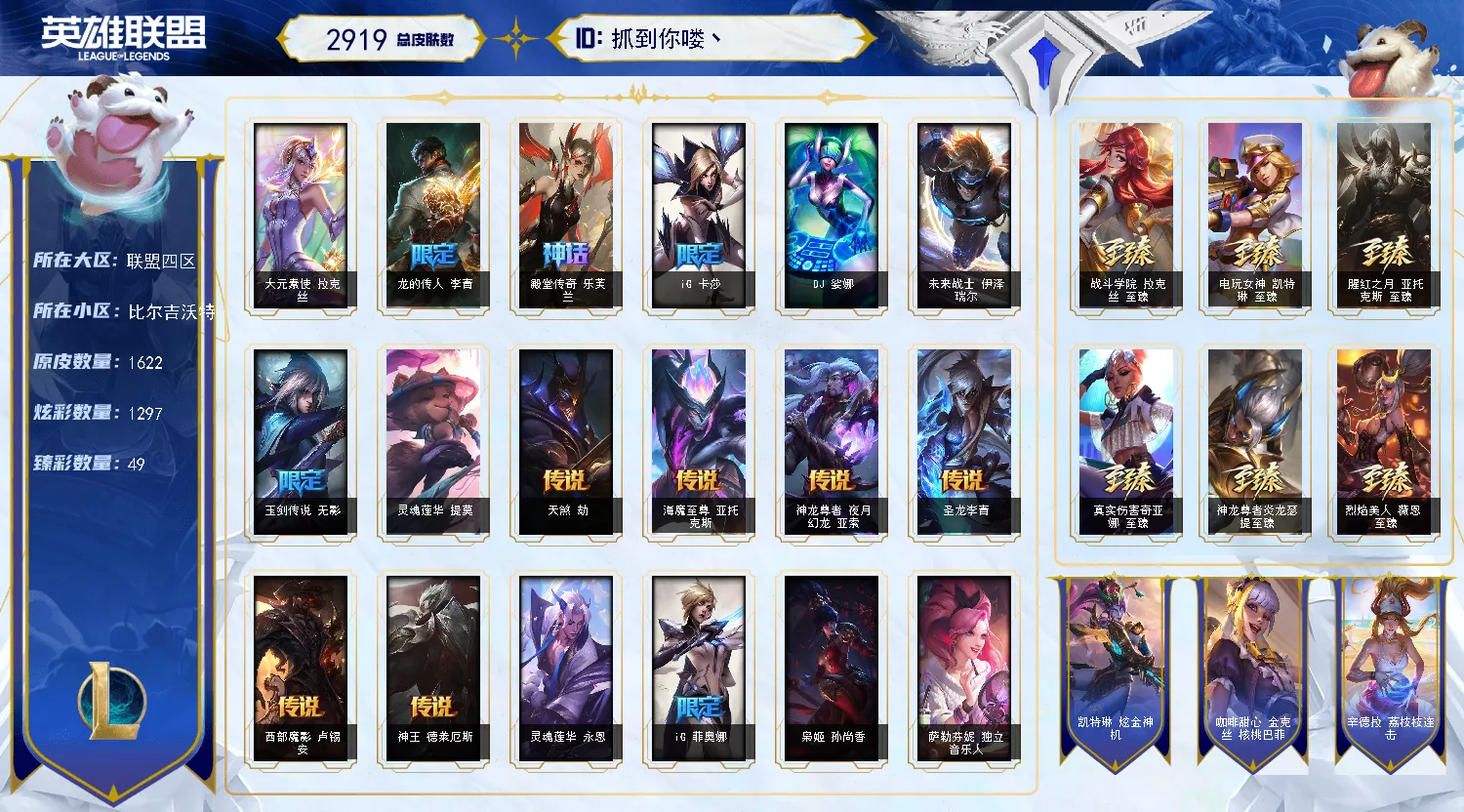 比尔吉沃特2900皮丨1615原皮丨1289炫彩丨294限定丨116神话丨48臻彩