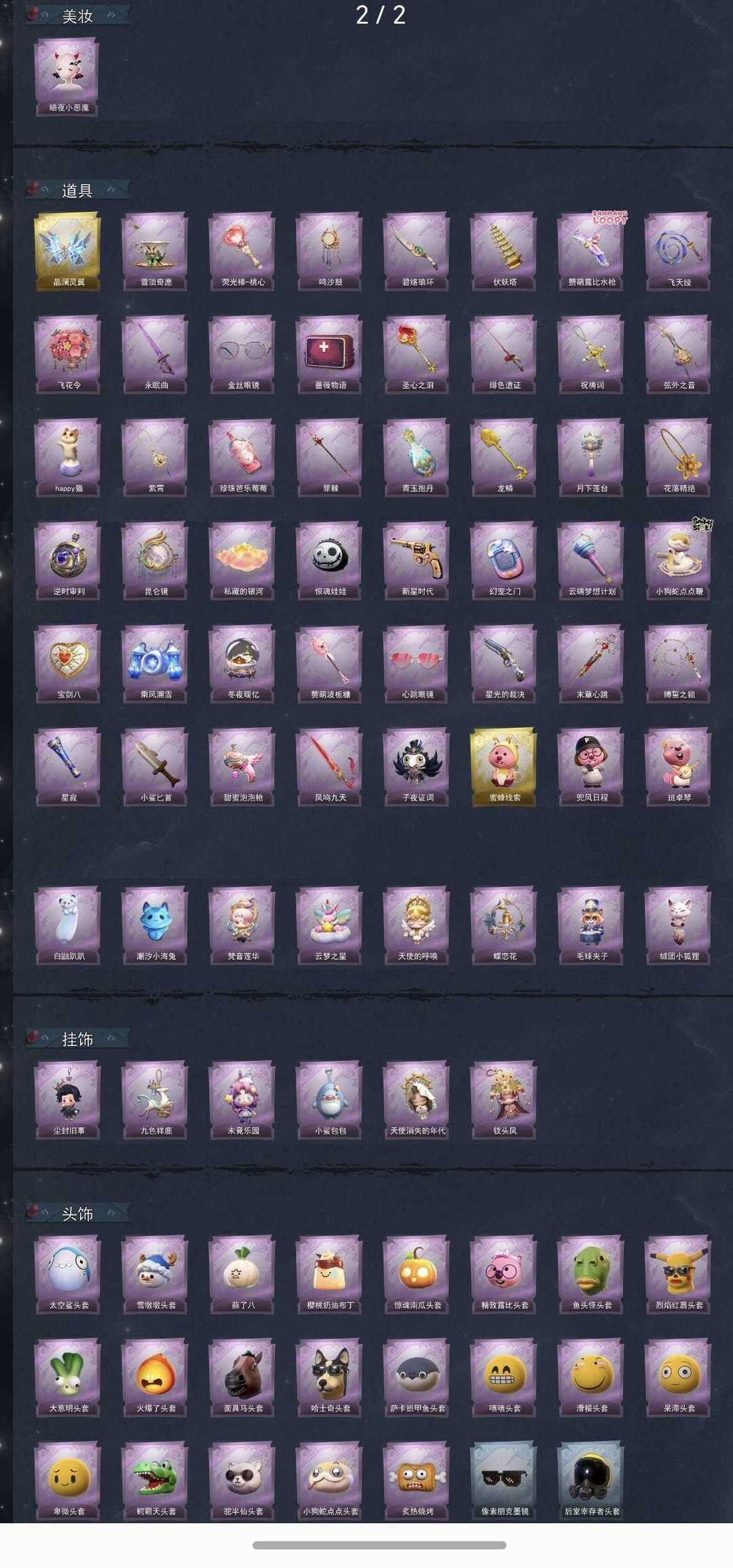 【幻梦皮肤】镜生遗梦【金色皮肤】渡鸦公爵莲华渡圣光之谕遗失的童话镜花辞【紫色皮肤】黎明猎手千夜星谕仙锋小姐甜梦派对绒绒对决莓果陷阱异色序曲迷途僵宝除妖小师妹黑月挽歌王子与骑士情公主水王子冰公主罗丽白光莹泽引山海灵昭鹿鸣瑞羽衔春霓裳踏雪青云逸歌素影瑶光丝缕哀歌绣春逍影呱呱雨衣【道具皮肤】晶澜灵翼雪顶奇愿鸣沙鼓碧络琅环伏妖塔赞萌露比水枪飞天绫飞花令永眠曲金丝眼镜蔷薇物语圣心之泪绯色遗证祝祷词弦外之音happy猫紫霄珍珠芭乐莓莓青玉抱丹龙鳞月下莲台花落精绝逆时审判昆仑镜私藏的银河惊魂娃娃新星时代幻宠之门云端梦想计划小狗蛇点点鞭宝剑八乘风溯雪冬夜暖忆赞萌波板糖心跳眼镜星光的裁决末章心跳缚誓之锁星寂小鲨匕首甜蜜泡泡枪凤鸣九天子夜证词蜜蜂线索兜风日程班卓琴白鼬趴趴潮汐小海兔梵音莲华云梦之星天使的呼唤蝶恋花毛球夹子【美妆】暗夜小恶魔【头饰】太空鲨头套雪墩墩头套蒜了八樱桃奶油布丁惊魂南瓜头套精致露比头套鱼头怪头套烈焰红唇头套大葱明头套火爆了头套面具马头套哈士奇头套萨卡班甲鱼头套嘻嘻头套滑稽头套呆滞头套卑微头套鳄霸天