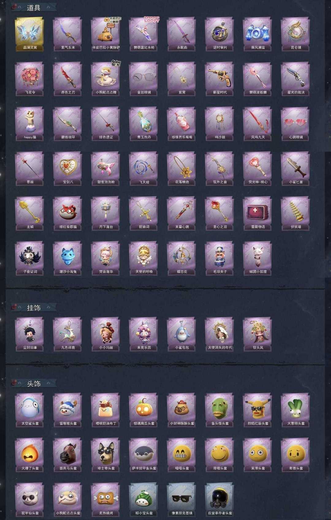 【道具皮肤】喷气背包-晶澜灵翼、刺刀-紫气东来、铲子-卡皮巴拉小黄豚铲、短管猎枪-赞萌露比水枪、桃木剑-永眠曲、传送按钮-逆时审判、喷气背包-乘风溯雪、传送按钮-昆仑镜、额外的背包-飞花令、刺刀-赤色之刃、长鞭-小狗蛇点点鞭、夜视仪-金丝眼镜、摸金符-紫霄、转轮手枪-新星时代、铲子-赞萌波板糖、短管猎枪-星光的裁决音响-happy猫、刺刀-碧络琅环、桃木剑-绯色遗证黄牛能量饮料-青玉抱丹、黄牛能量饮料-珍珠芭乐莓莓