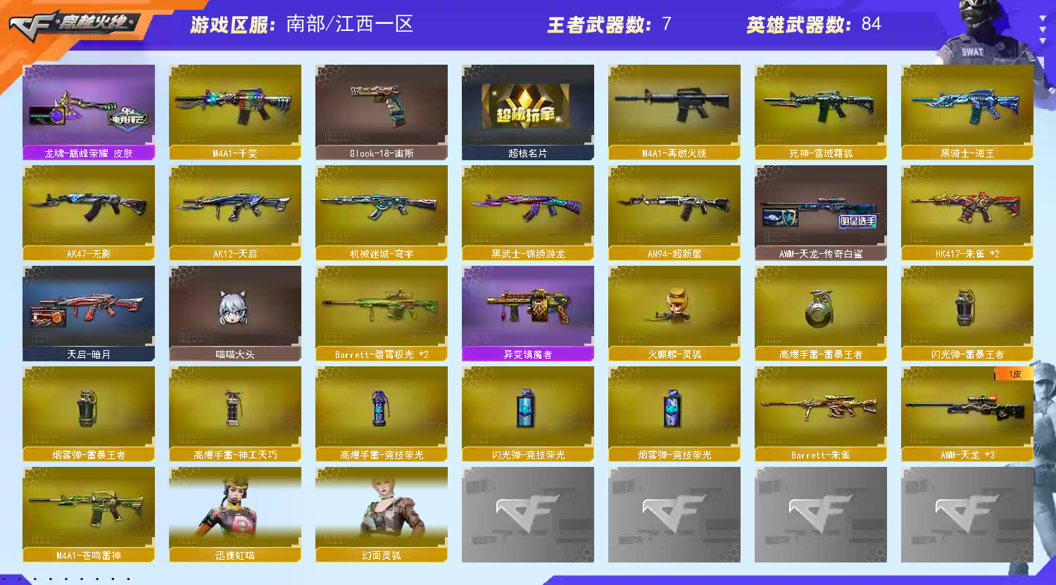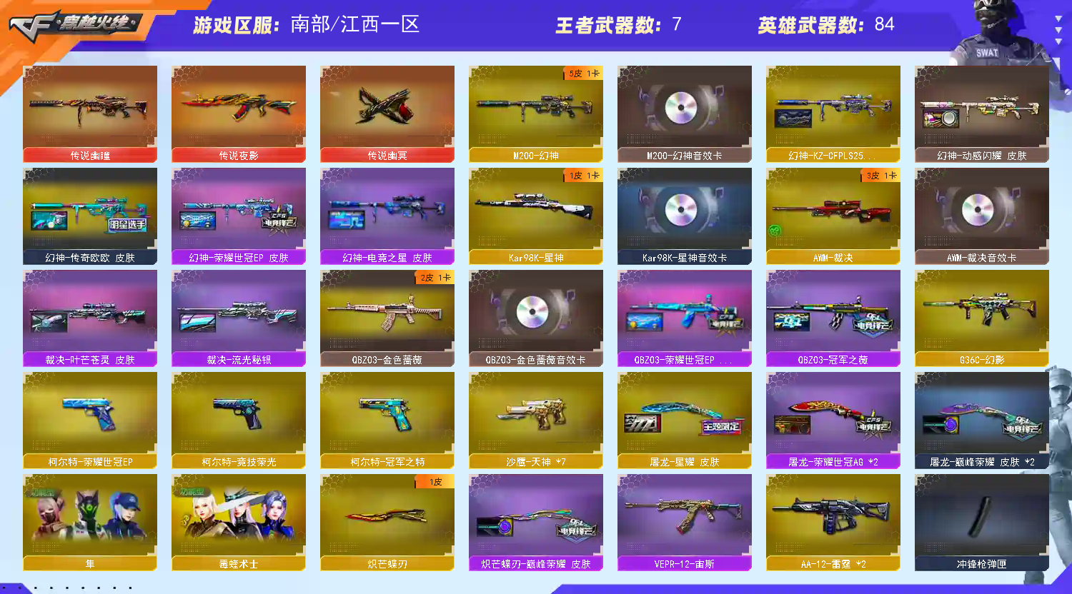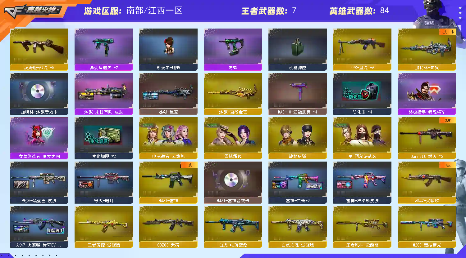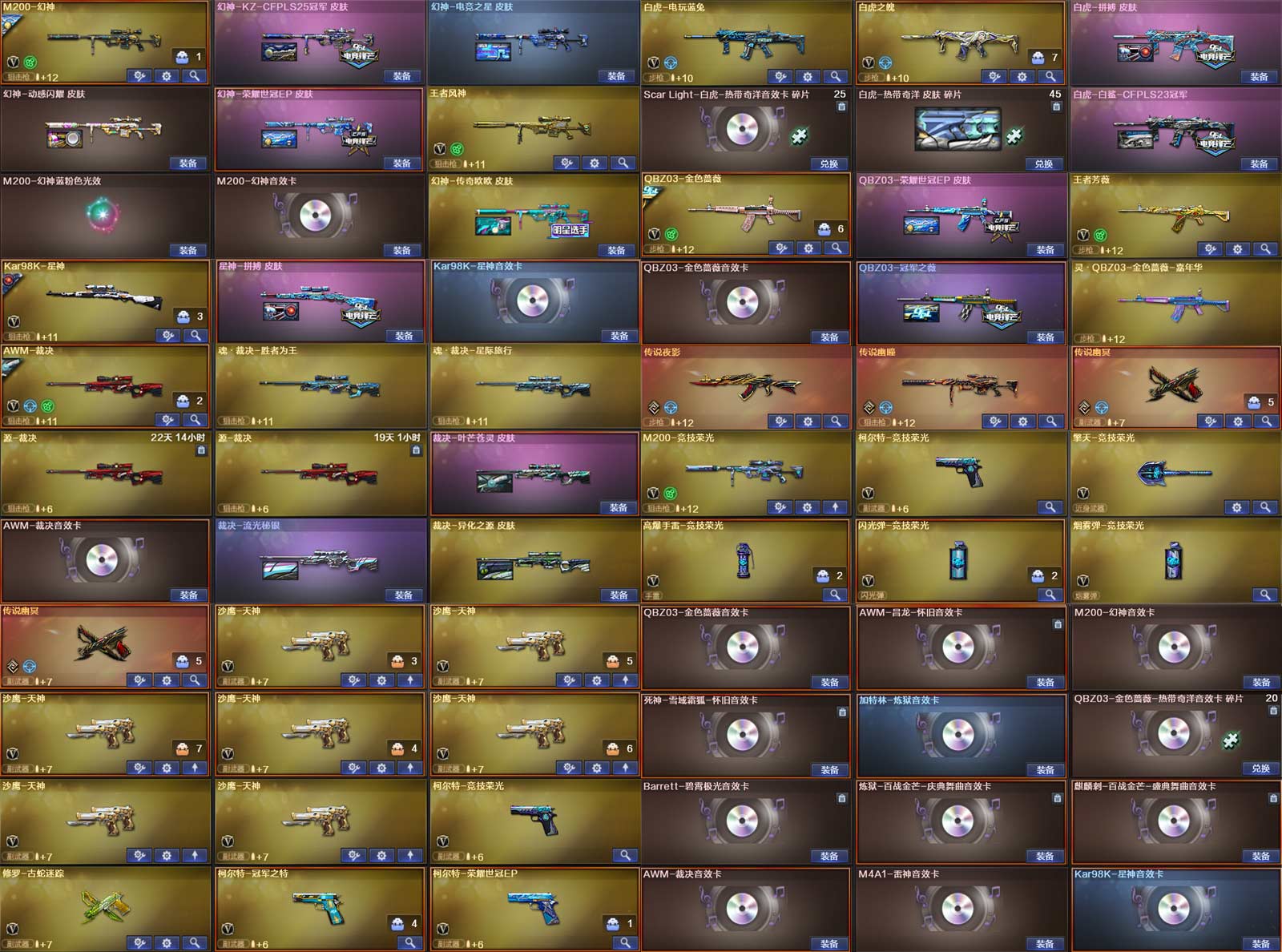 多四防角色,各种皮肤武器光效玩偶道具,欢迎来体验!武器太多,截不了那么多图!【此号全部装备太多截不了太多图,还有很多神器未截图,普通CF点武器也是一百多个就不截图了(满背包满道具爆破、生化、挑战武器应有尽有多个玩偶主流武器多光效),主流枪械都有皮肤】