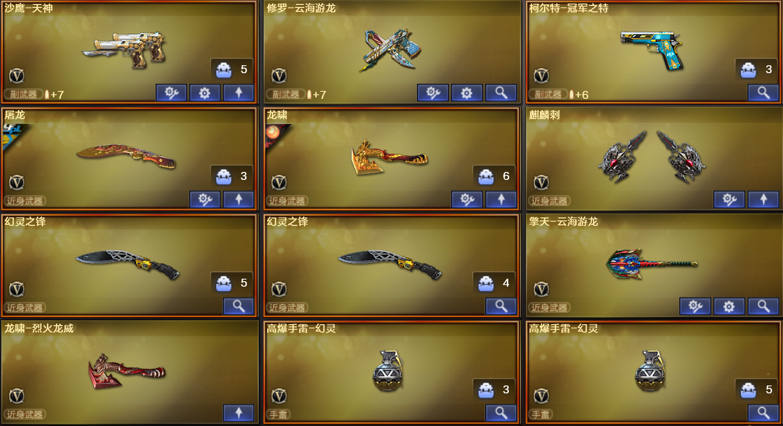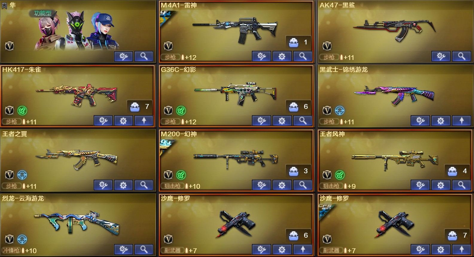 【英雄武器】_M200-幻神/M4A1-雷神/黑骑士-海王/HK417-朱雀/AK47-黑鲨/王者之翼-觉醒版/沙鹰-天神/沙鹰-修罗(2)/柯尔特-冠军之特/麒麟刺/龙啸/屠龙/幻灵之锋(2)/高爆手雷-幻灵(5)/烟雾弹-幻灵(2)/闪光弹-幻灵(3)/G36C-幻影/王者风神-觉醒版/烈龙-云海游龙/修罗-云海游龙/擎天-云海游龙/龙啸-烈火龙威/手雷-云海游龙